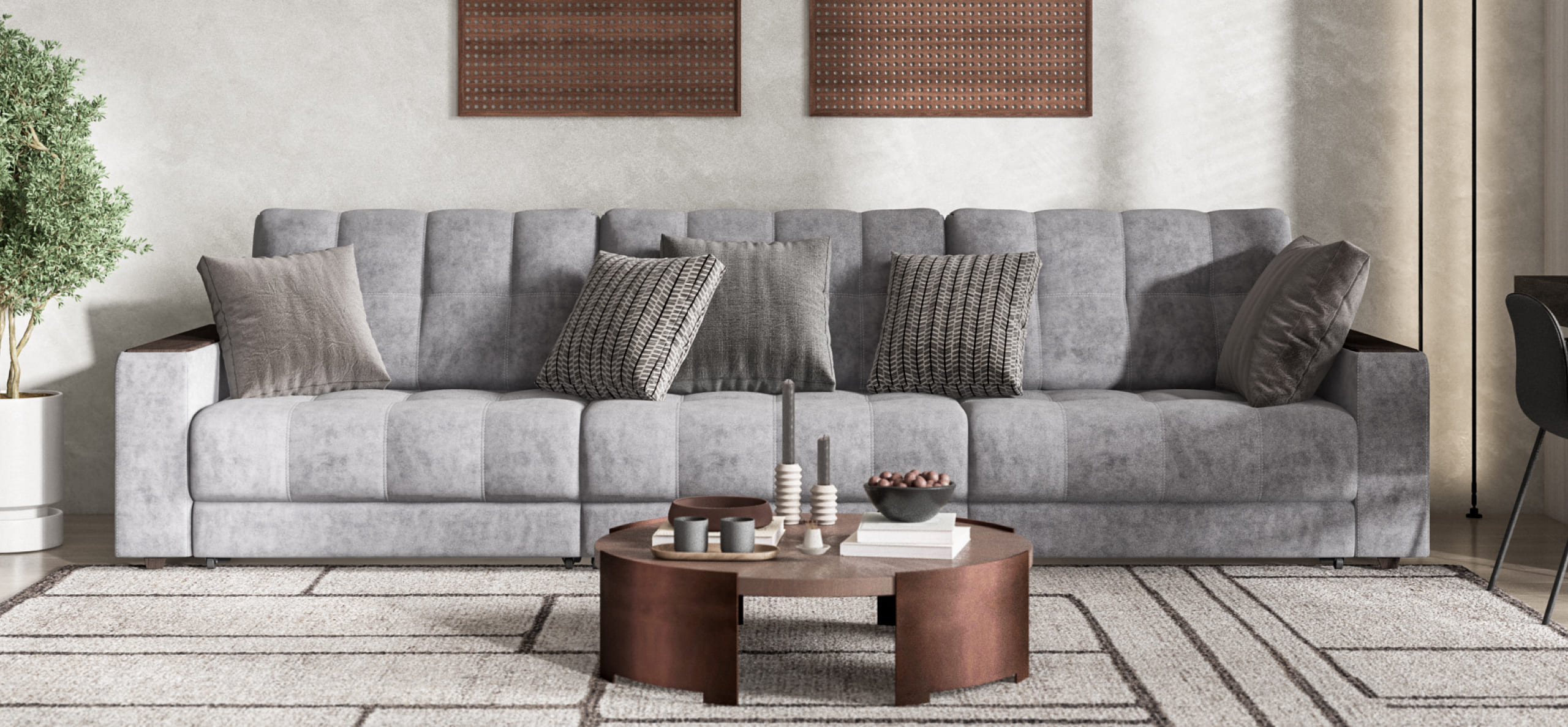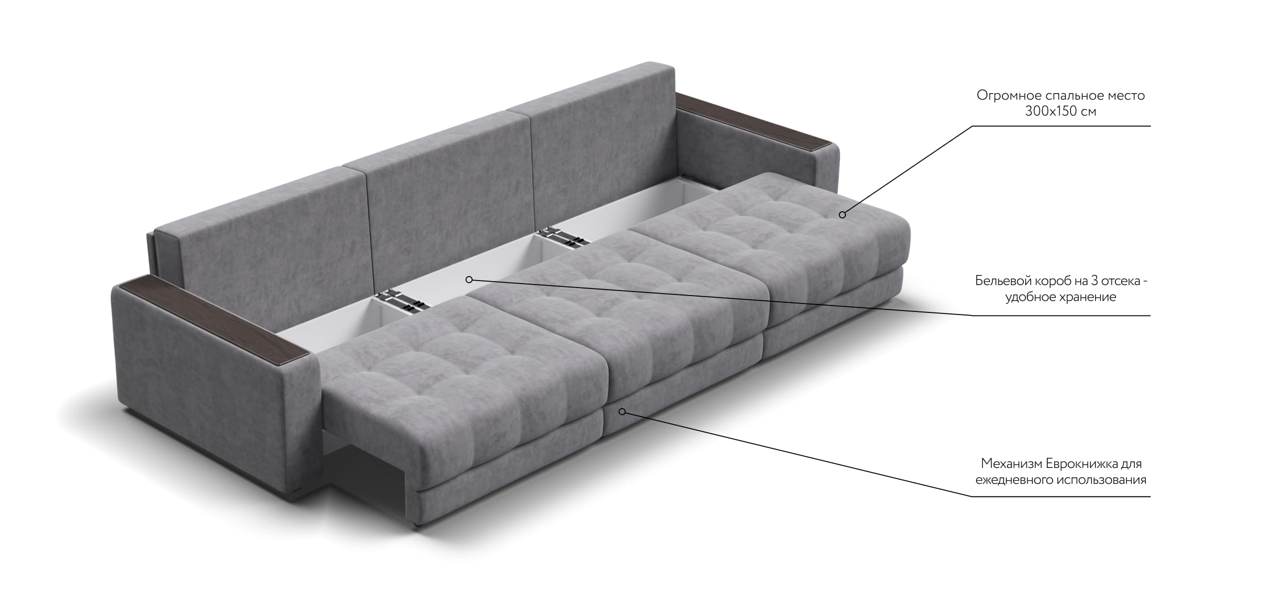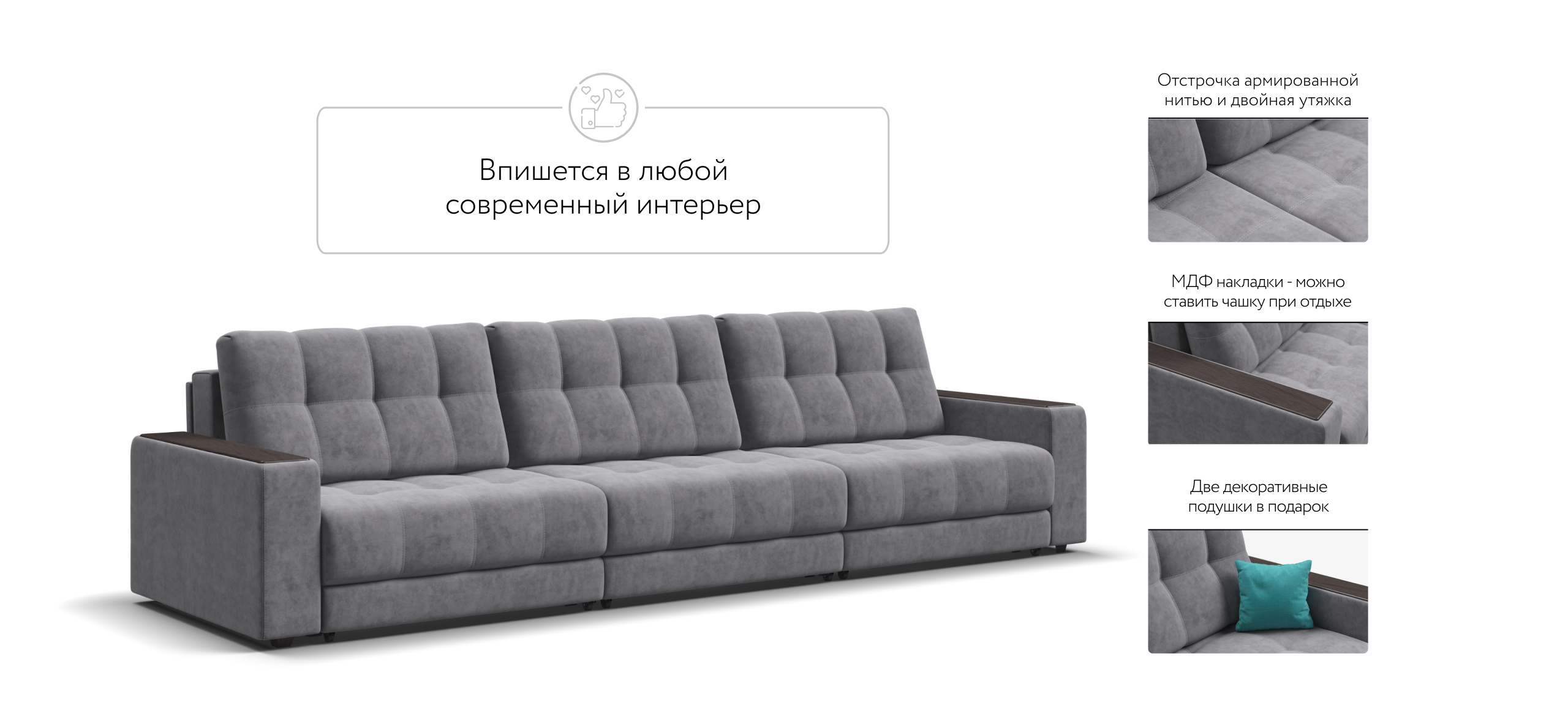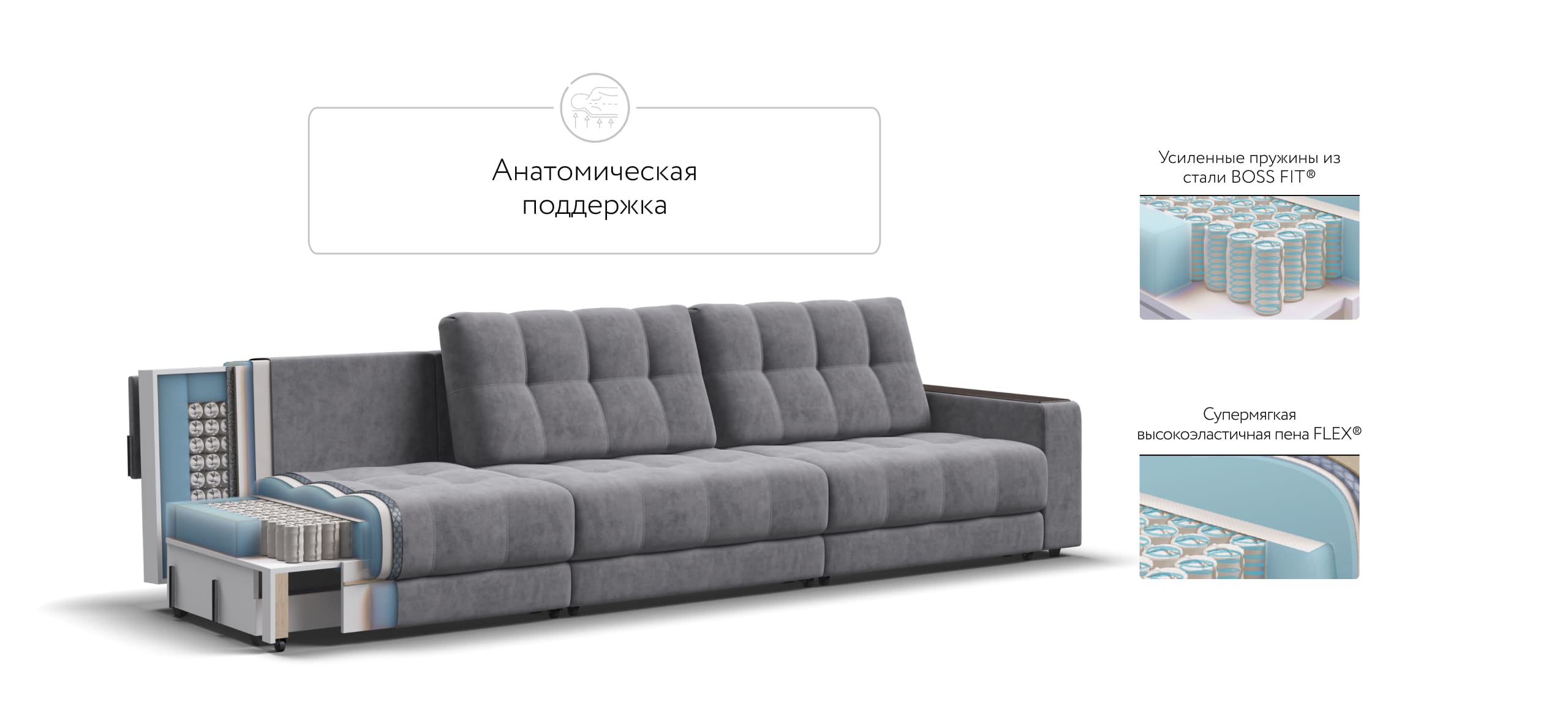Диван BOSS GRAND - большой, стильный и комфортный диван, предназначенный для просторной комнаты. Продуманный до мелочей диван BOSS сочетает в себе надежный каркас, мягкие ткани, многофункциональность и быструю сборку за 1 минуту без инструментов - ощутите комфорт у себя дома!