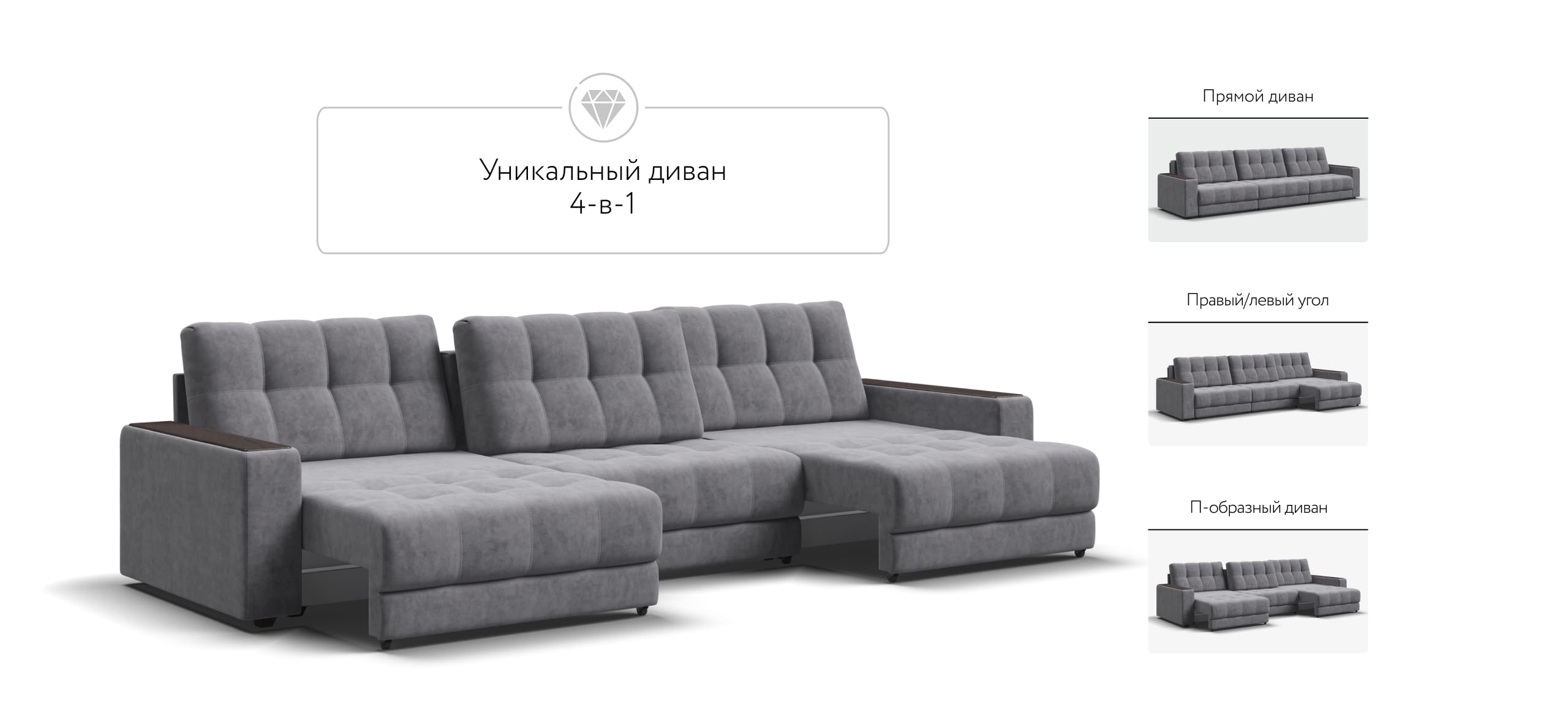 Каждое посадочное место выдвигается вперед и можно получить диван с правым или левым углом, а также получить П-образную форму дивана.