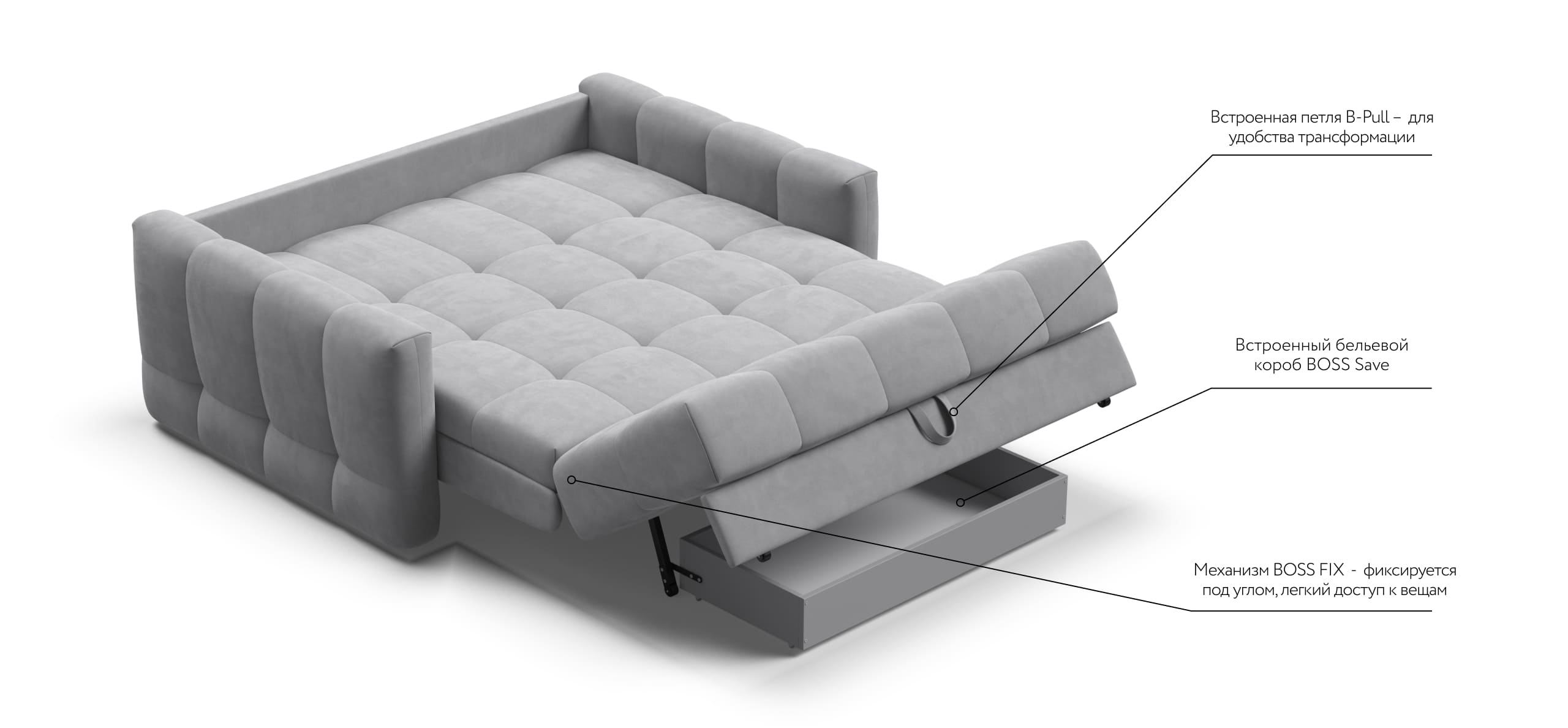 B-Pull – встроенная петля из основной ткани под посадочной частью, для удобства трансформации механизма, а также доступа к бельевому коробу