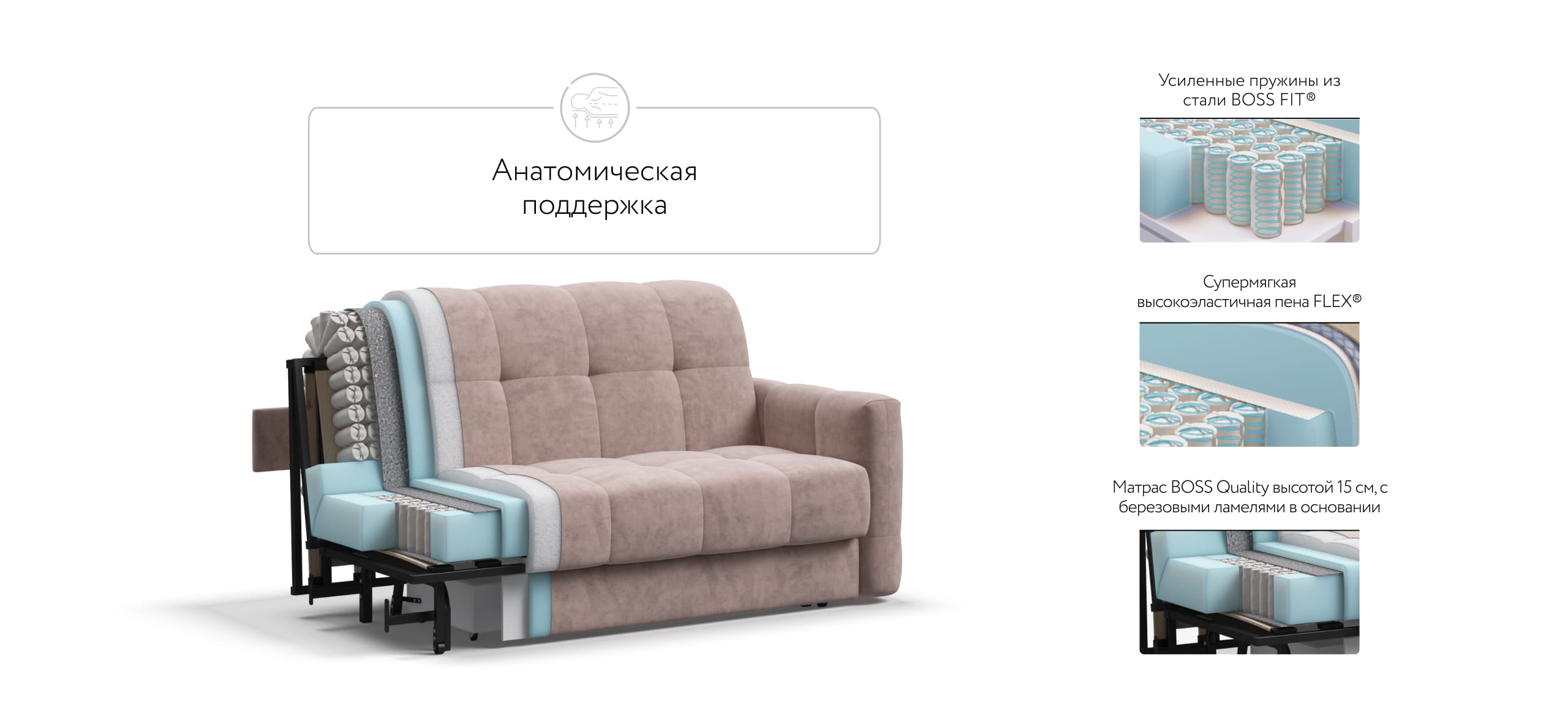 Инновационный анатомический матрас BOSS Quality в диване, высотой 15 см., выполнен из полноценного независимого пружинного блока BOSS FIT и высокоэластичной пены FLEX – гарантия здорового сна, как на кровати!