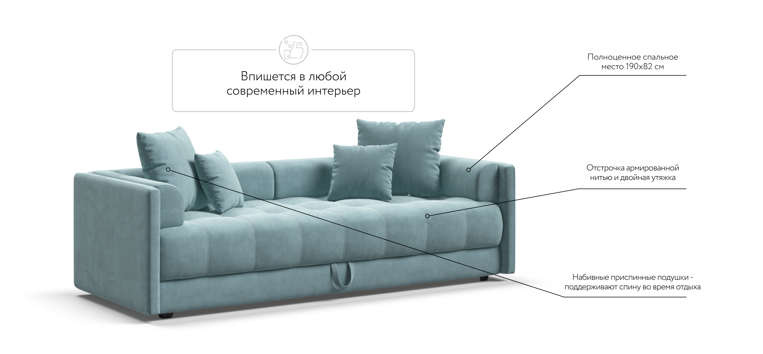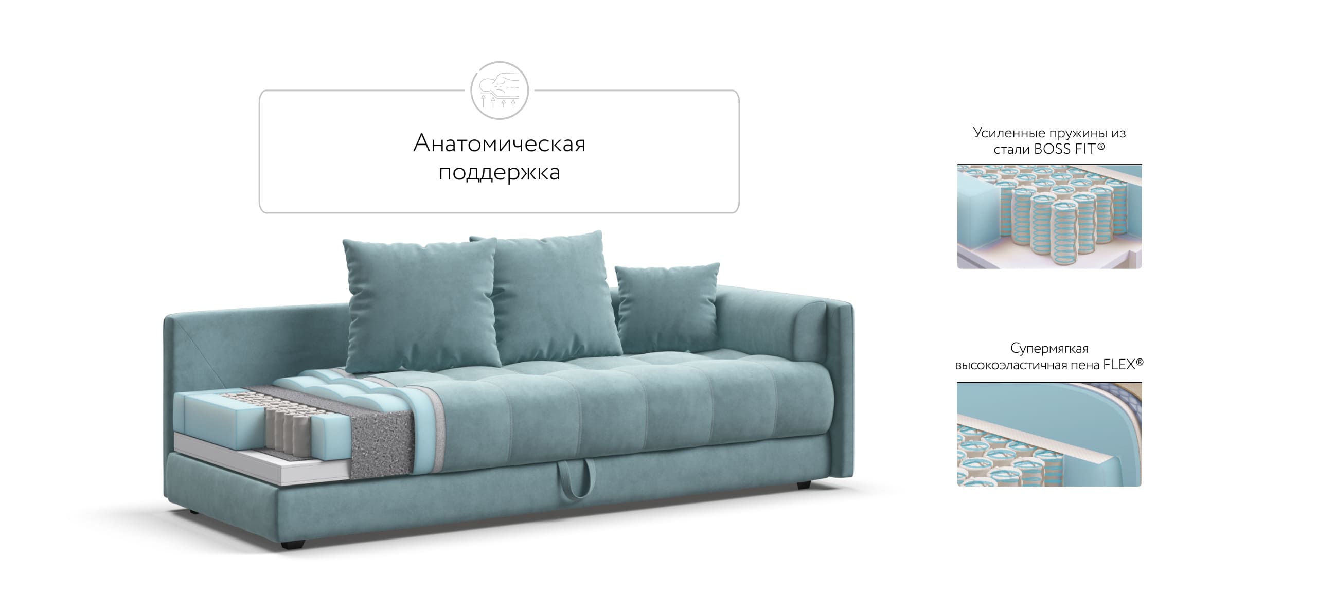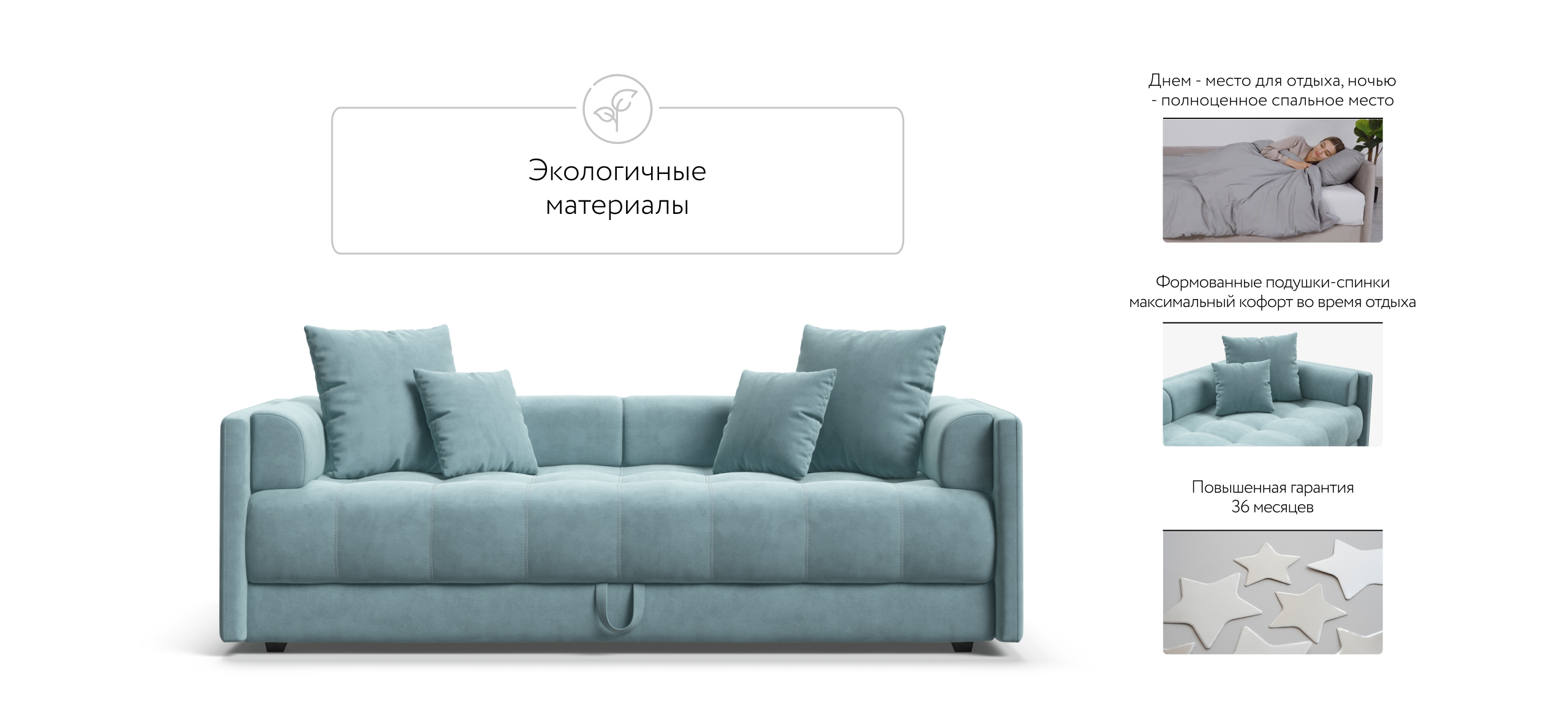 Тахта отлично сочетает в себе две функции: днем – уютное место для отдыха и работы в качестве дивана, а ночью полноценное спальное место. Формованные подушки-спинки помогут расслабиться во время отдыха, поддерживая голову в комфортном положении.