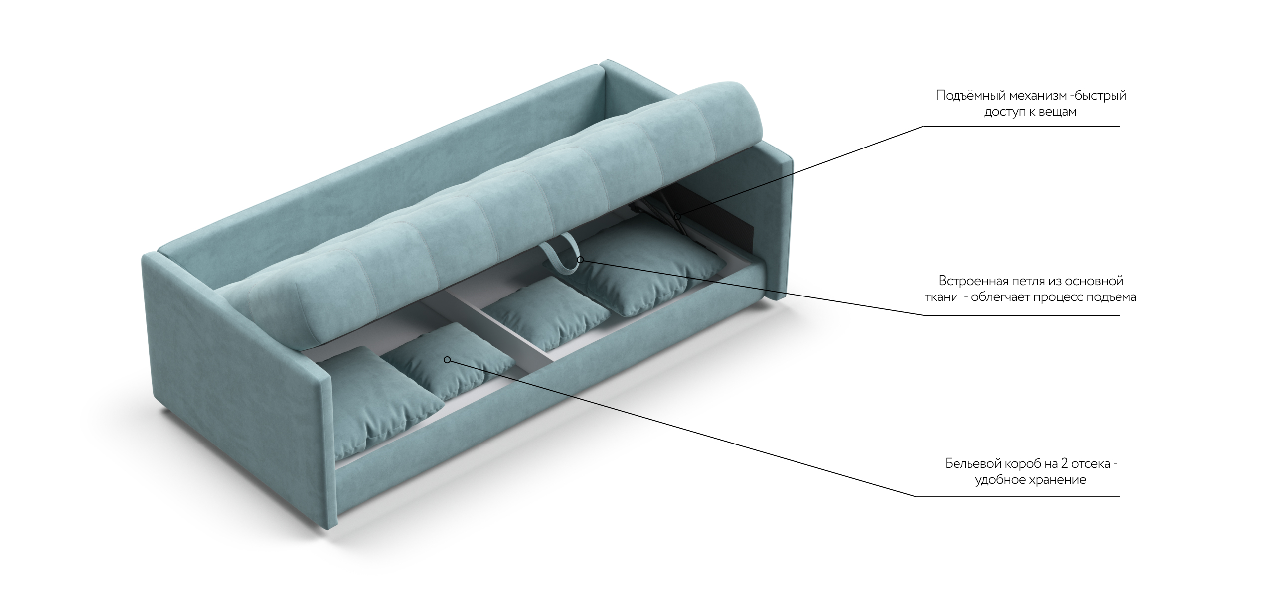 Вместительный бельевой короб в основании позволит Вам убрать на ночь приспинные подушки, а днем хранить постельные принадлежности.