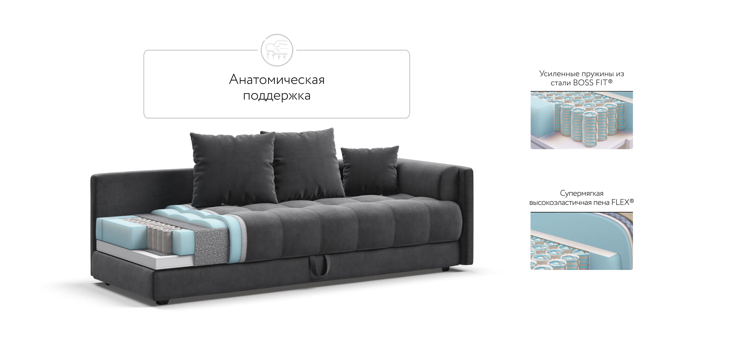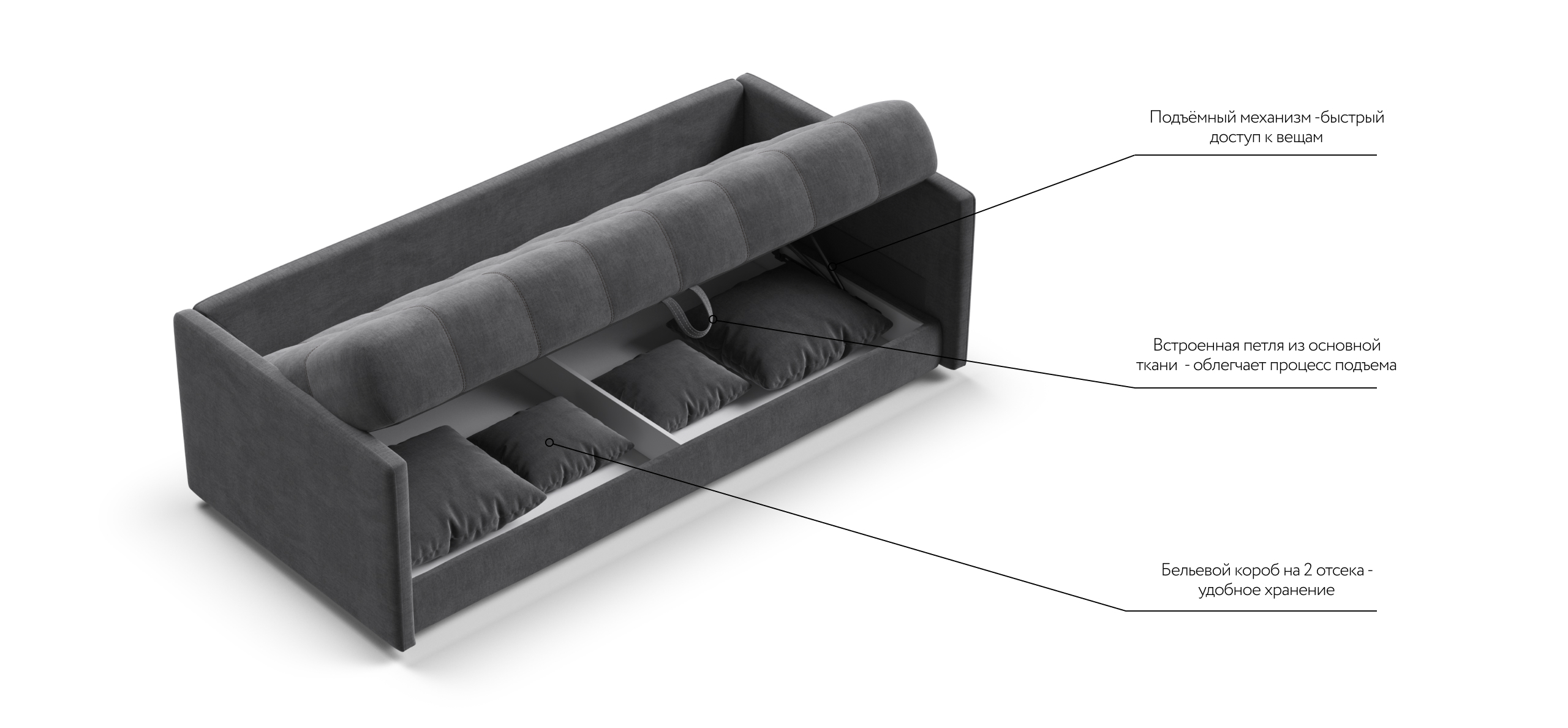 Вместительный бельевой короб в основании позволит Вам убрать на ночь приспинные подушки, а днем хранить постельные принадлежности.