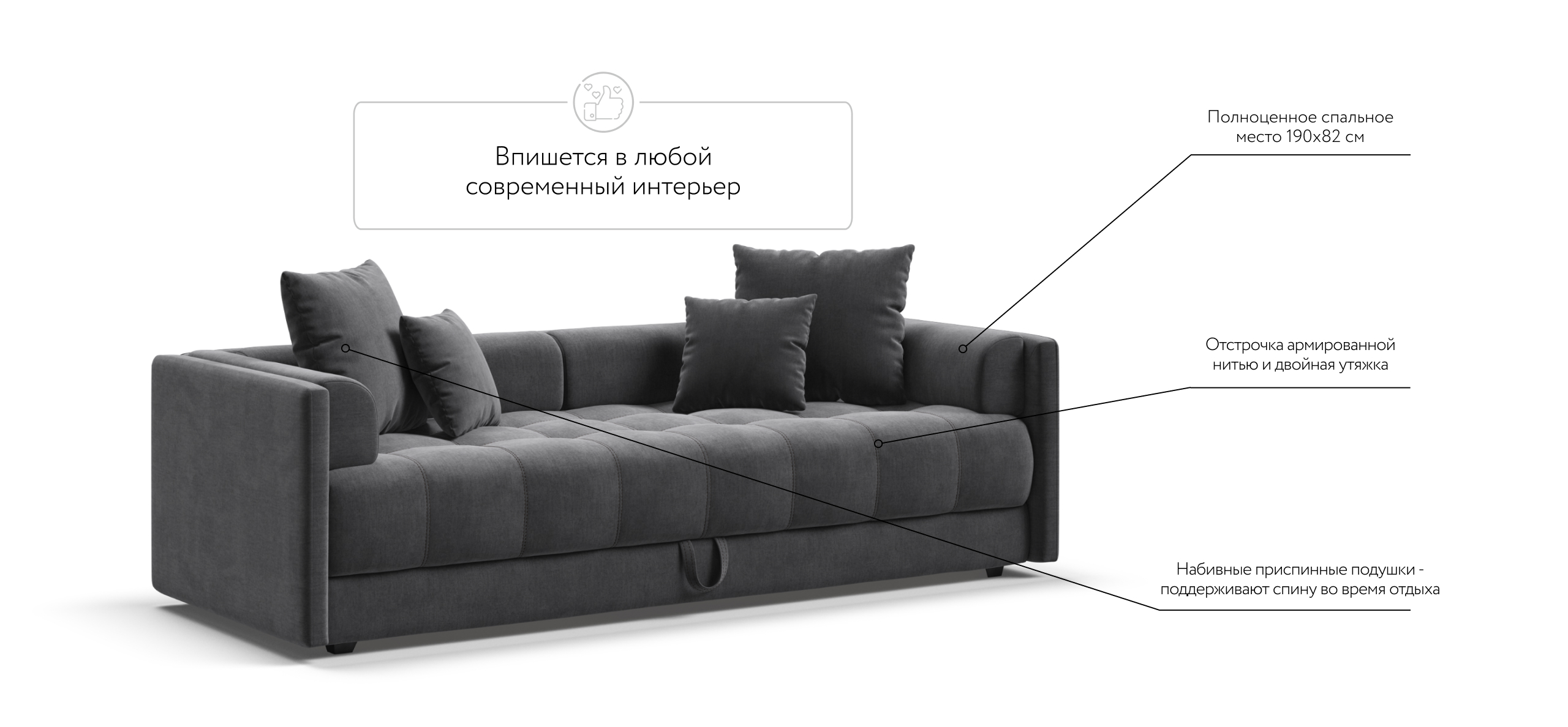 Тахта отлично сочетает в себе две функции: днем – уютное место для отдыха и работы в качестве дивана, а ночью полноценное спальное место. Формованные подушки-спинки помогут расслабиться во время отдыха, поддерживая голову в комфортном положении.
