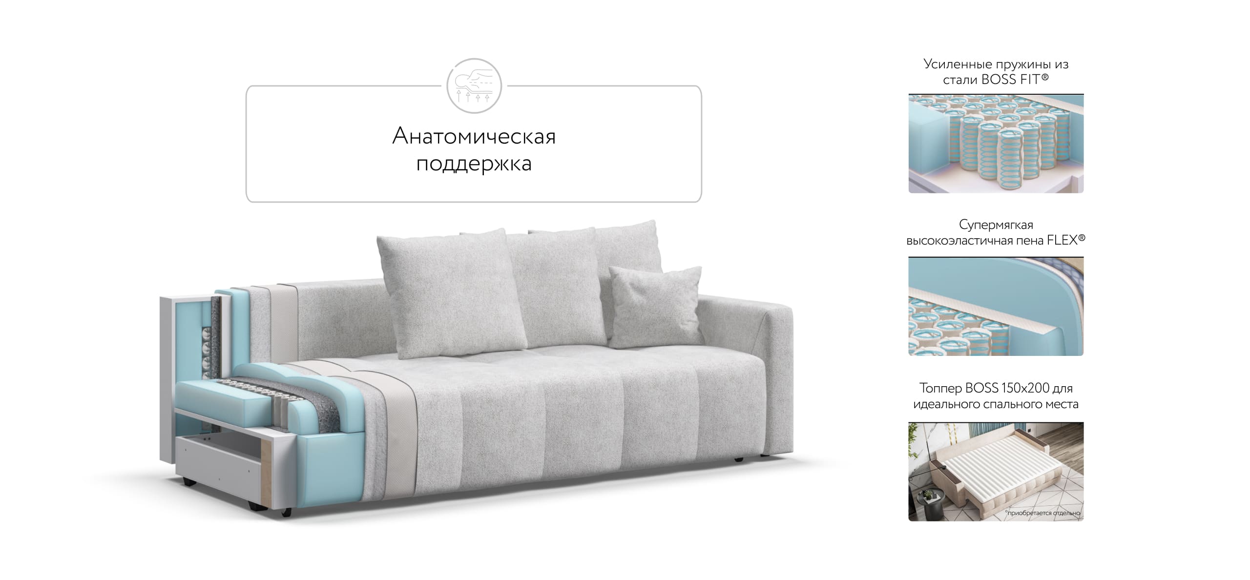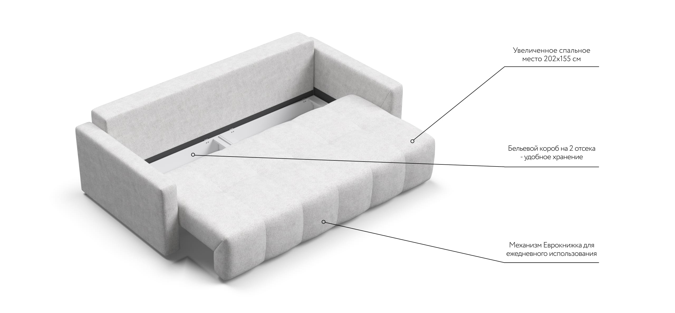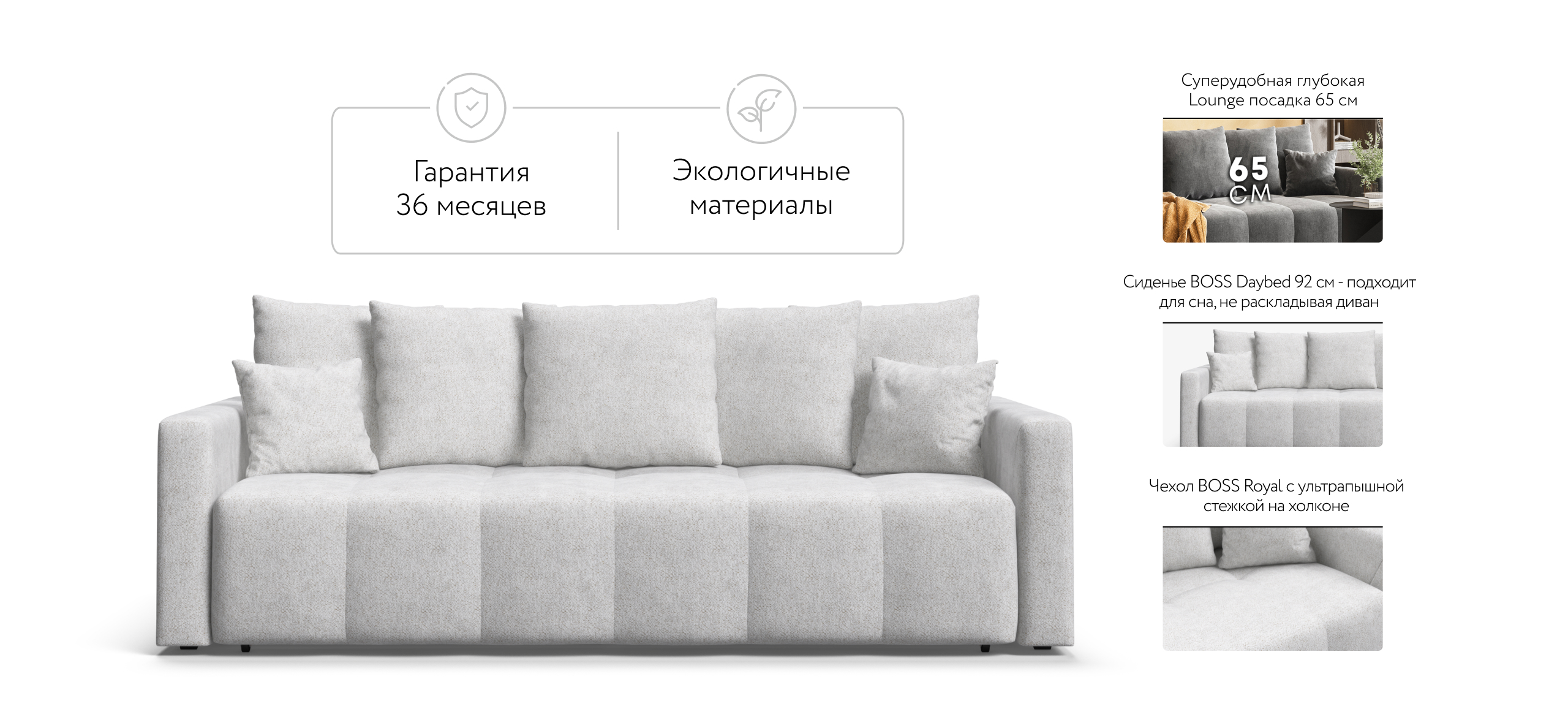 Сиденье BOSS Daybed глубиной 92 см идеально подходит для сна одного человека, даже без раскладывания дивана. Независимый пружинный блок в основании и механизм "еврокнижка" превращают диван в комфортное спальное место с анатомическим эффектом.