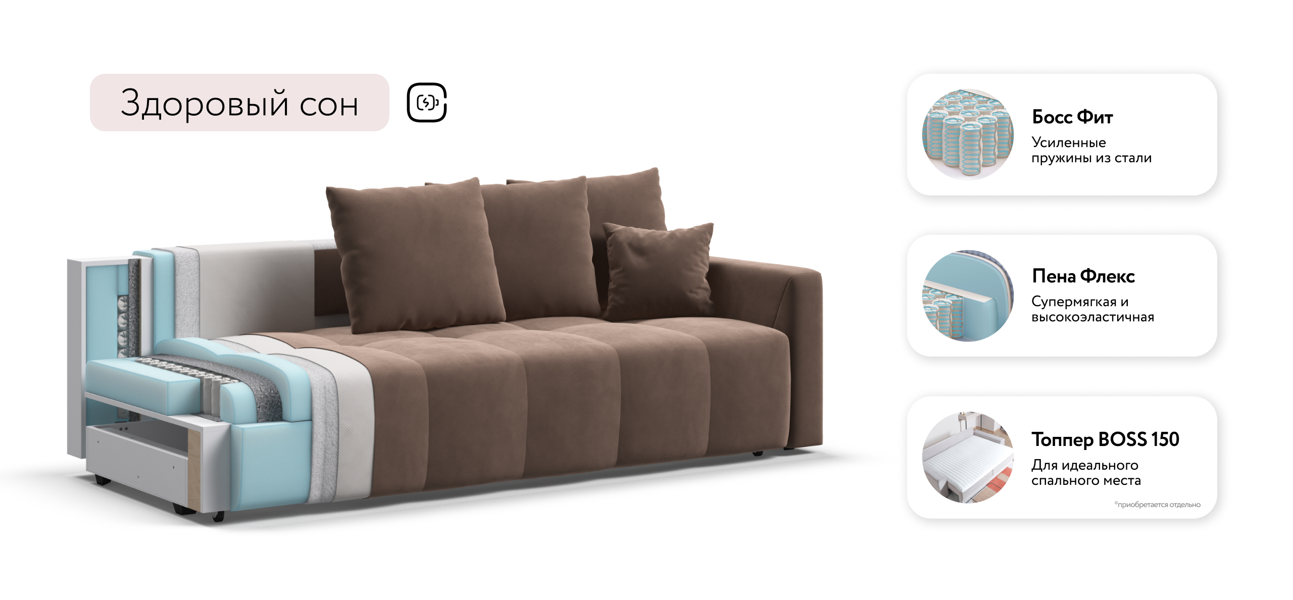 Сиденье BOSS Daybed глубиной 92 см идеально подходит для сна одного человека, даже без раскладывания дивана. Независимый пружинный блок в основании и механизм "еврокнижка" превращают диван в комфортное спальное место с анатомическим эффектом.