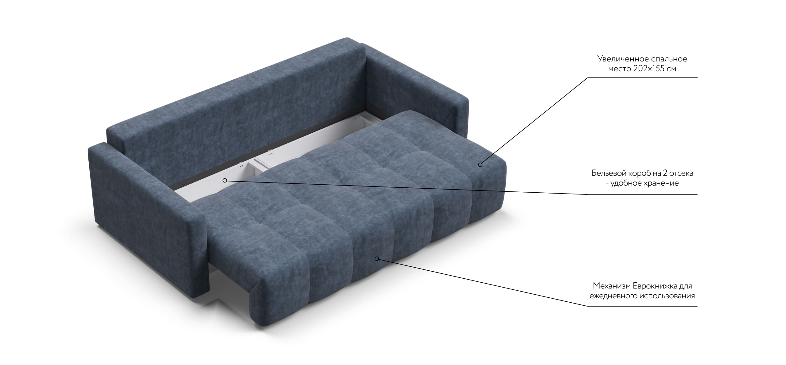 Сиденье BOSS Daybed глубиной 92 см идеально подходит для сна одного человека, даже без раскладывания дивана. Независимый пружинный блок в основании и механизм "еврокнижка" превращают диван в комфортное спальное место с анатомическим эффектом.