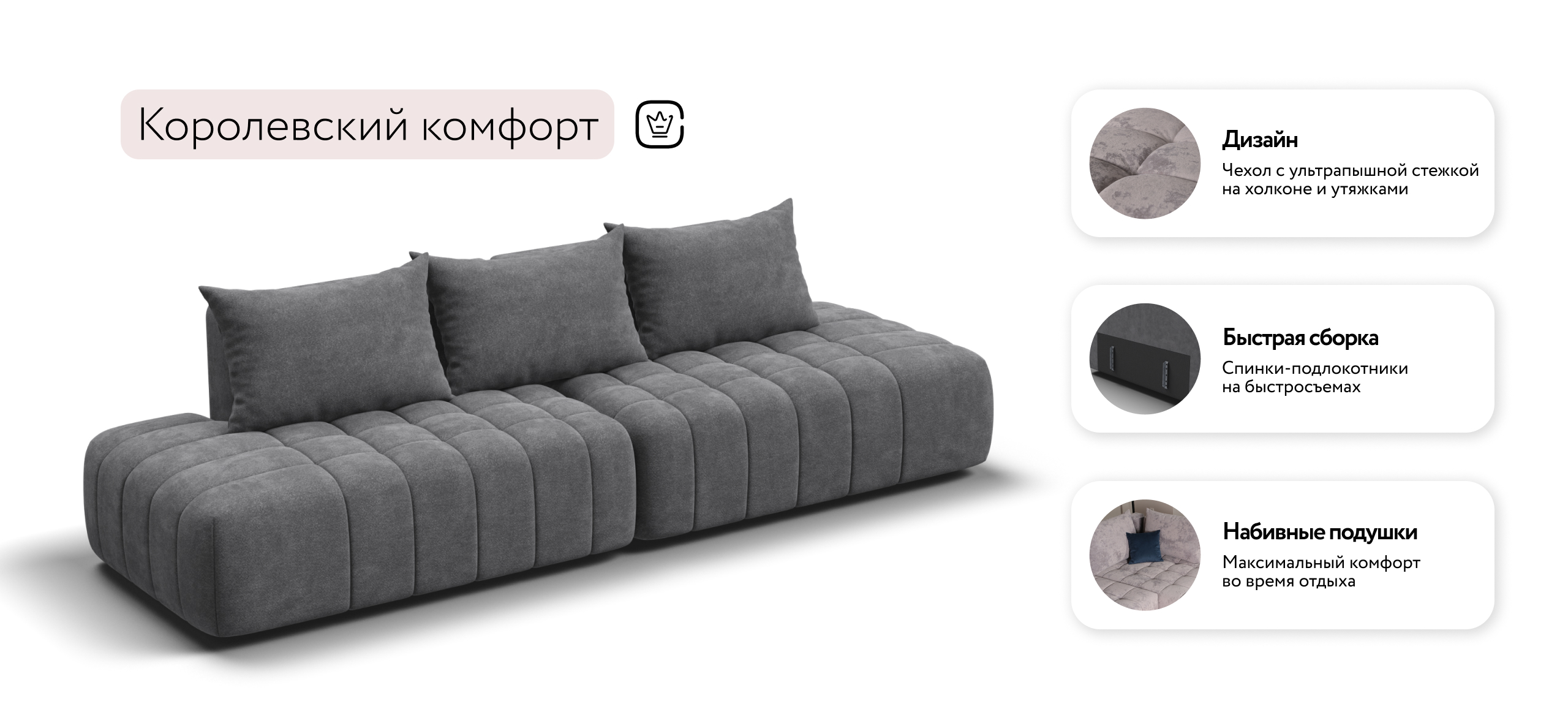 Благодаря инновационной системе креплений и быстросъёмным элементам Вы с лёгкостью можете поменять конфигурацию и адаптировать диван под новое пространство.