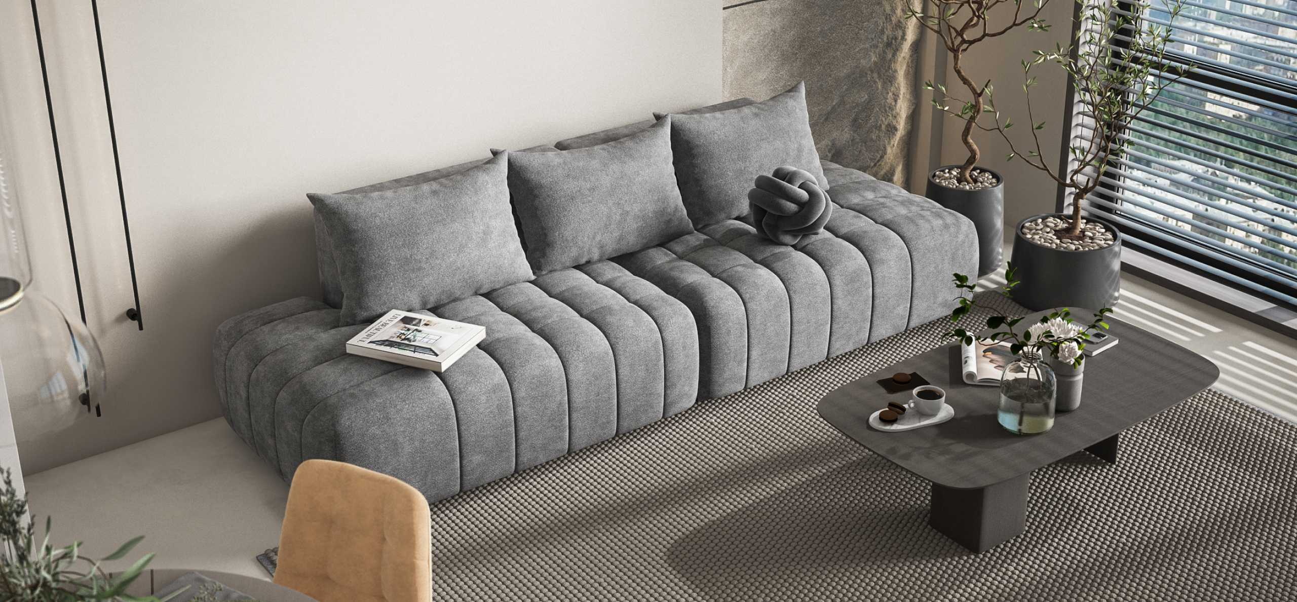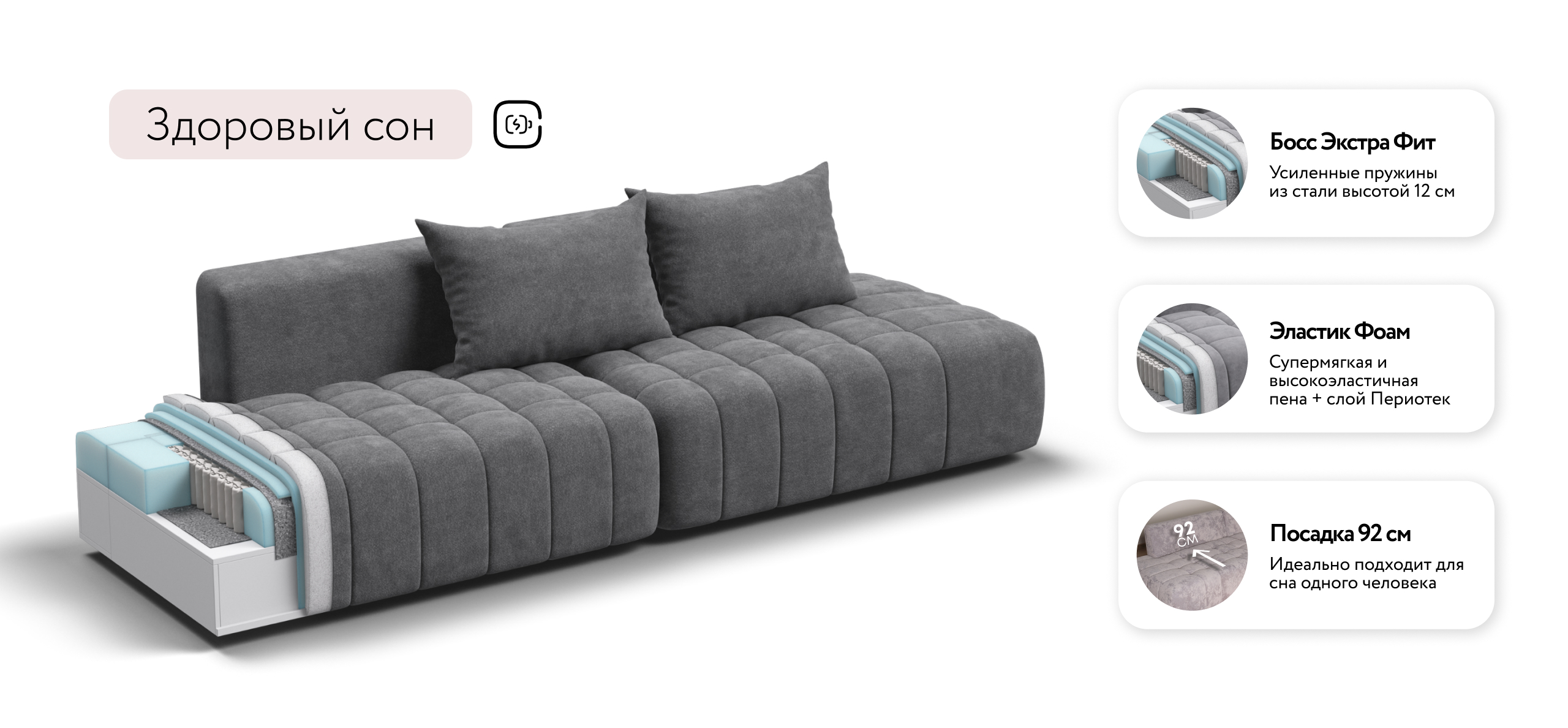 Глубокое сиденье и независимые пружины в основании словно созданы для полного расслабления, а мягкие спинки обеспечивают комфорт без лишних подушек.