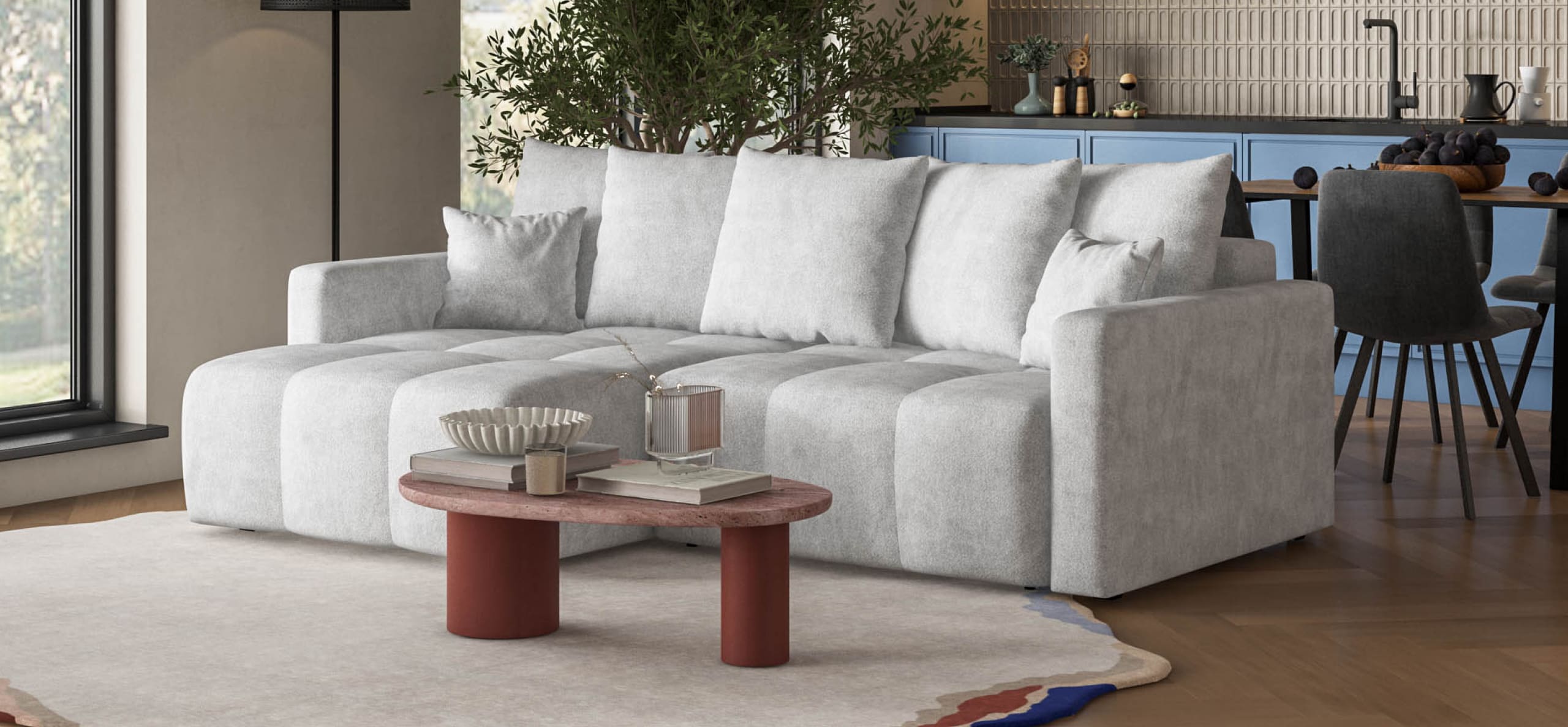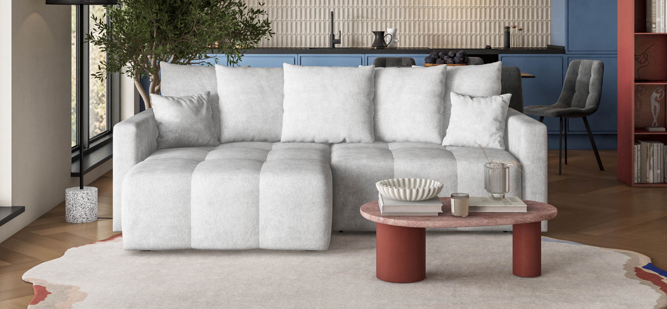 Простой и надежный механизм еврокнижка позволяет ставить диван вплотную к стене