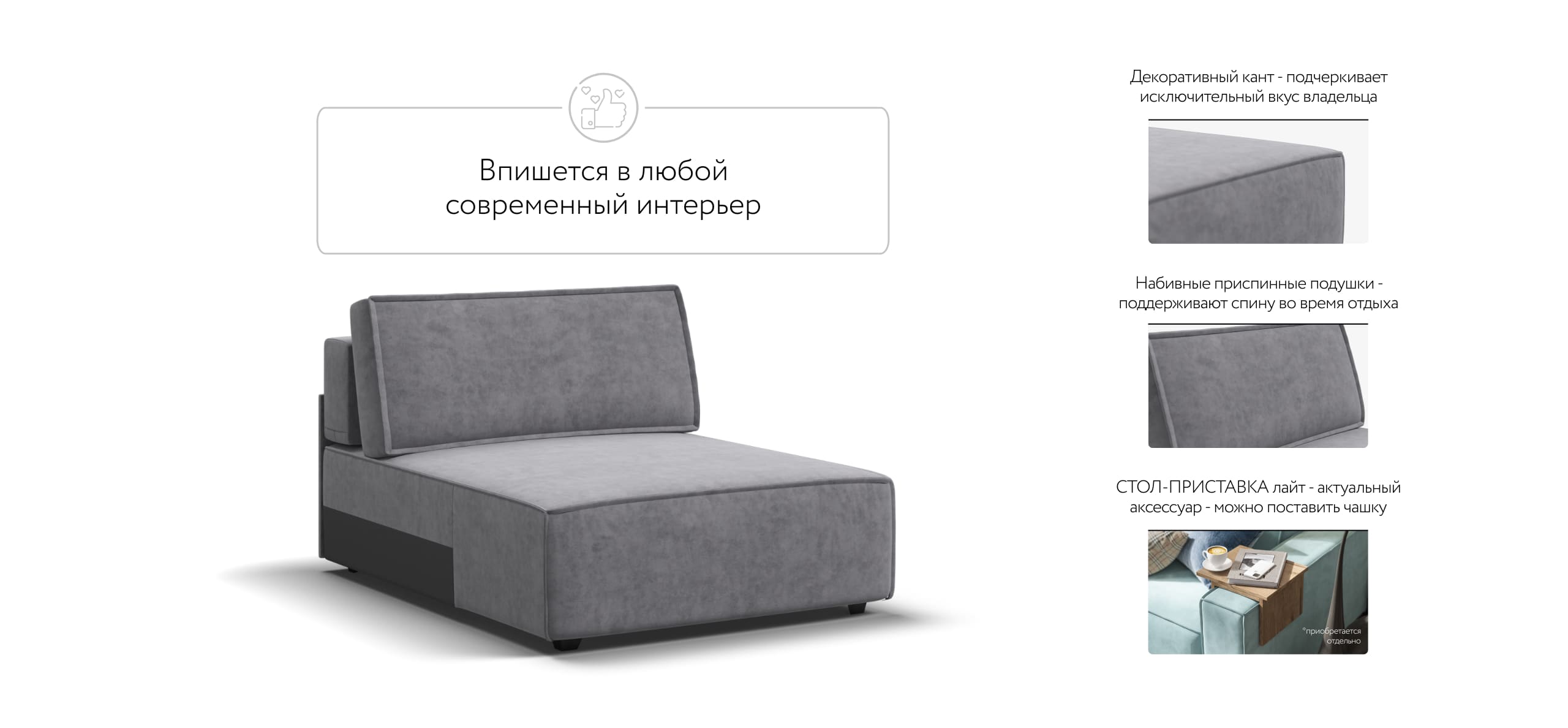 Оттоманка BOSS SOFT Modool является частью модульной системы. Универсальная оттоманка может быть установлена с любой стороны комплектации. Мягкие приспинные подушки и высокоэластичная пена с дополнительным слоем PERIOTEK создадут максимальный комфорт во время отдыха.