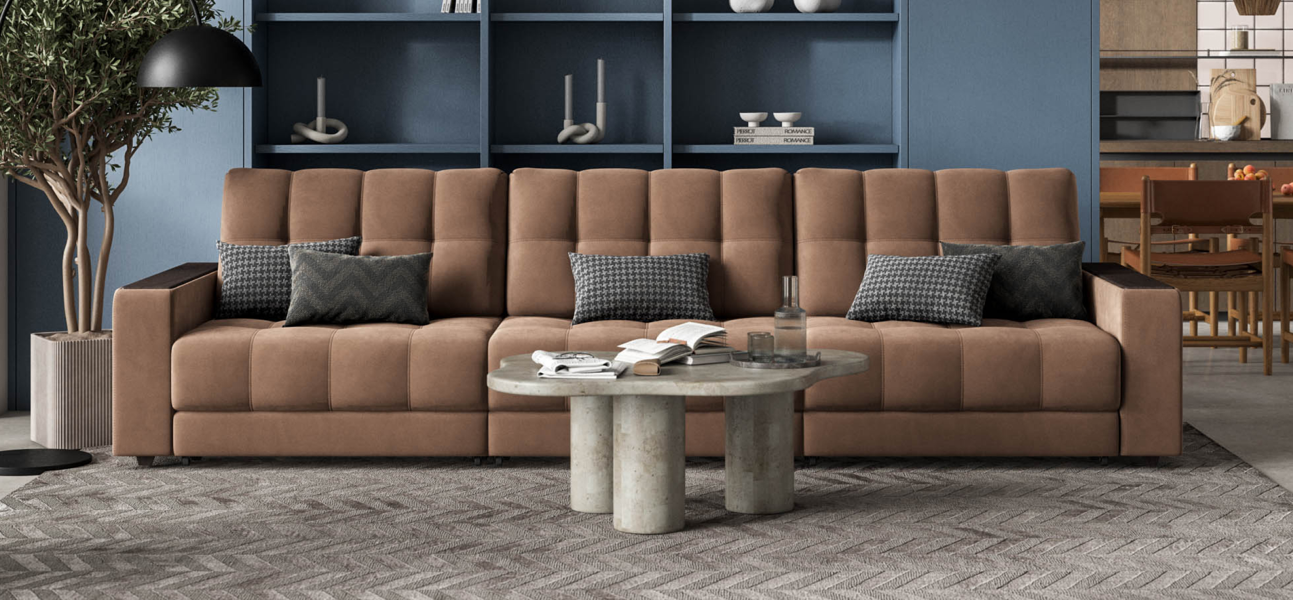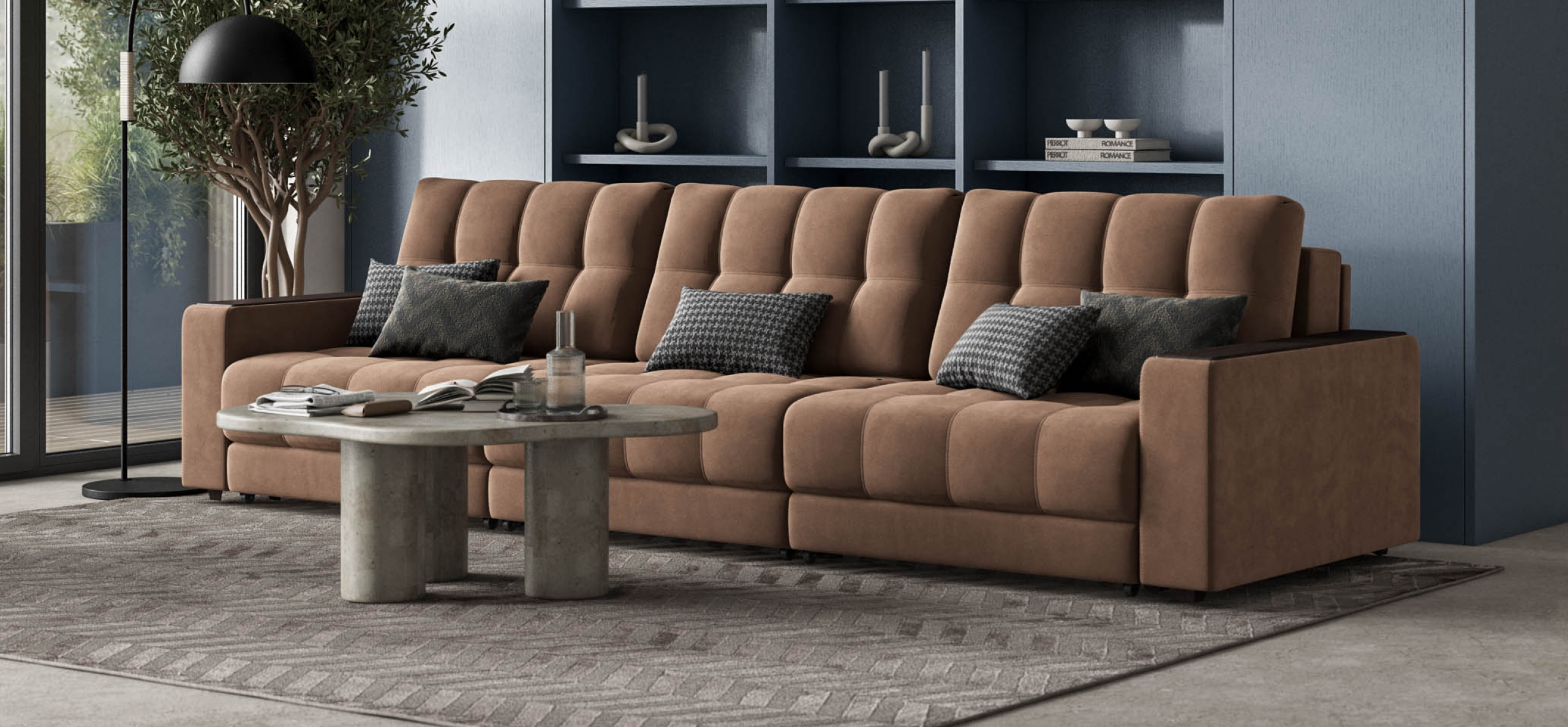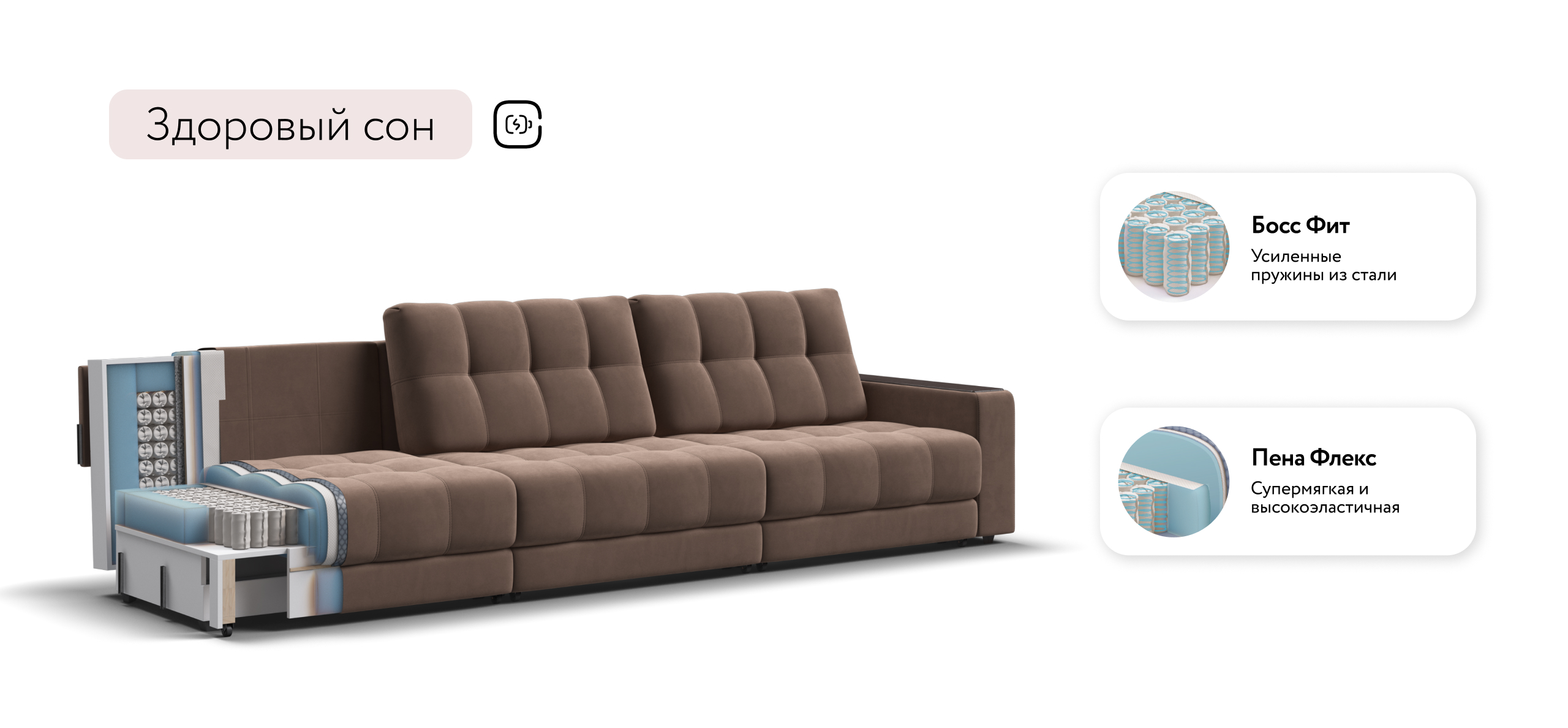 Диван BOSS GRAND - большой, стильный и комфортный диван, предназначенный для просторной комнаты. Продуманный до мелочей диван BOSS сочетает в себе надежный каркас, мягкие ткани, многофункциональность и быструю сборку за 1 минуту без инструментов - ощутите комфорт у себя дома!
