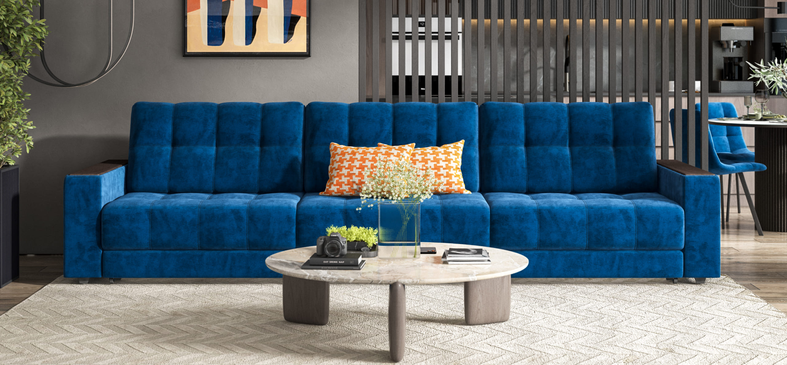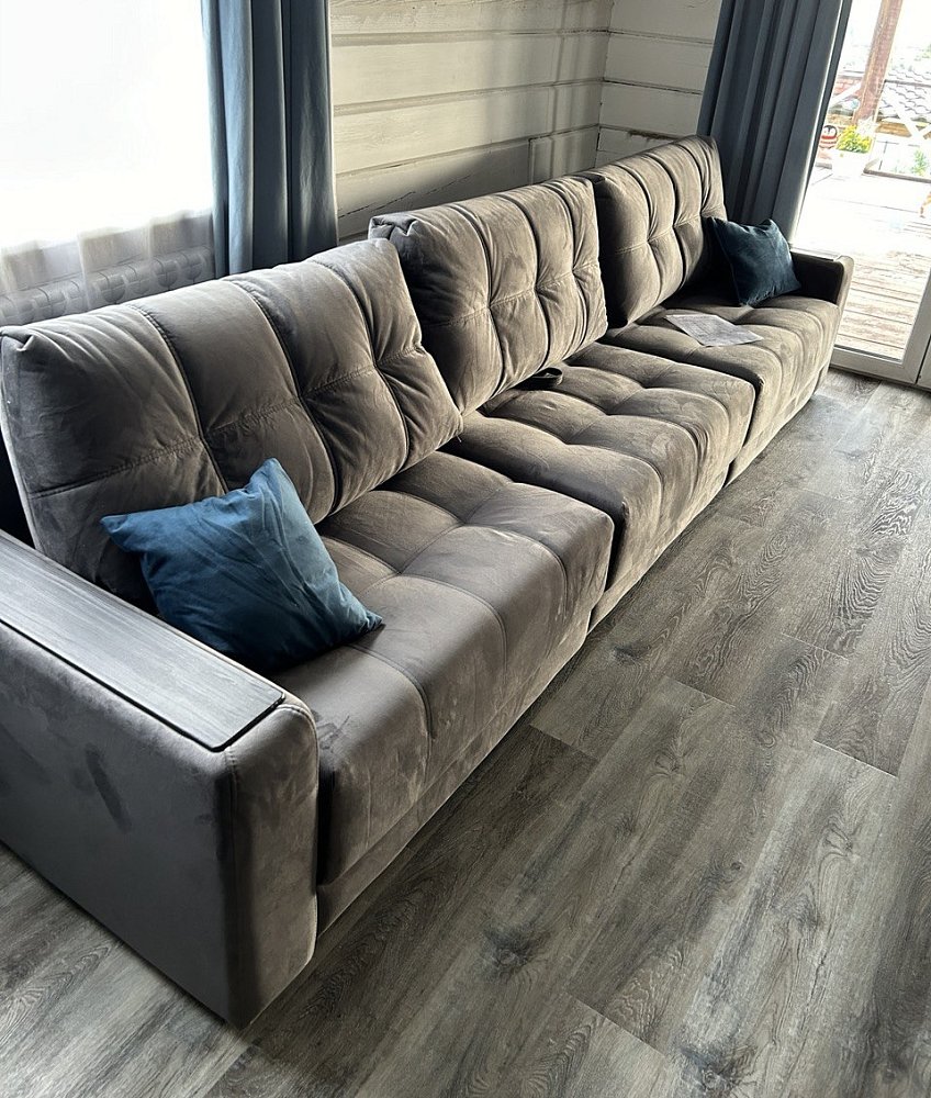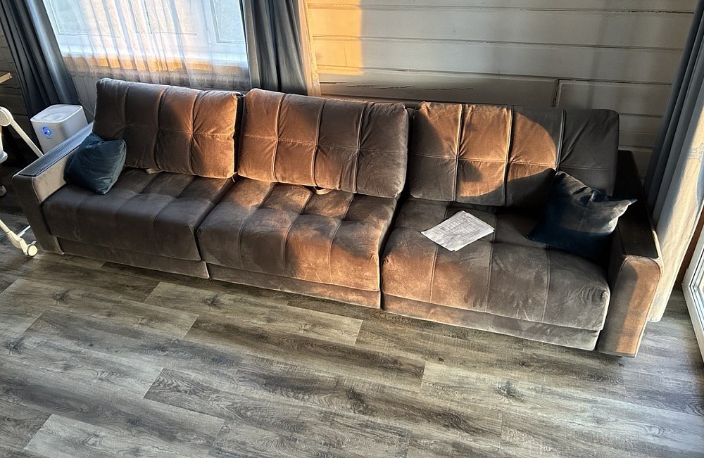 Новый диван стал центром нашей гостиной. Велюровая обивка удивительно мягкая и приятная на ощупь, что добавляет дополнительный комфорт в использовании. К тому же, диван отличается стильным дизайном, который отлично вписывается в современный интерьер. С его помощью пространство стало более уютным и привлекательным.