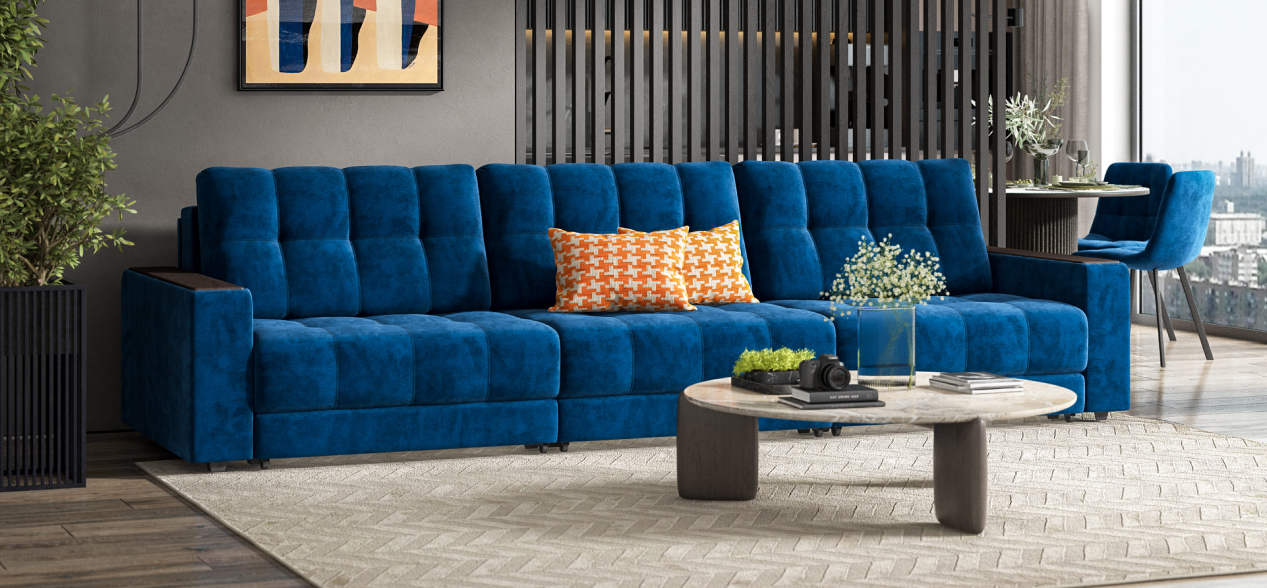Диван BOSS GRAND - большой, стильный и комфортный диван, предназначенный для просторной комнаты. Продуманный до мелочей диван BOSS сочетает в себе надежный каркас, мягкие ткани, многофункциональность и быструю сборку за 1 минуту без инструментов - ощутите комфорт у себя дома!