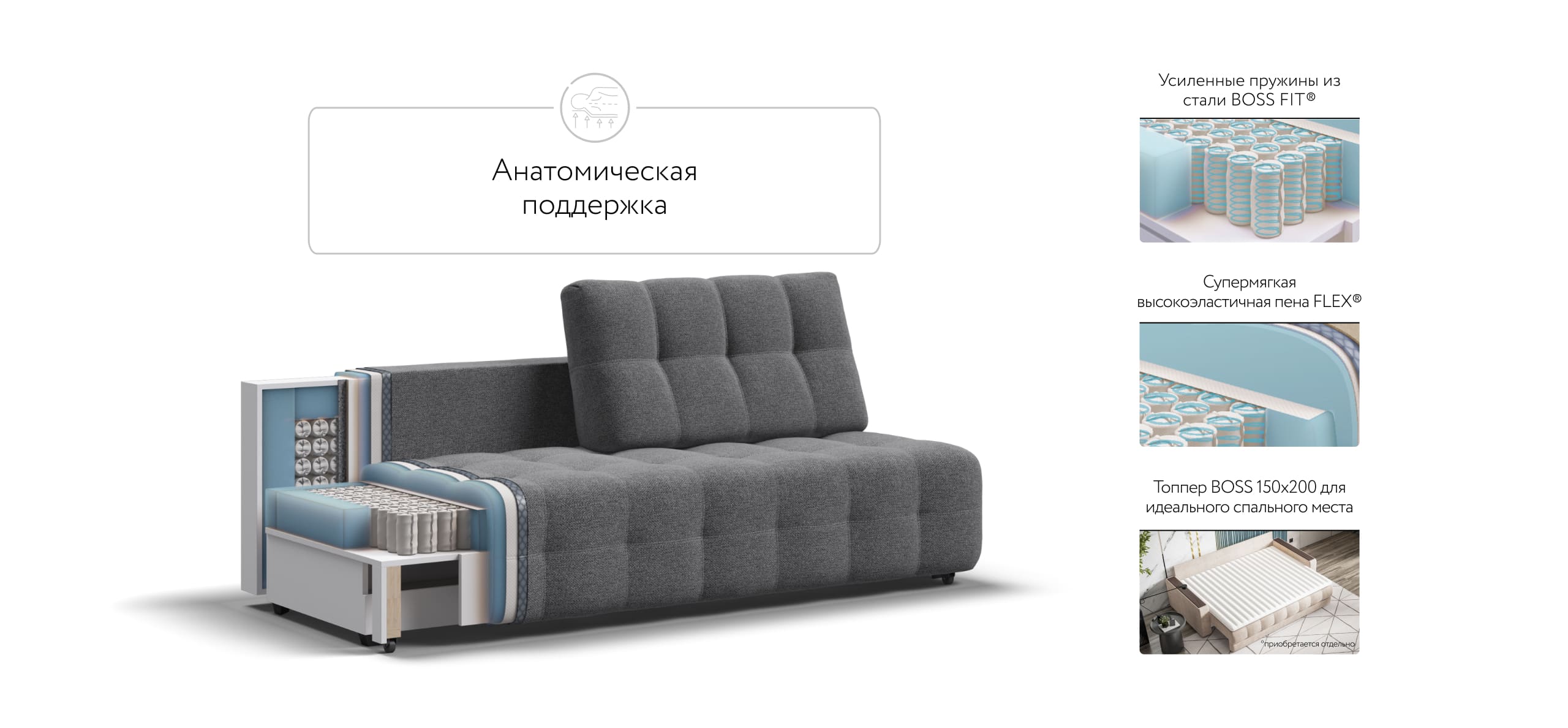 Диван BOSS MINI - отсутствие подлокотников и минималистичный дизайн. Надежный механизм трансформации, в положение повышенного комфортного отдыха RELAX, увеличенная глубина сиденья на 30%, и два ровных цельных спальных места при полной раскладки дивана. Ощутите истинный комфорт у себя дома!