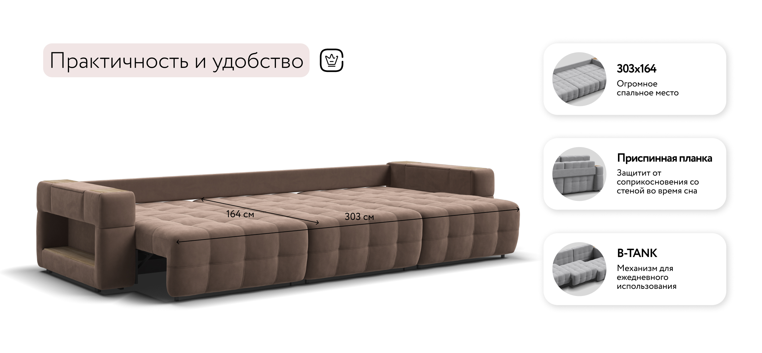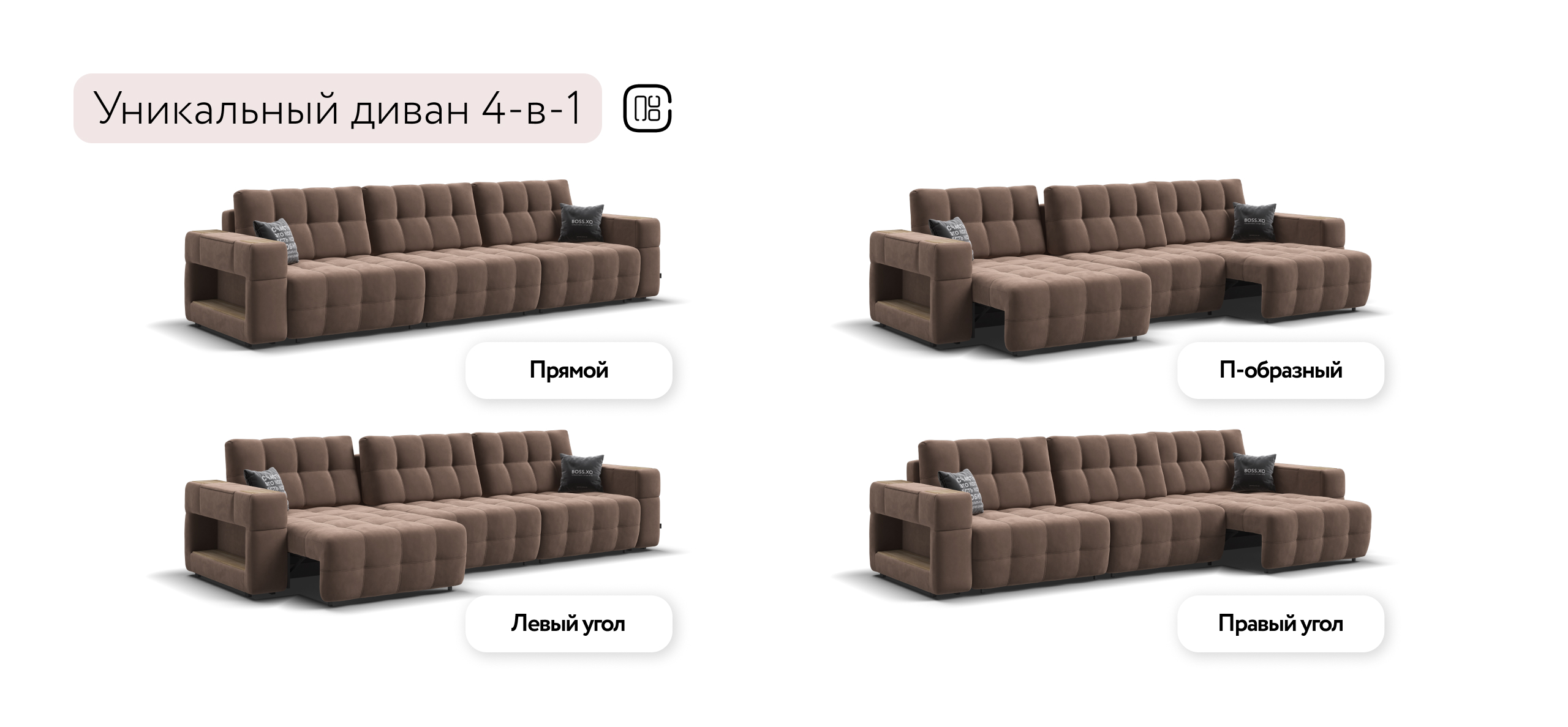 BOSS.XO MAX - это и прямой, угловой и П-образный диван сразу, за 10 секунд вы можете превратить его в правый или левый угол, а также в П-образный.