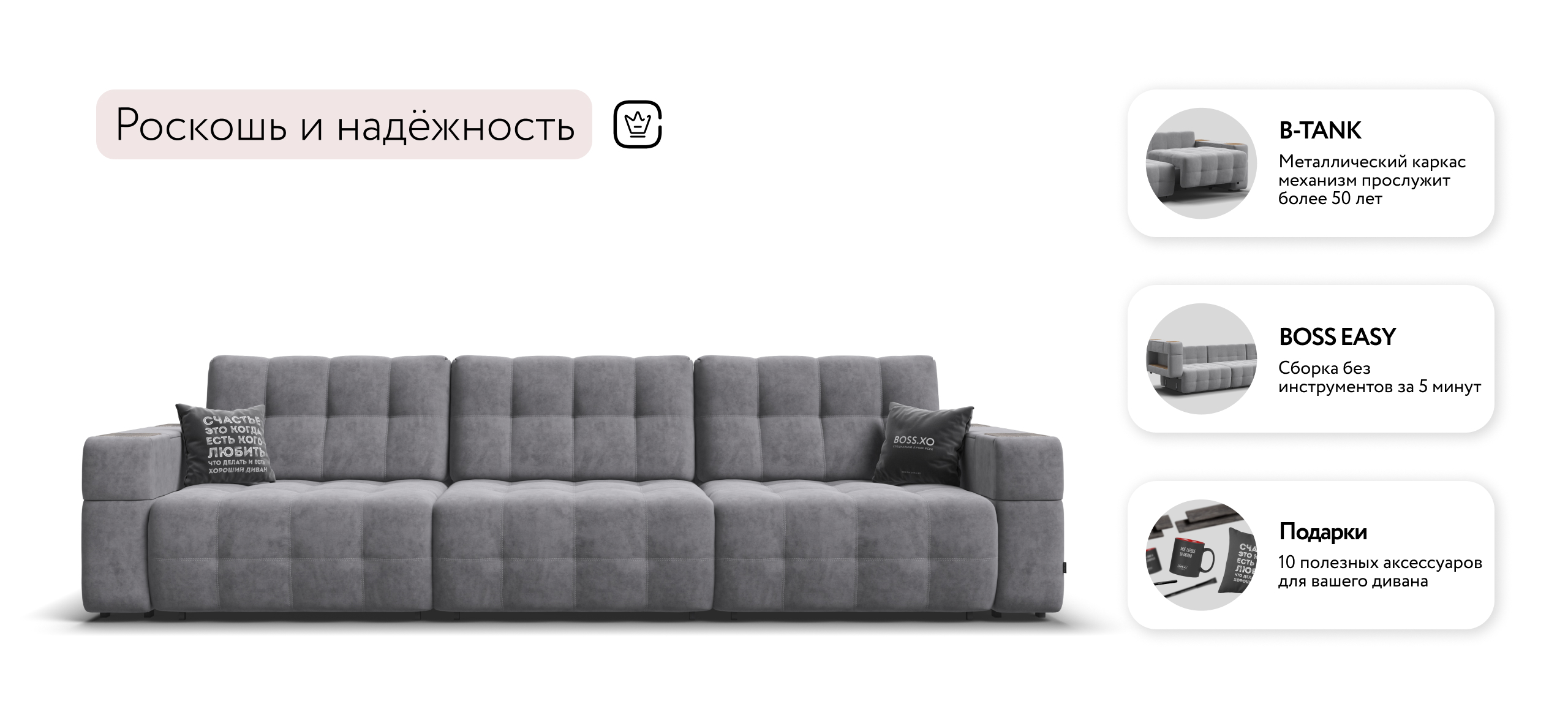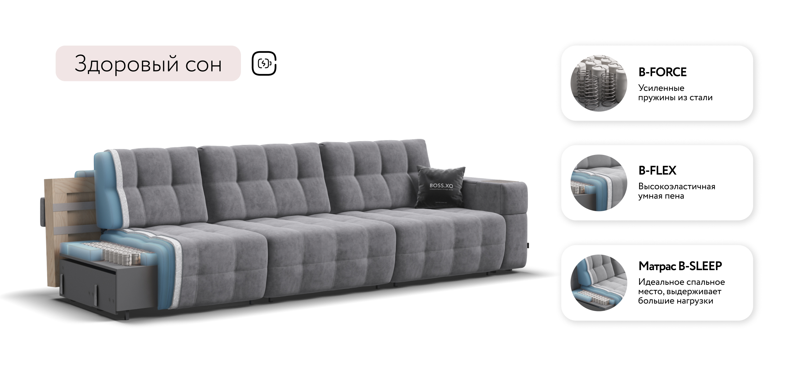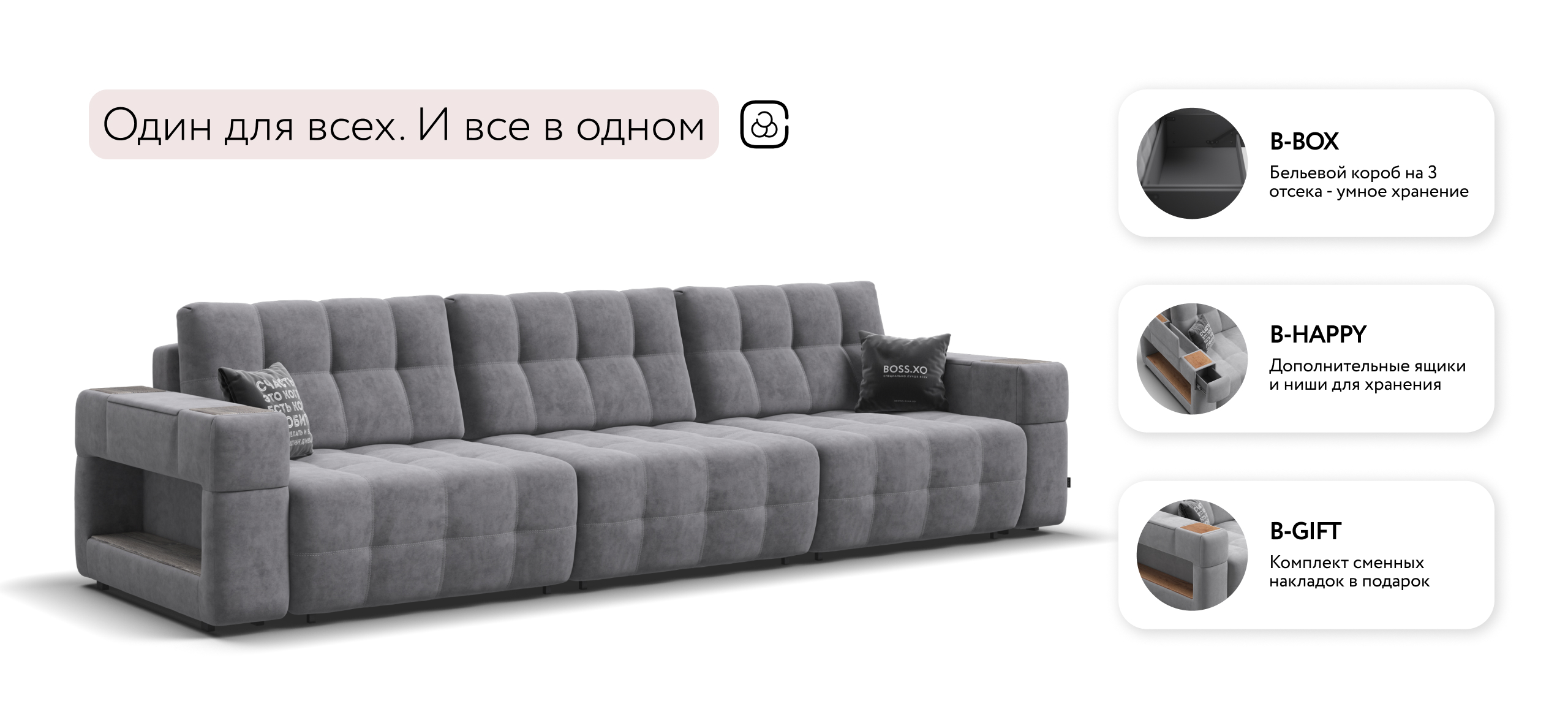 С гордостью представляем новый диван BOSS.XO MAX, разработанный специально для красоты, комфорта и радости в Вашем доме. Это не просто диван - в нём десятки новых функций, которые сделали его центром притяжения для всей Семьи.