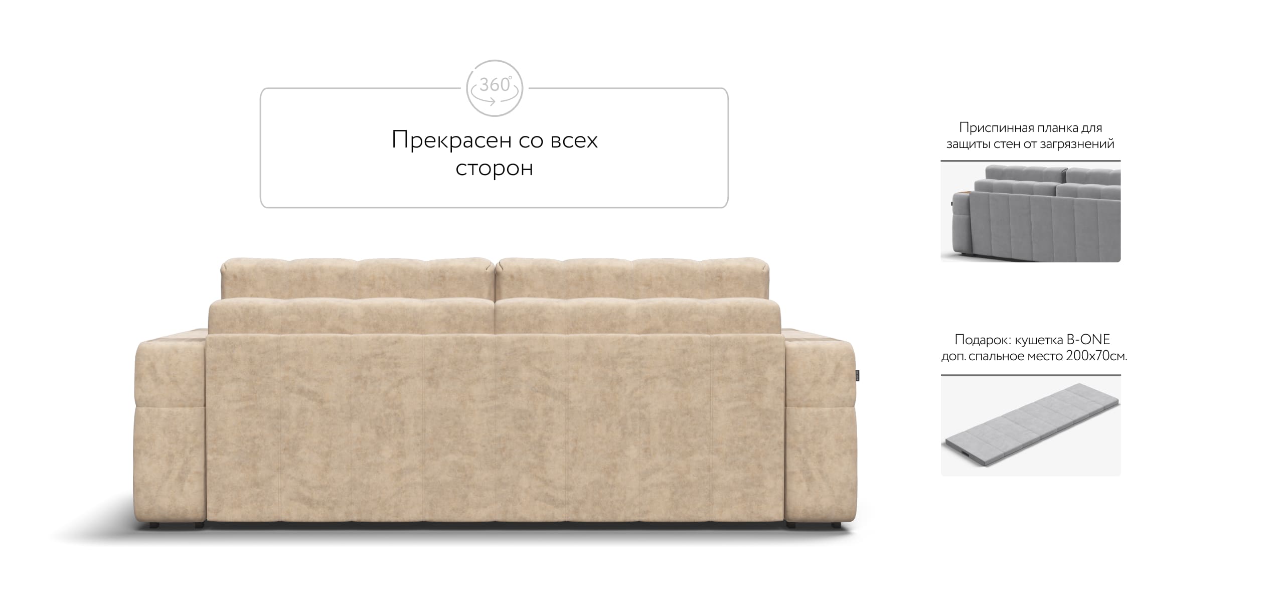 Покупая диван BOSS.XO вы становитесь обладателем уникальных подарков: быстрая зарядка для смартфона, 2 стильных кружки, 2 удобных столика для ноутбука, 2 подушки, комплект запасных накладок на подлокотники B-HAPPY®️, экоручки и средство для чистки BOSS Clean.