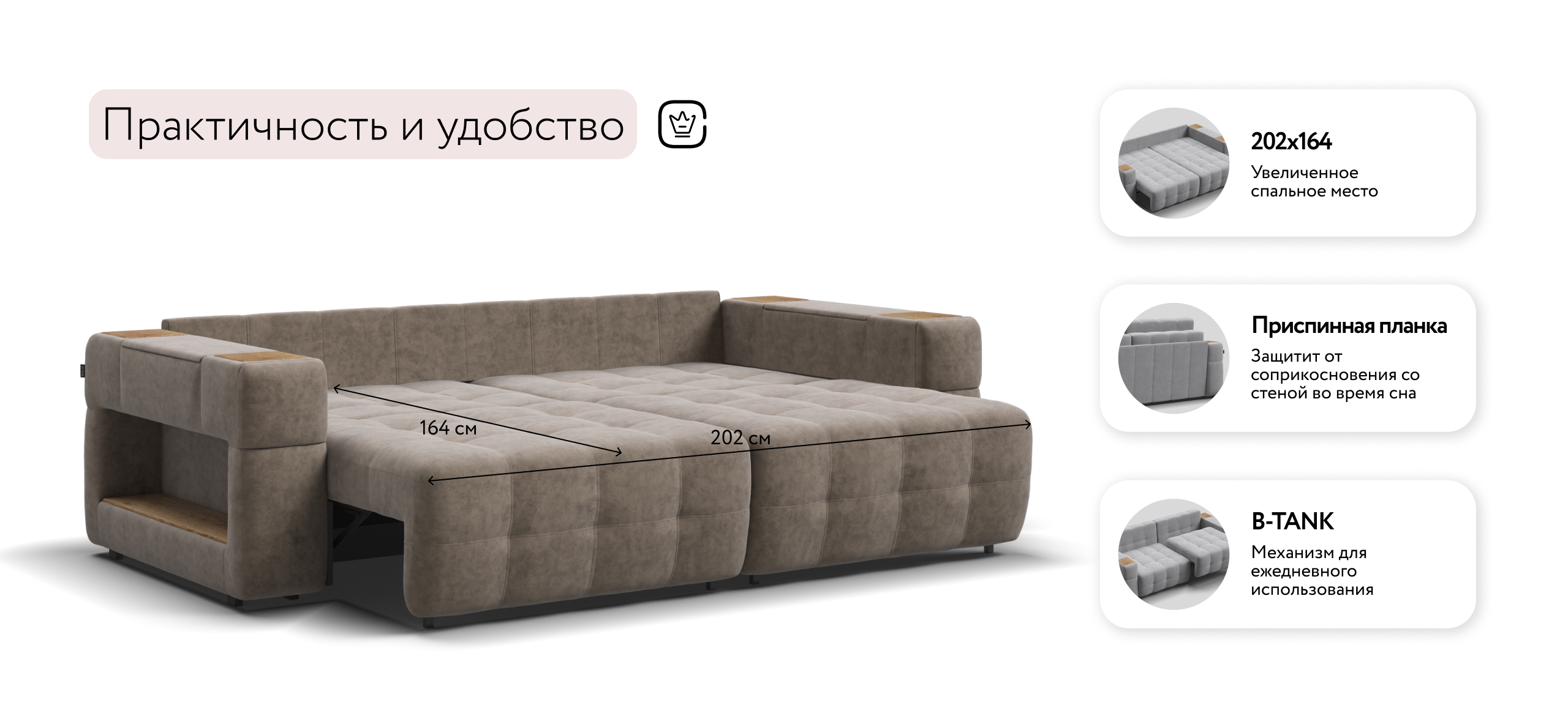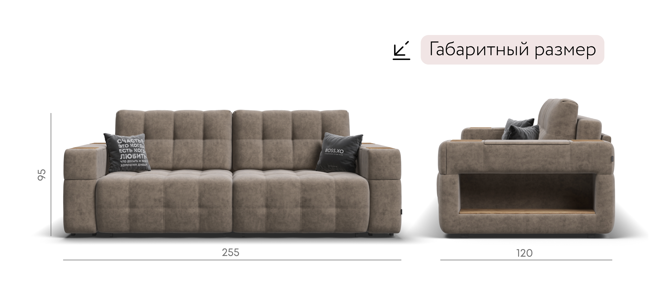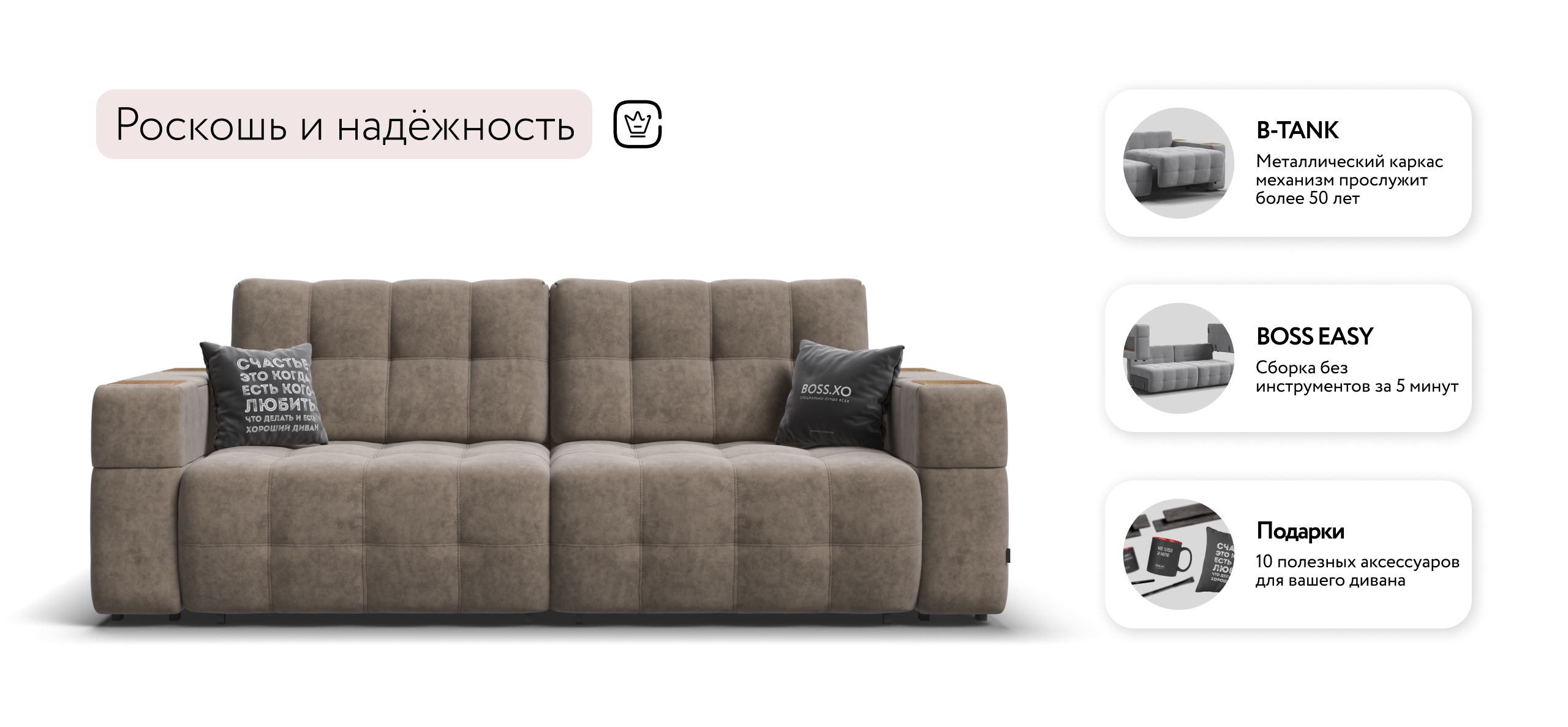 Покупая диван BOSS.XO вы становитесь обладателем уникальных подарков: быстрая зарядка для смартфона, 2 стильных кружки, 2 удобных столика для ноутбука, 2 подушки, комплект запасных накладок на подлокотники B-HAPPY®️, экоручки и средство для чистки BOSS Clean.Характеристики