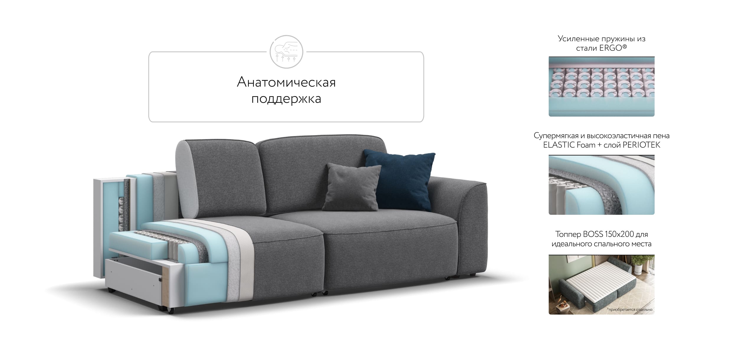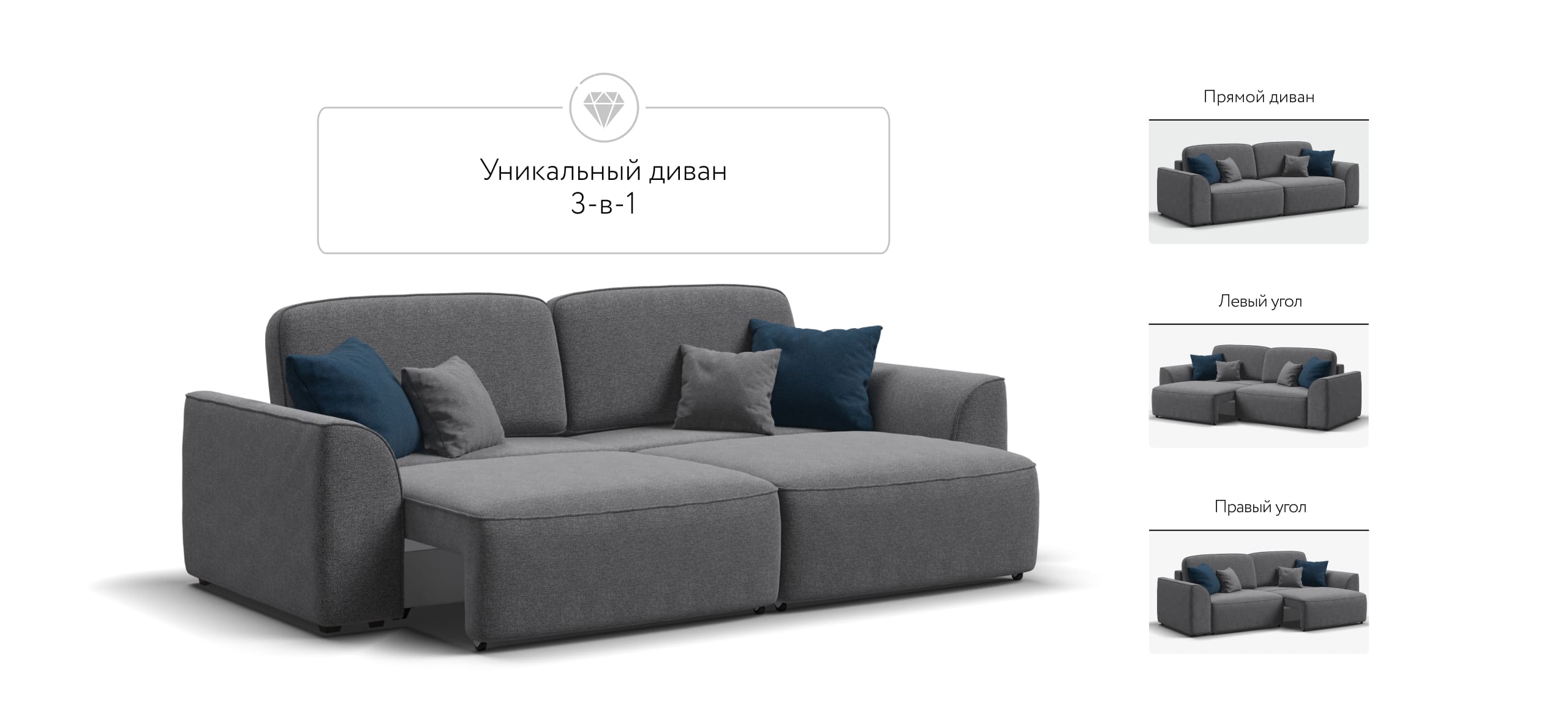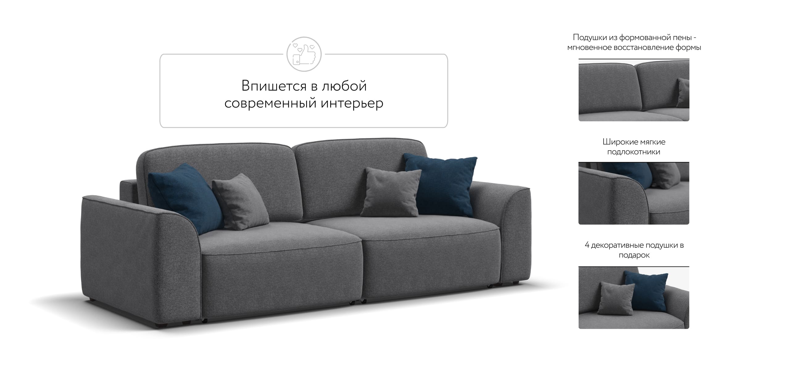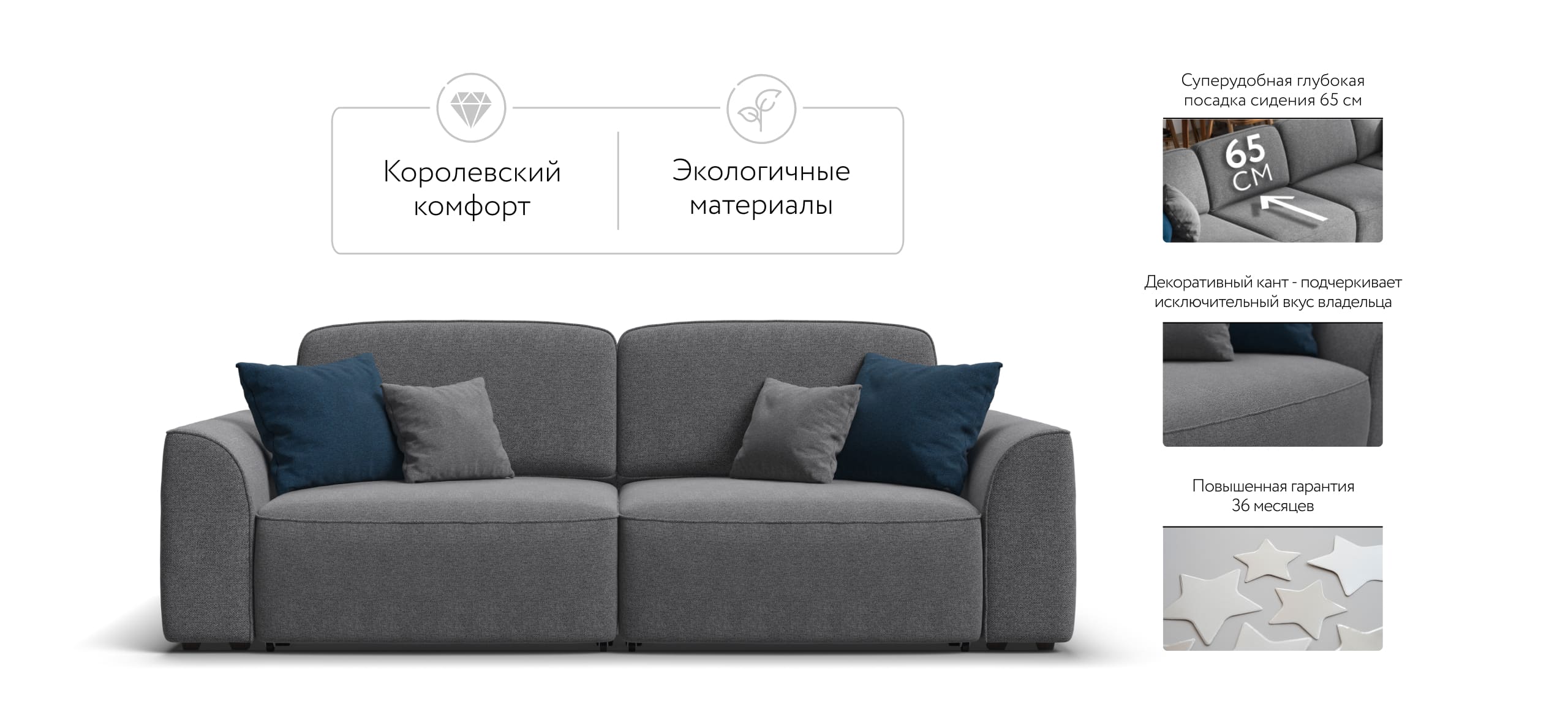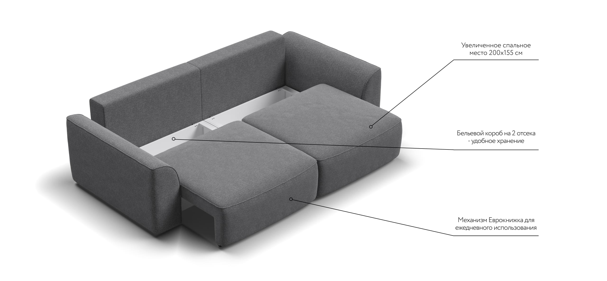 Комфортная посадка, скругленные линии, объемные подушки - диван, который наполнит ваш дом уютом и комфортом. Каждое посадочное место можно выдвинуть вперед и получить угловой диван, на котором с комфортом разместится небольшая компания. А в разложенном виде диван превращается в комфортное спальное место.