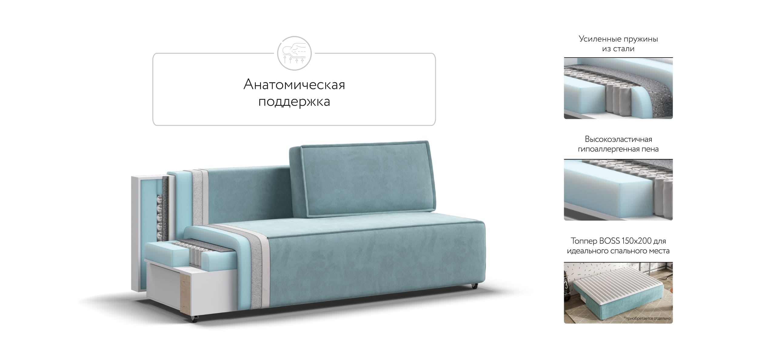 Днем вы с комфортом сможете провести время за просмотром любимого фильма, а ночью трансформировать диван в идеально ровное спальное место без стыков, благодаря анатомическому матрасу и надежному механизму еврокнижка.
