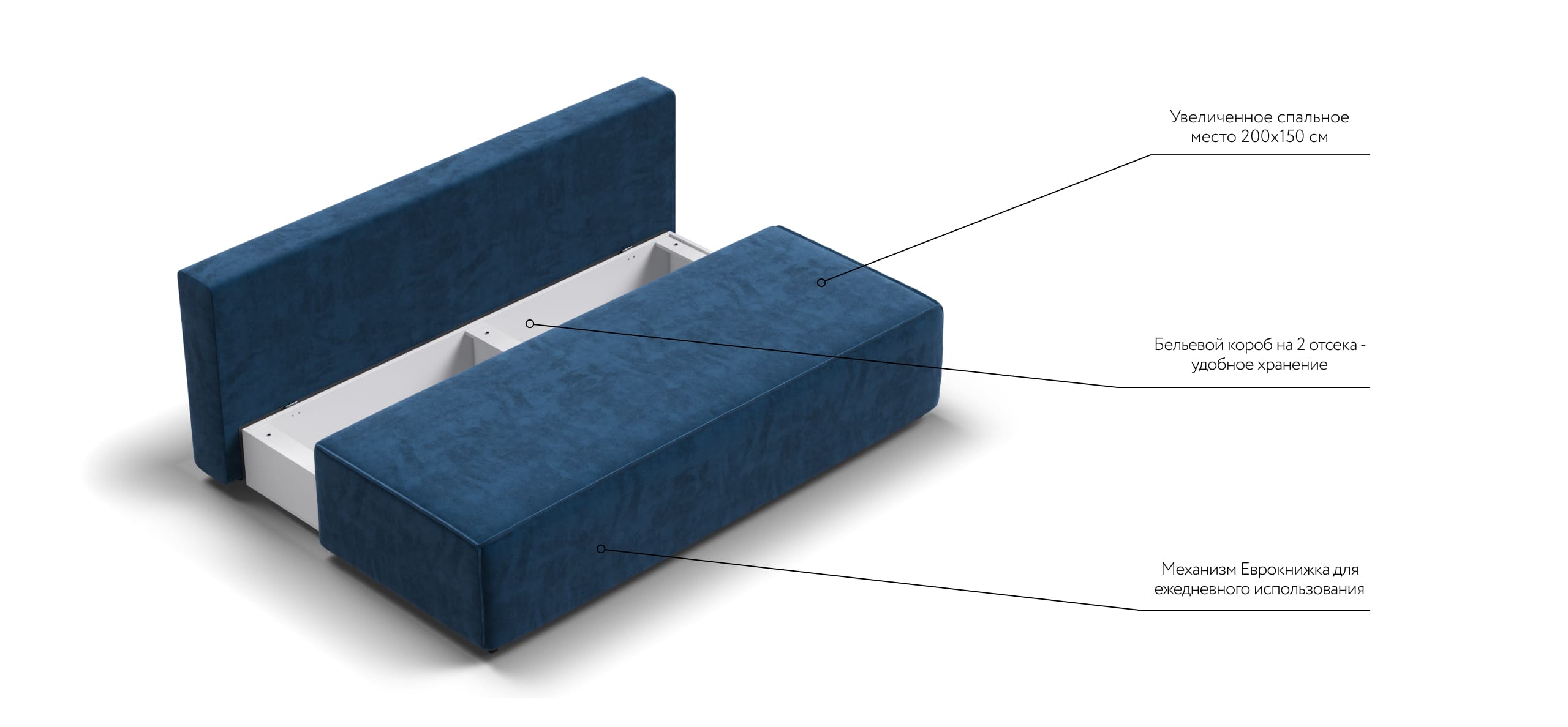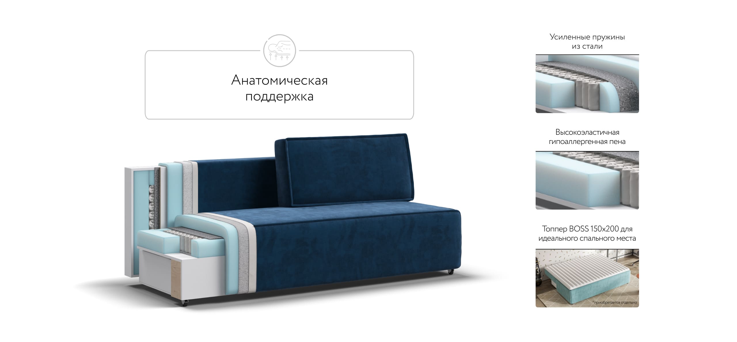 Днем вы с комфортом сможете провести время за просмотром любимого фильма, а ночью трансформировать диван в идеально ровное спальное место без стыков, благодаря анатомическому матрасу и надежному механизму еврокнижка.
