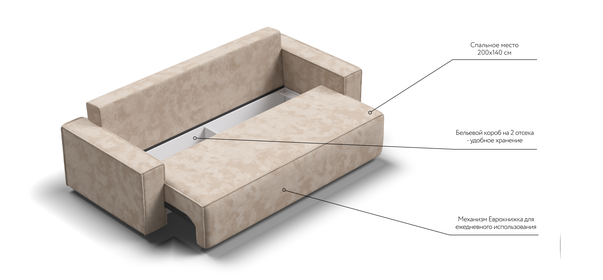 Днем вы с комфортом сможете провести время за просмотром любимого фильма, а ночью трансформировать диван в идеально ровное спальное место без стыков, благодаря анатомическому матрасу и надежному механизму еврокнижка.