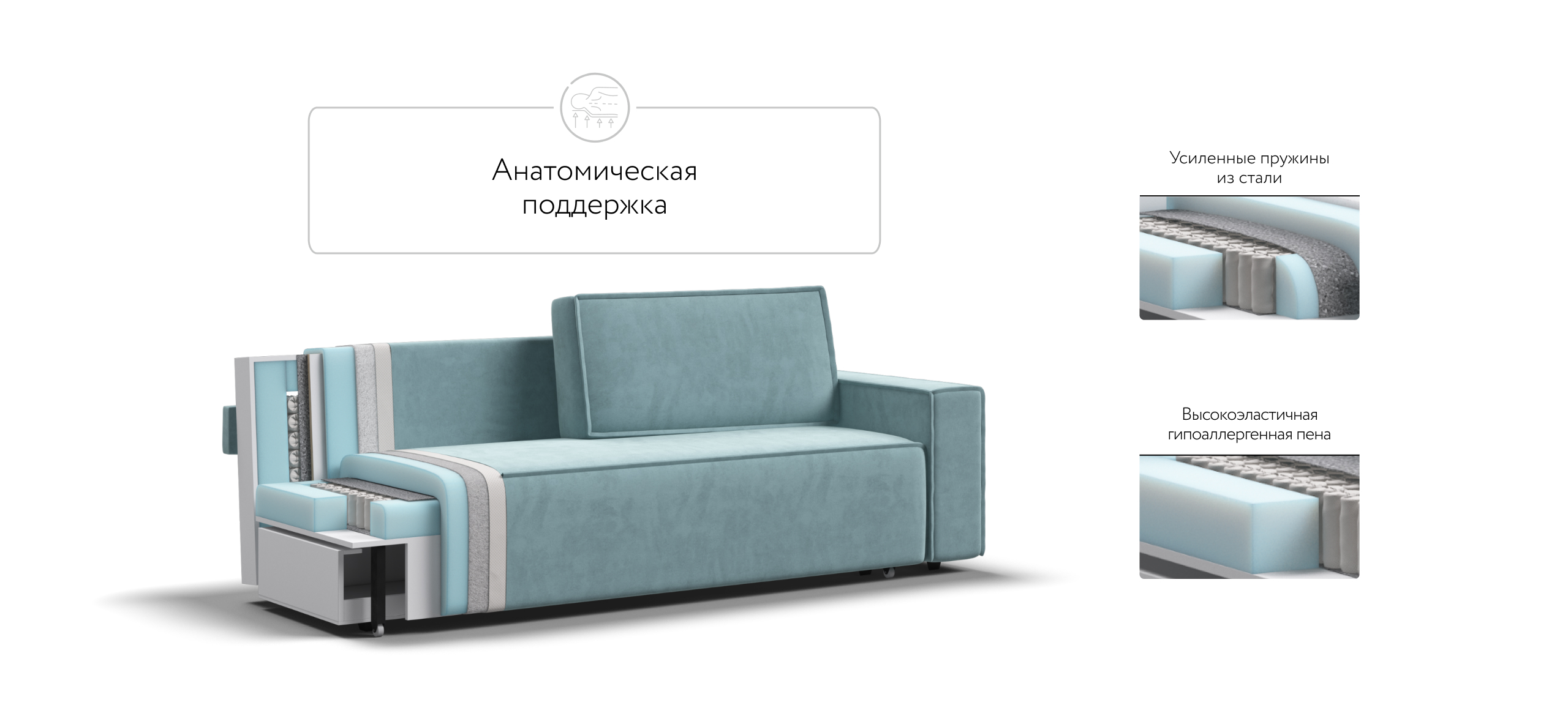 Днем вы с комфортом сможете провести время за просмотром любимого фильма, а ночью трансформировать диван в идеально ровное спальное место без стыков, благодаря анатомическому матрасу и надежному механизму еврокнижка.