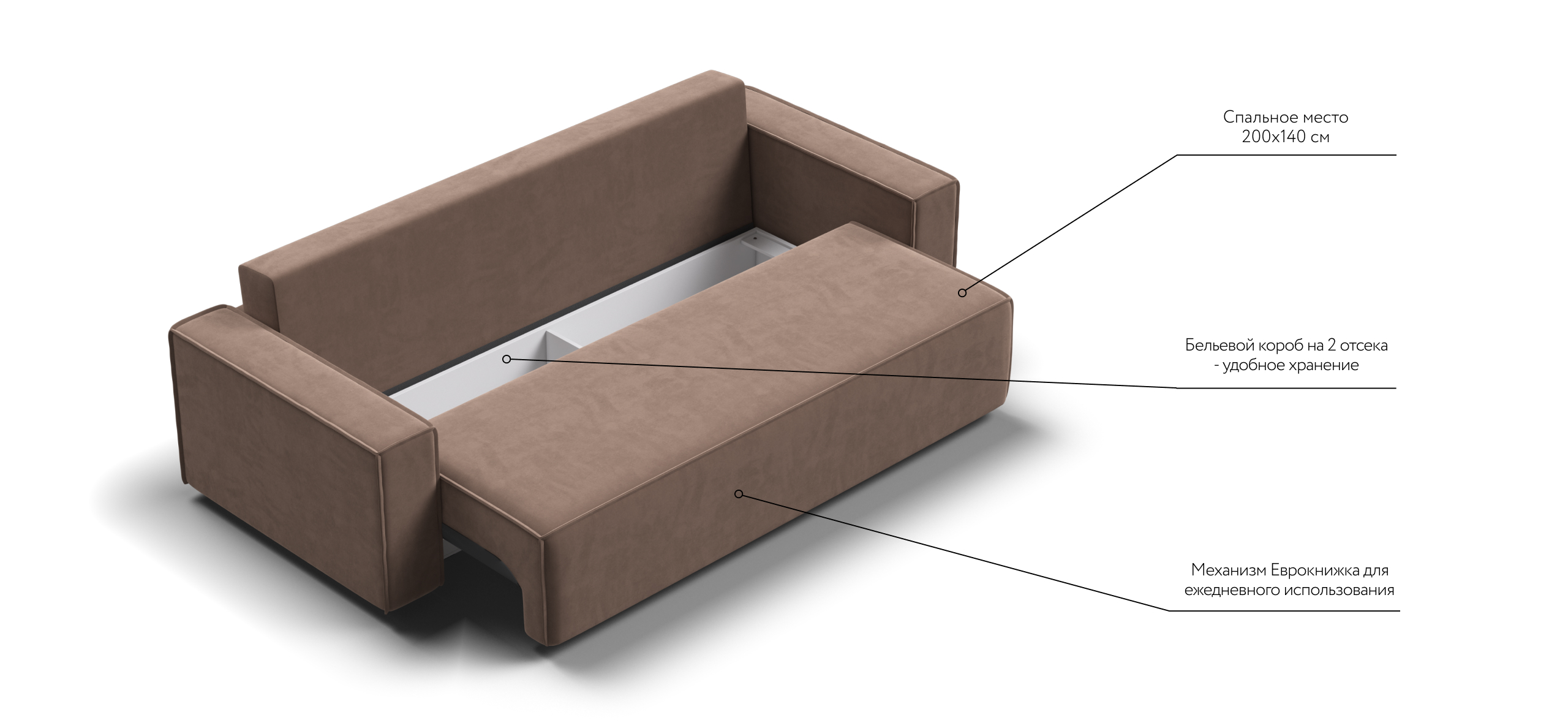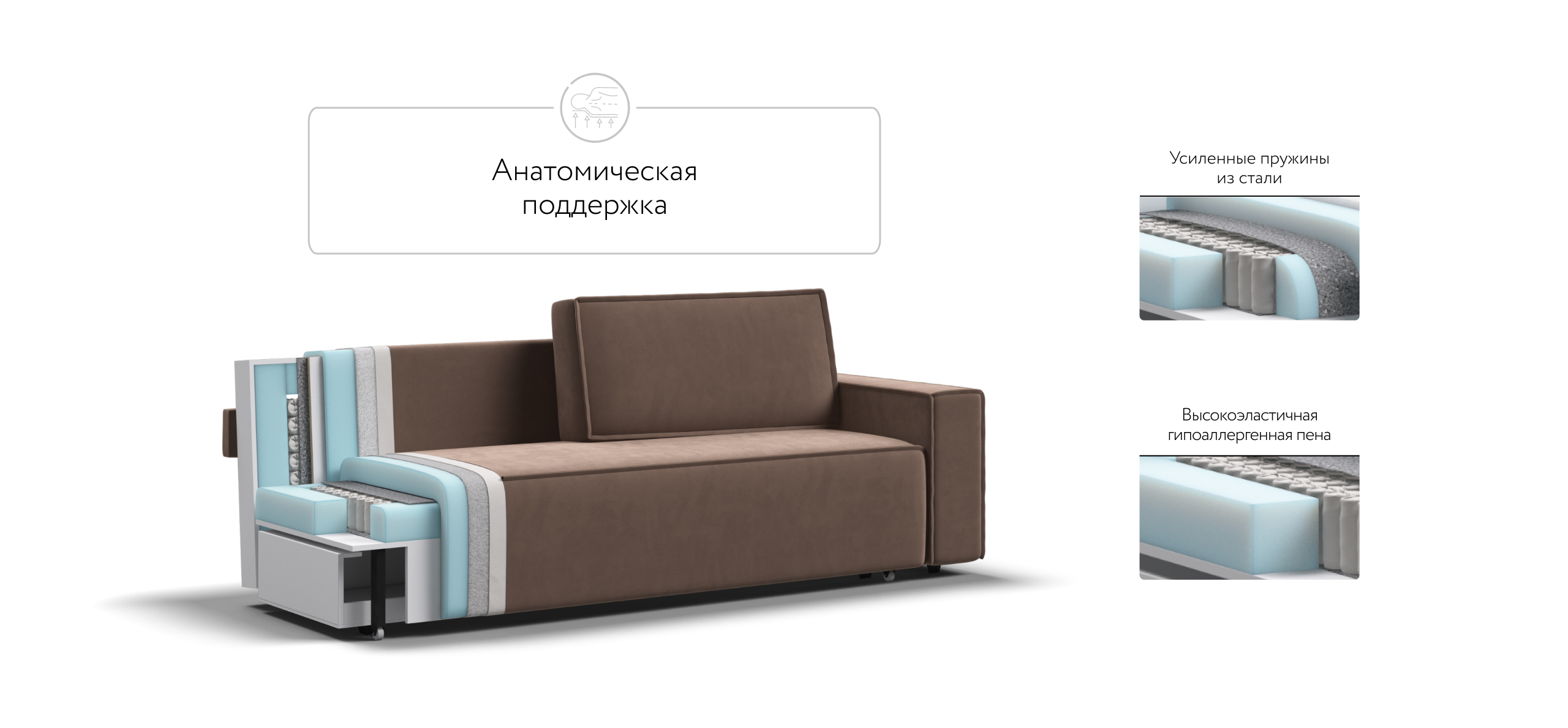 Днем вы с комфортом сможете провести время за просмотром любимого фильма, а ночью трансформировать диван в идеально ровное спальное место без стыков, благодаря анатомическому матрасу и надежному механизму еврокнижка.