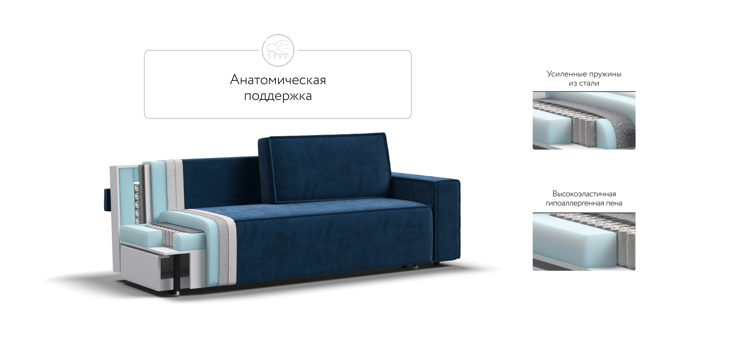Днем вы с комфортом сможете провести время за просмотром любимого фильма, а ночью трансформировать диван в идеально ровное спальное место без стыков, благодаря анатомическому матрасу и надежному механизму еврокнижка.