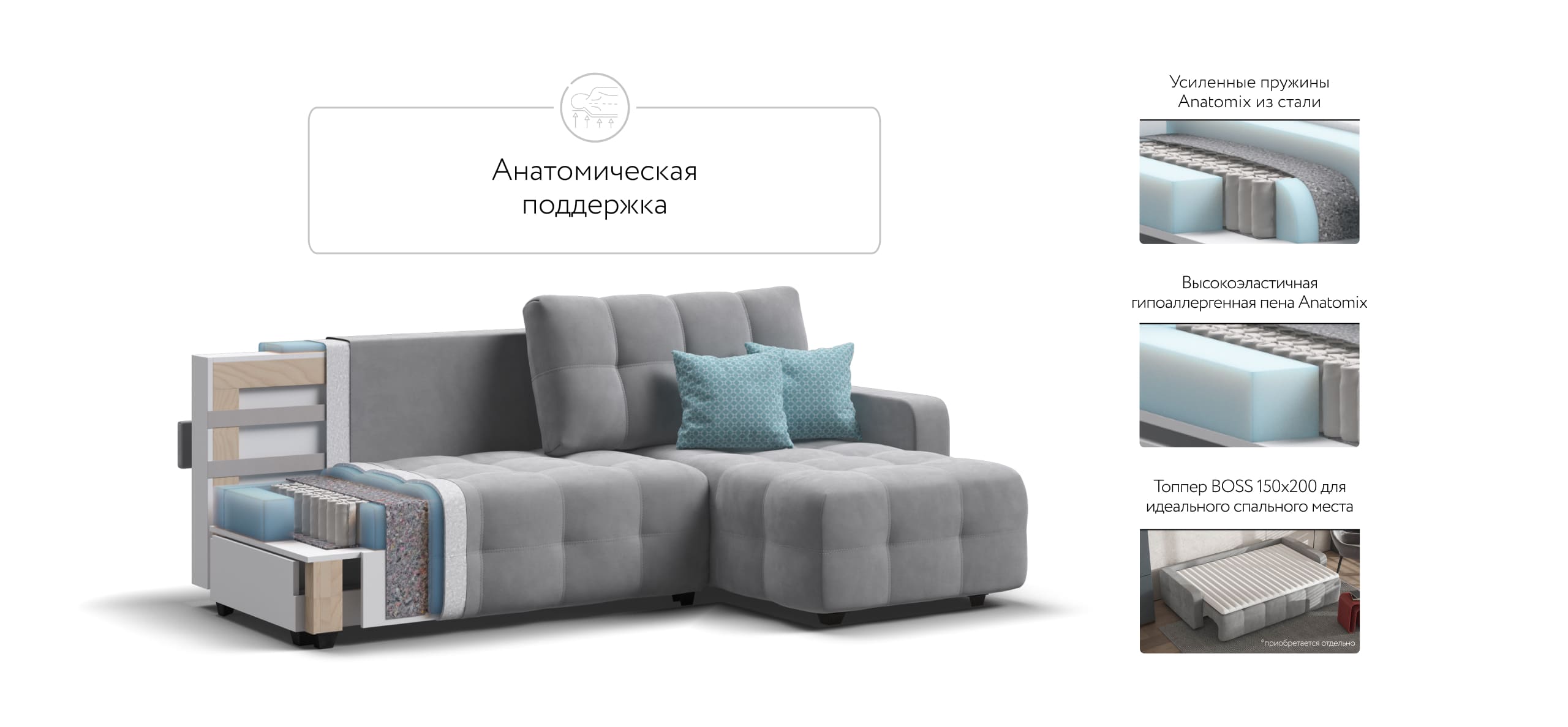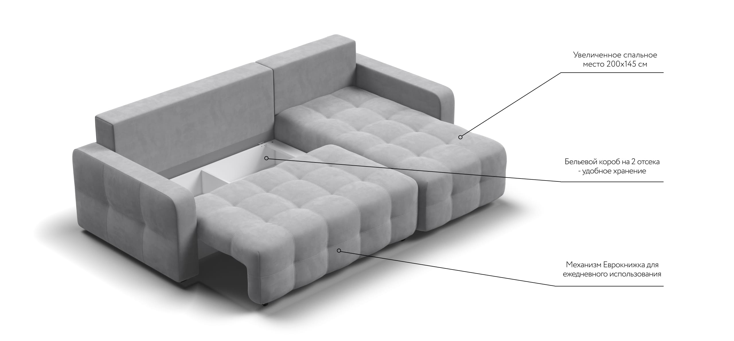 Простой и надежный механизм трансформации еврокнижка позволяет с легкостью раскладывать диван в удобную, полноценную, двуспальную кровать.
