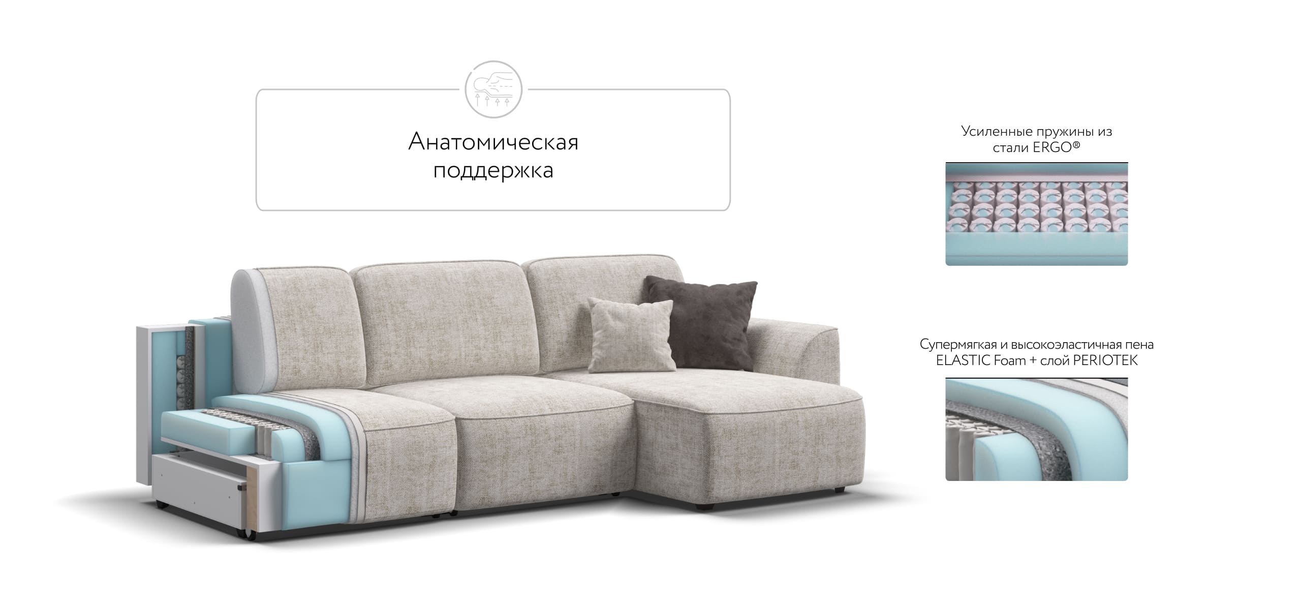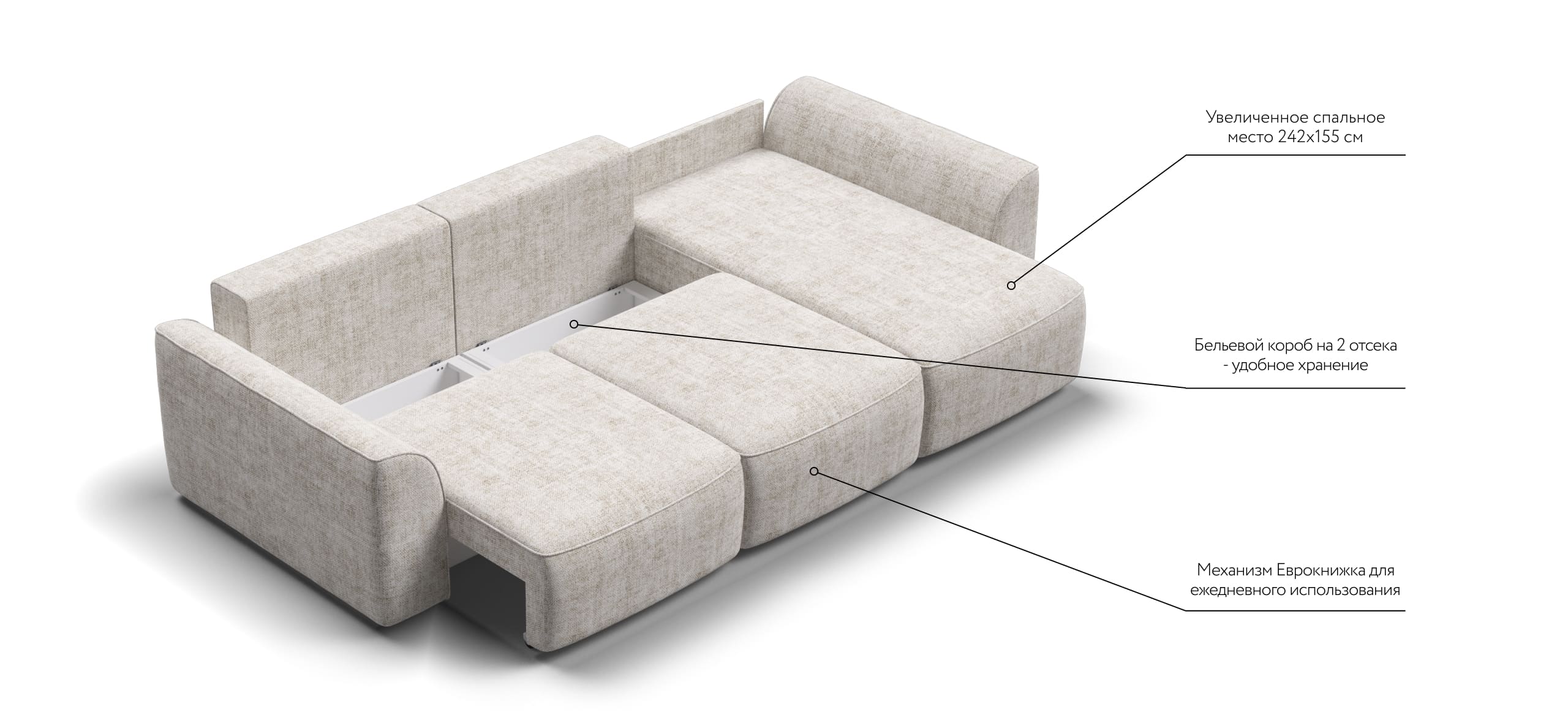 Комфортная посадка, скругленные линии, объемные подушки - диван, который наполнит ваш дом уютом и комфортом. Универсальный угол позволит Вам самостоятельно выбрать его положение при сборке, а каждое посадочное место можно выдвинуть вперед и получить П-образную форму дивана, на котором с комфортом разместится большая компания. А в разложенном виде диван превращается в комфортное спальное место.