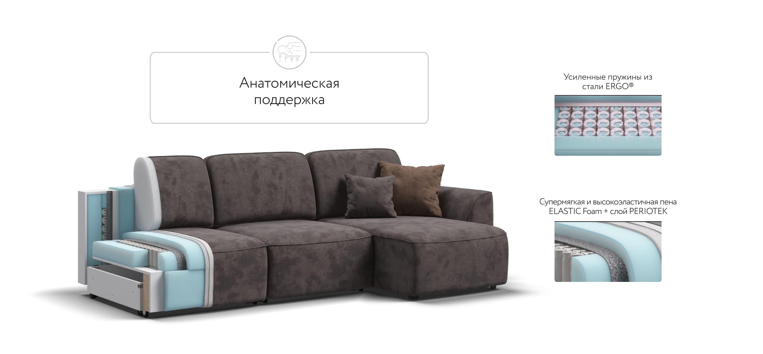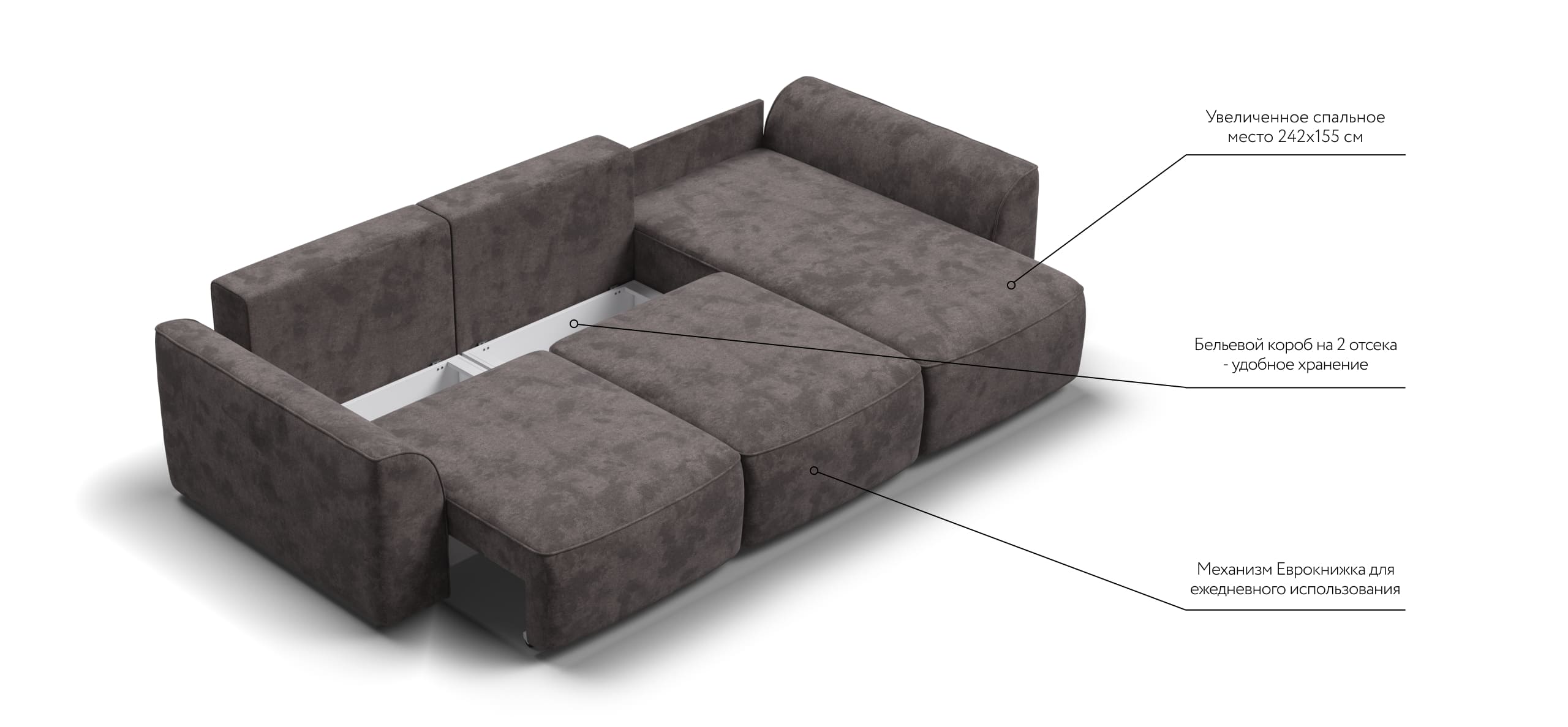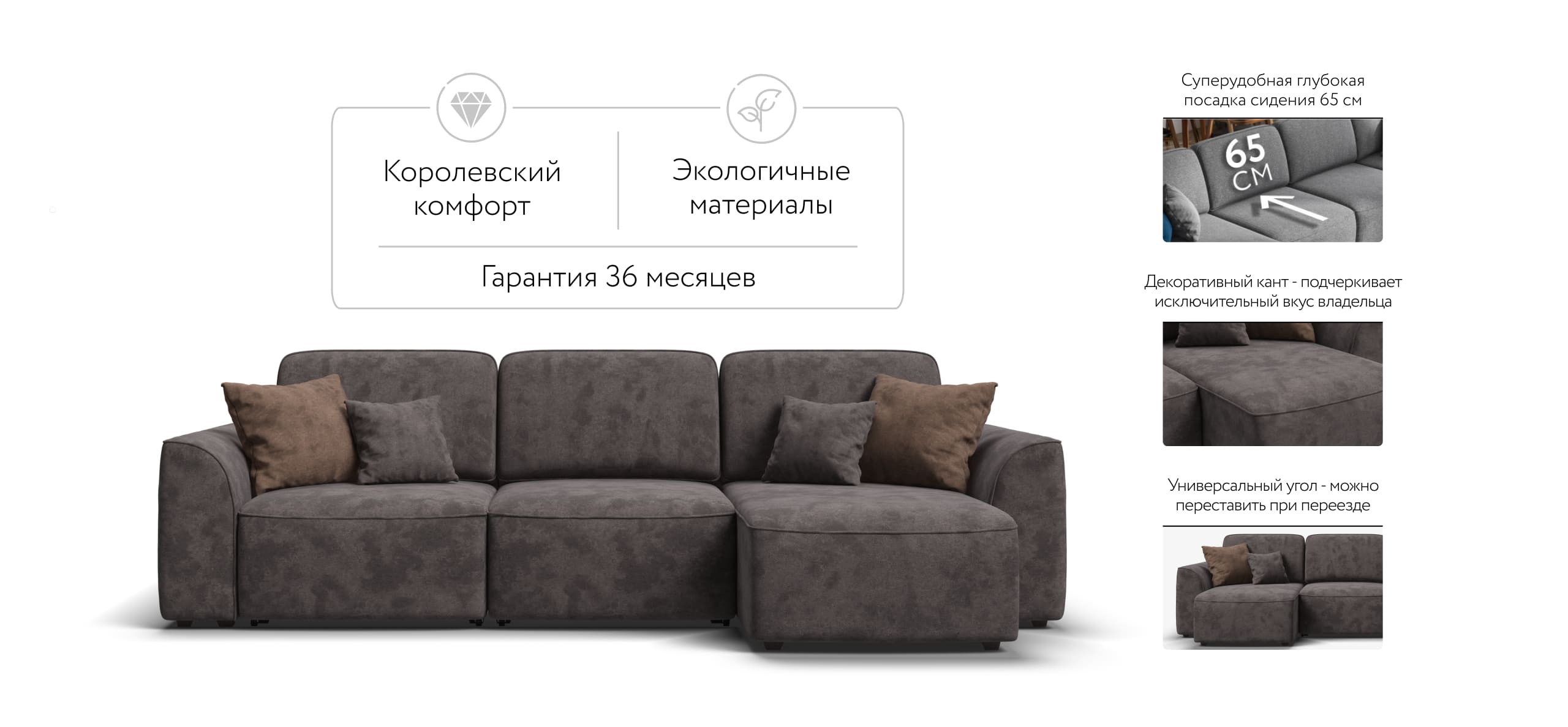 Комфортная посадка, скругленные линии, объемные подушки - диван, который наполнит ваш дом уютом и комфортом. Универсальный угол позволит Вам самостоятельно выбрать его положение при сборке, а каждое посадочное место можно выдвинуть вперед и получить П-образную форму дивана, на котором с комфортом разместится большая компания. А в разложенном виде диван превращается в комфортное спальное место.