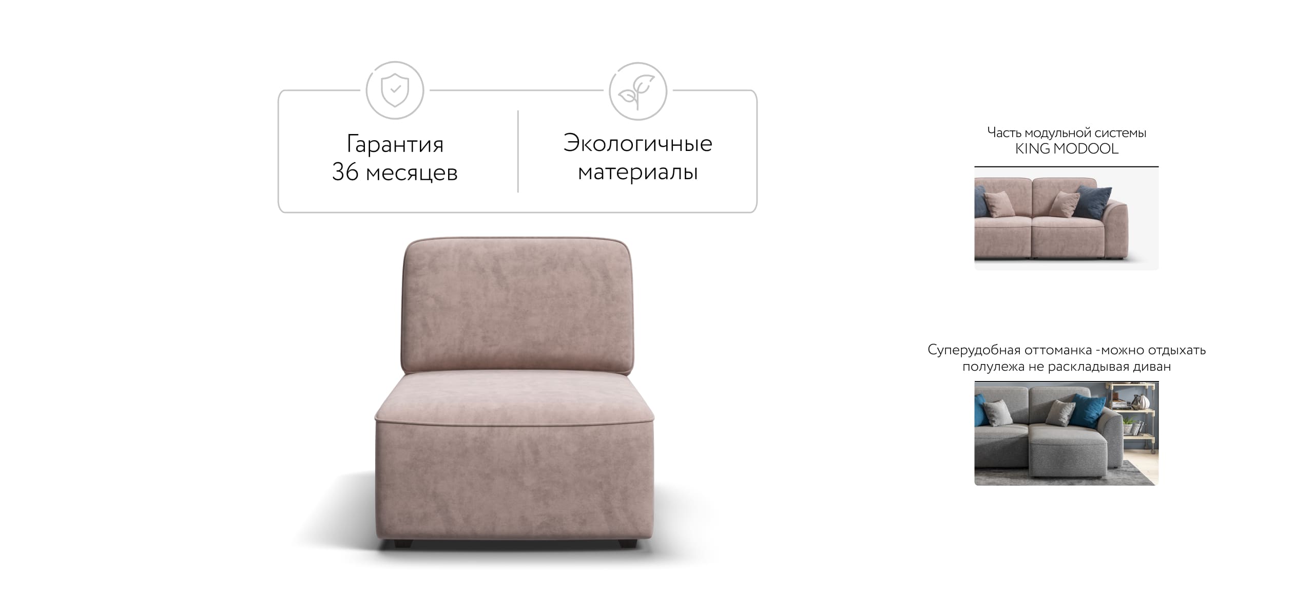 Оттоманка KING MODOOL является частью модульной системы. Оттоманка универсальная и может быть установлена с любой стороны модульной системы. Мягкие подушки из формованной пены и высокоэластичная пена ELASTIC Foam с дополнительным слоем PERIOTEK создадут максимальный комфорт во время отдыха. Благодаря глубокой посадке шезлонга 110см, можно отдыхать полулежа не раскладывая диван