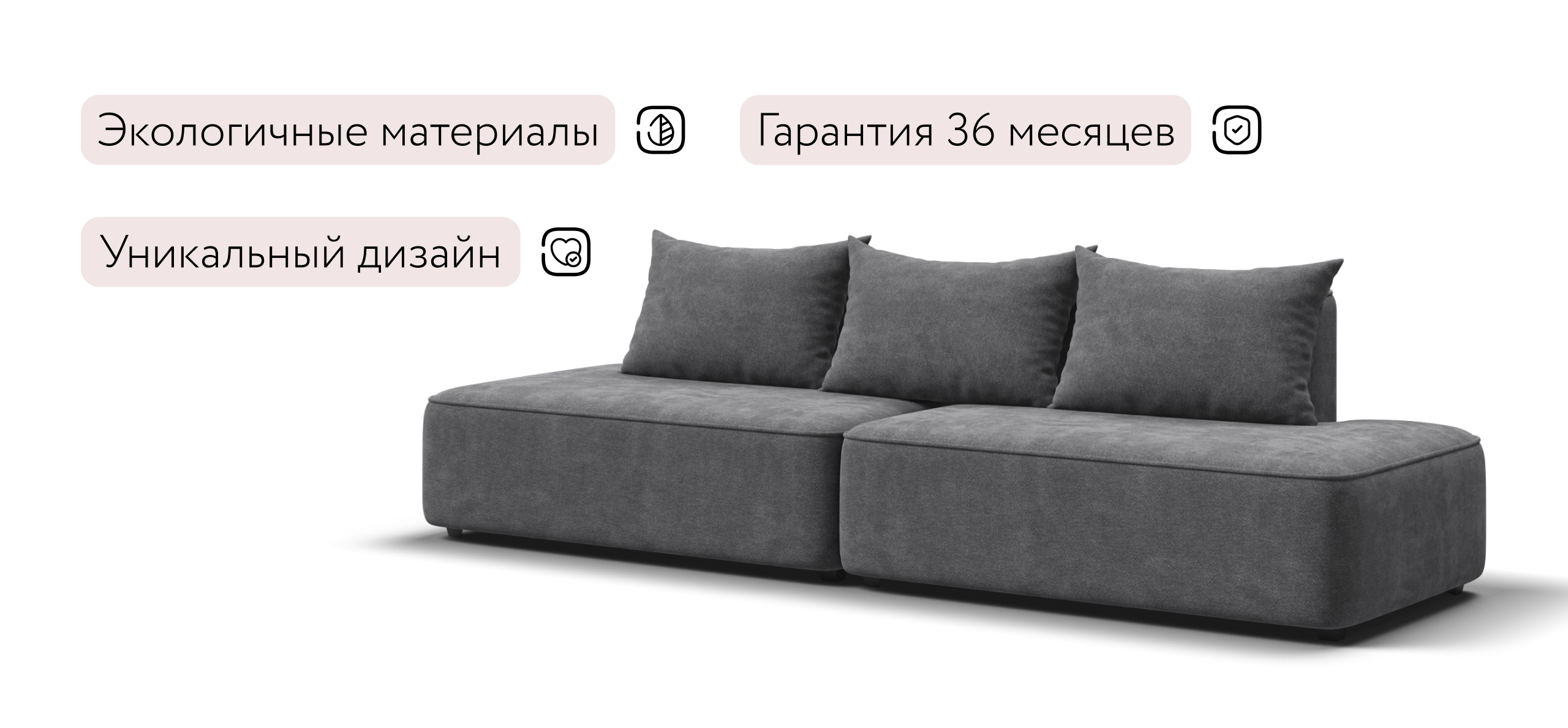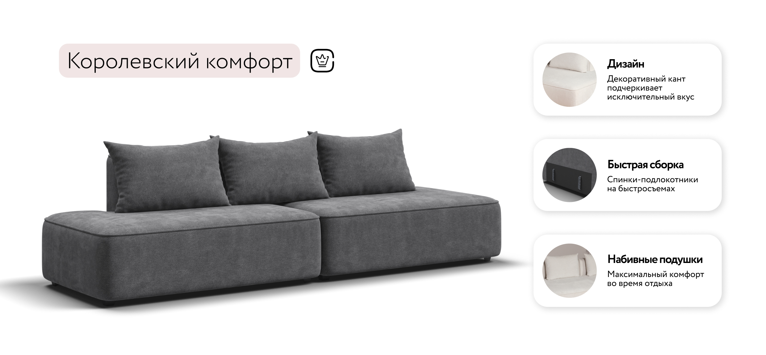 Благодаря инновационной системе креплений и быстросъёмным элементам Вы с лёгкостью можете поменять конфигурацию и адаптировать диван под новое пространство.