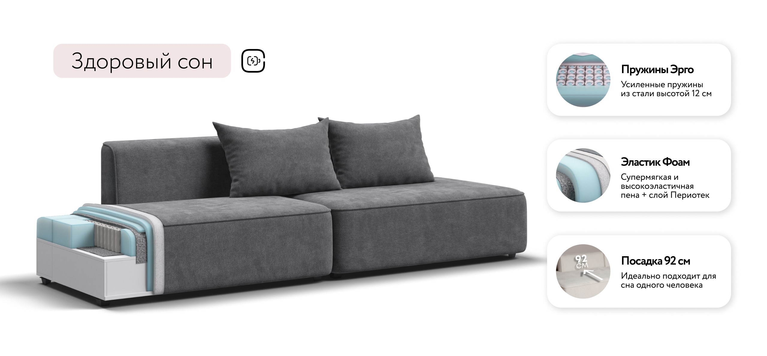Глубокое сиденье и независимые пружины в основании словно созданы для полного расслабления, а мягкие спинки обеспечивают комфорт без лишних подушек.