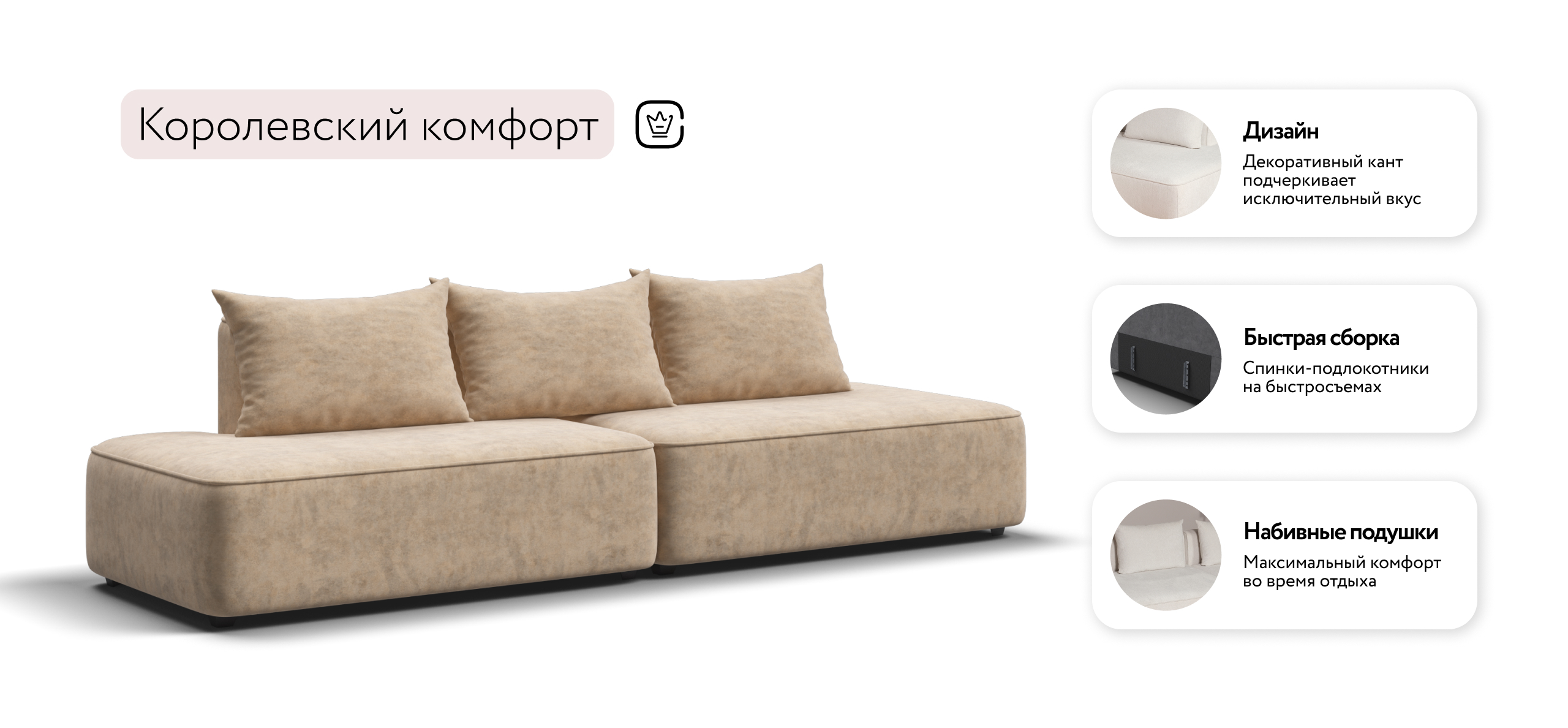 Благодаря инновационной системе креплений и быстросъёмным элементам Вы с лёгкостью можете поменять конфигурацию и адаптировать диван под новое пространство.