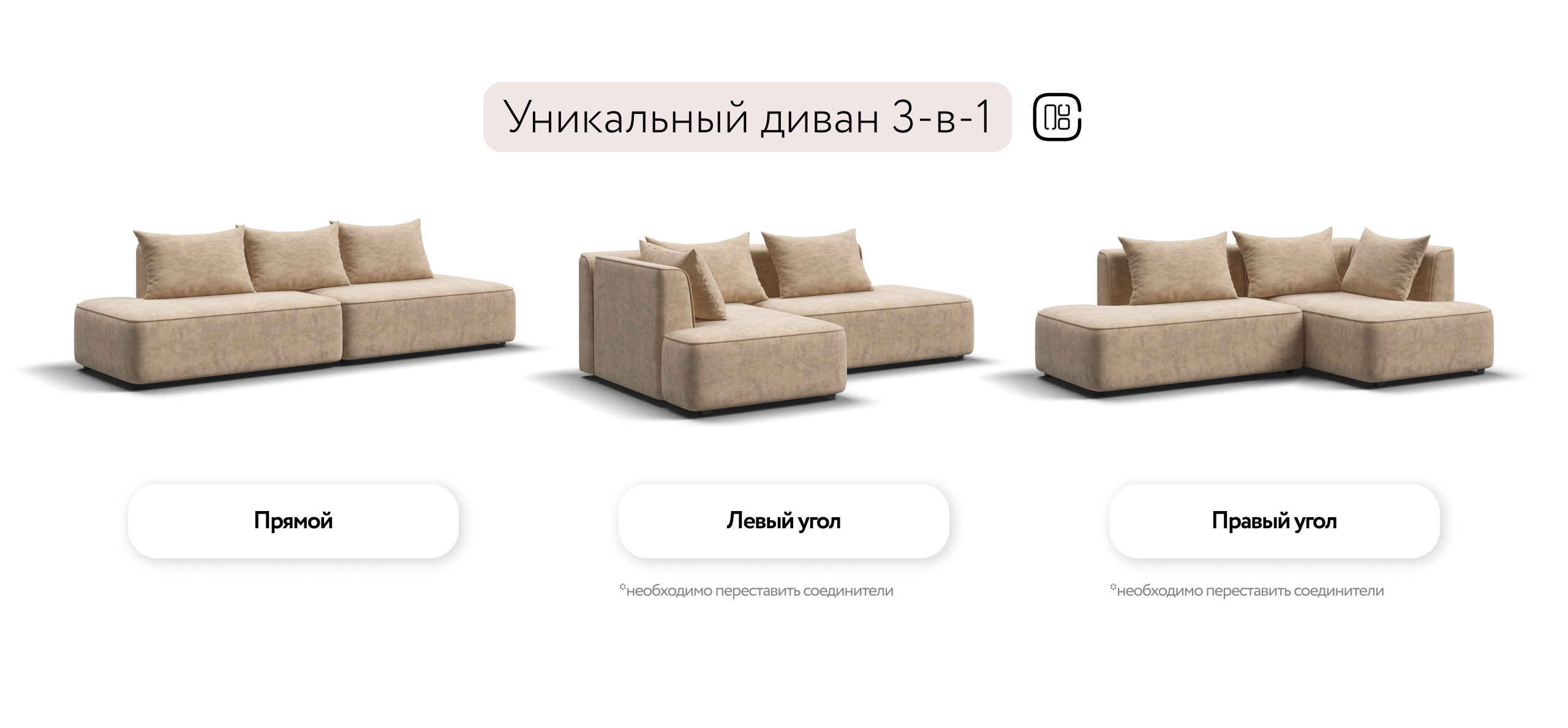 Уникальный диван 3-в-1: прямой, левый угол, правый угол