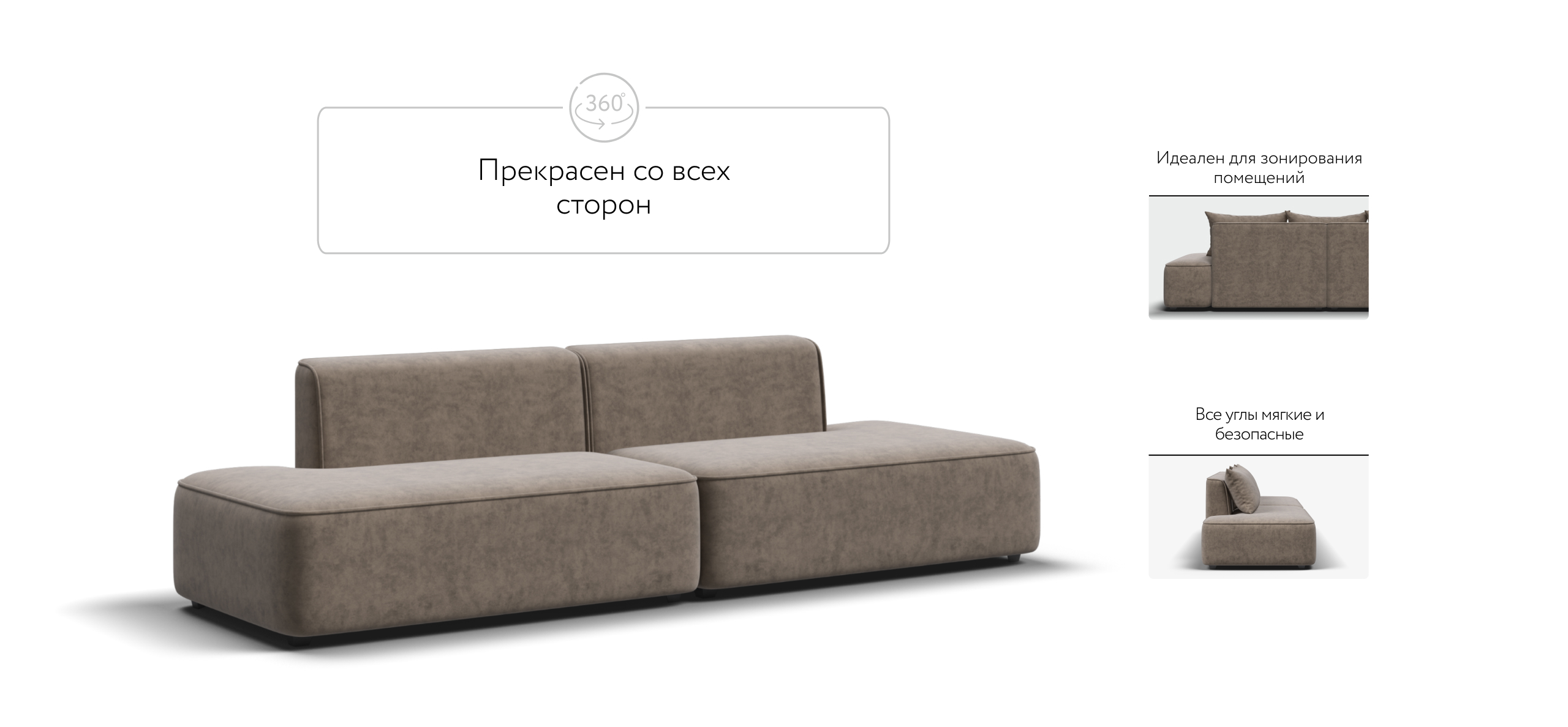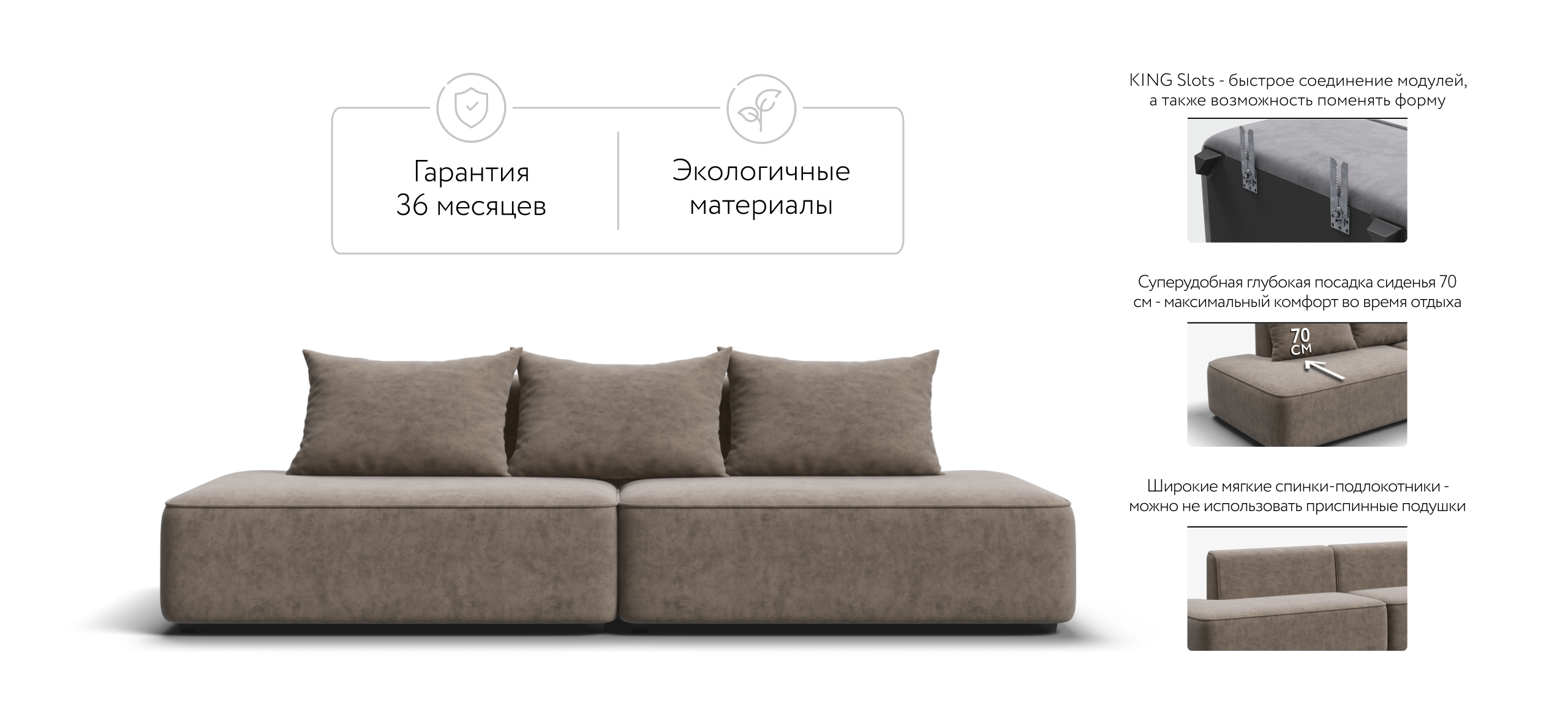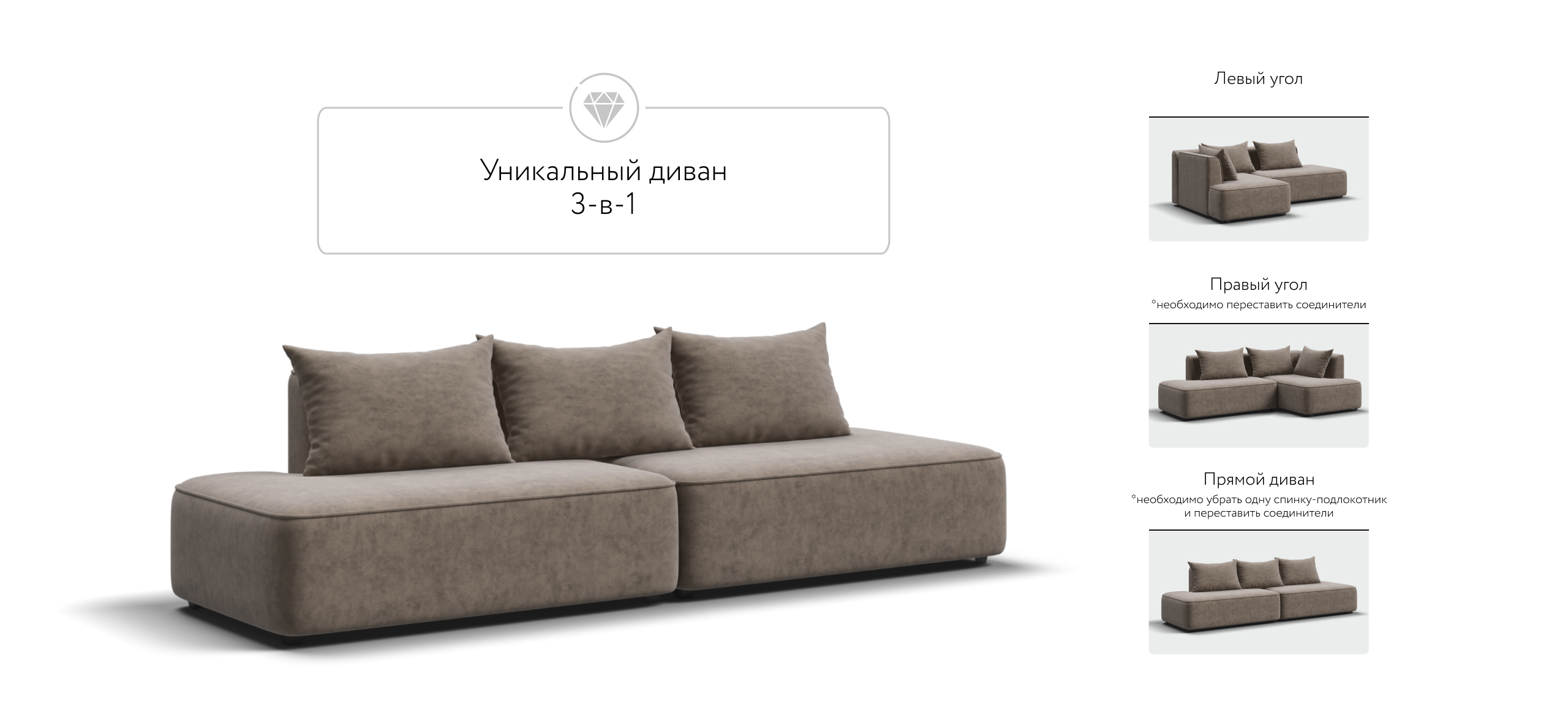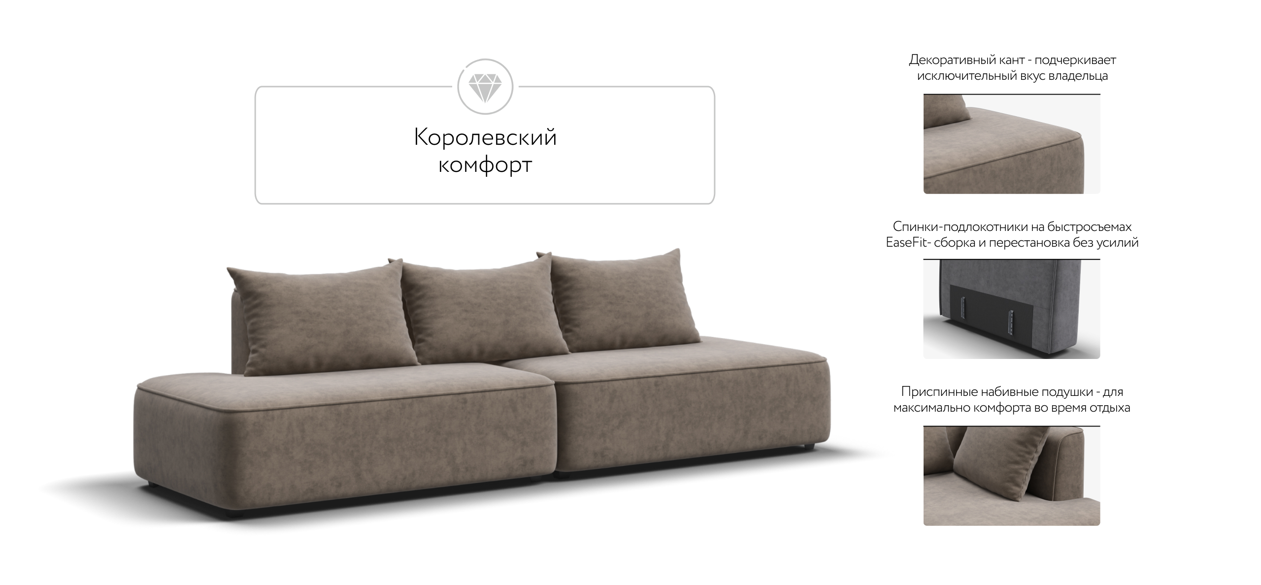 Благодаря инновационной системе креплений и быстросъёмным элементам Вы с лёгкостью можете поменять конфигурацию и адаптировать диван под новое пространство.