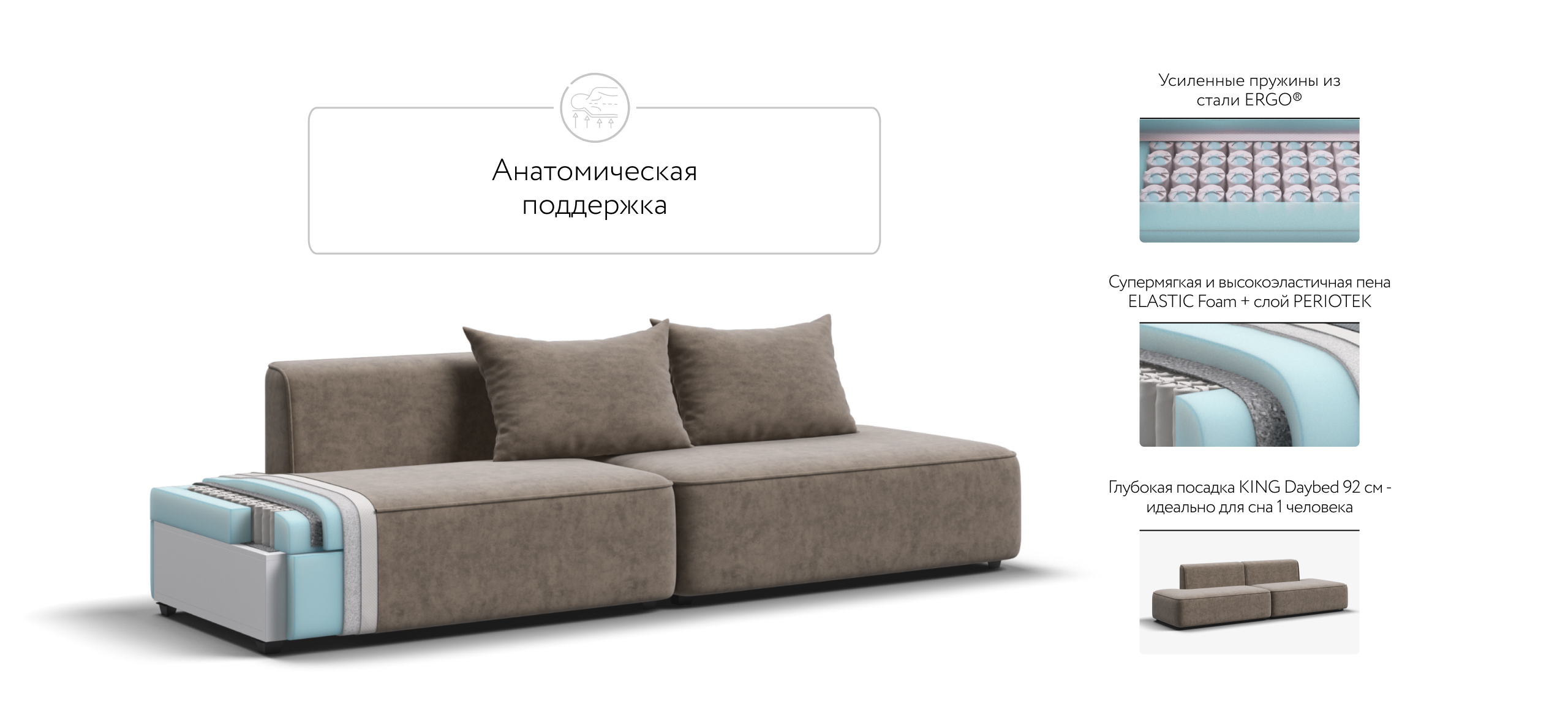 Глубокое сиденье и независимые пружины в основании словно созданы для полного расслабления, а мягкие спинки обеспечивают комфорт без лишних подушек.