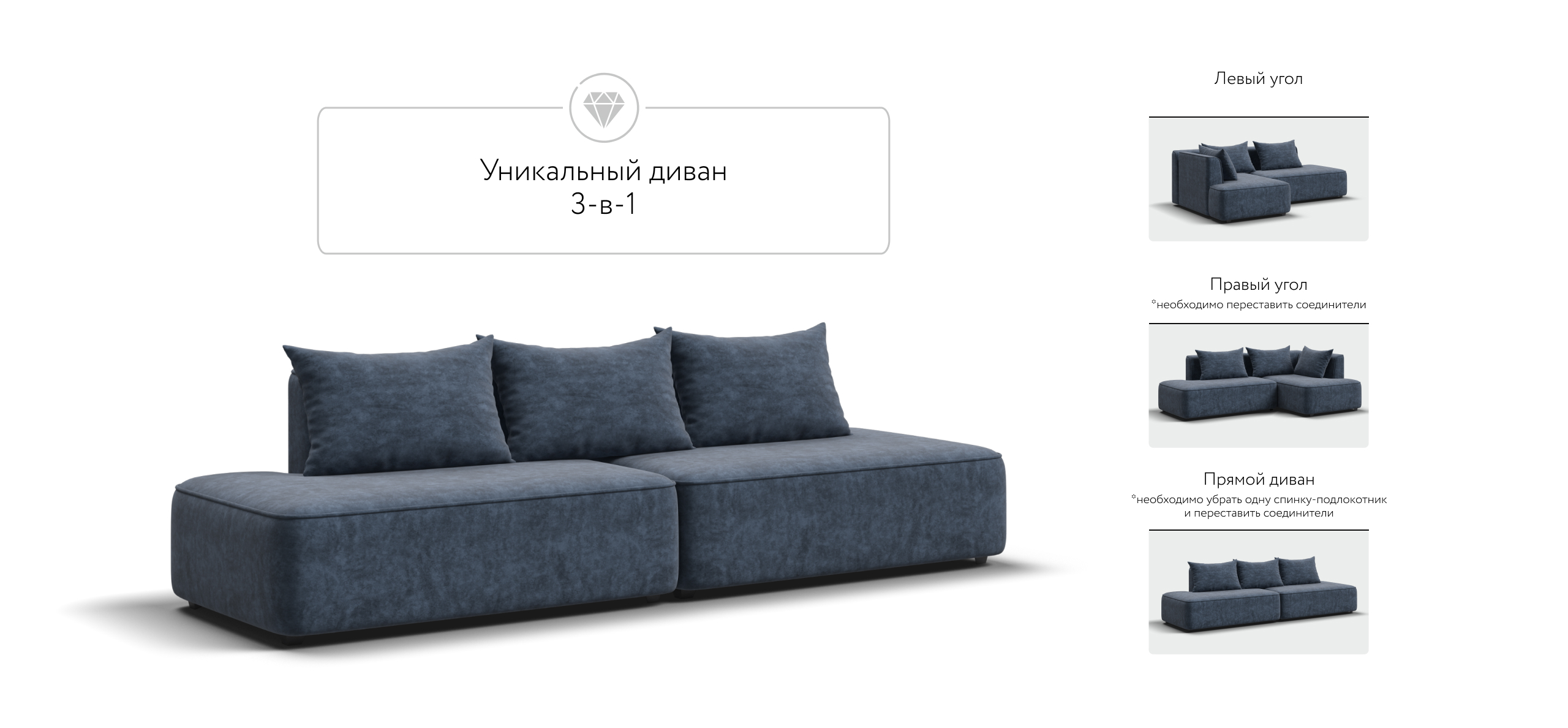 Универсальный дизайн 3-в-1 позволяет быстро менять его форму — левый угол, правый угол и прямой — всё для Вашего комфорта.