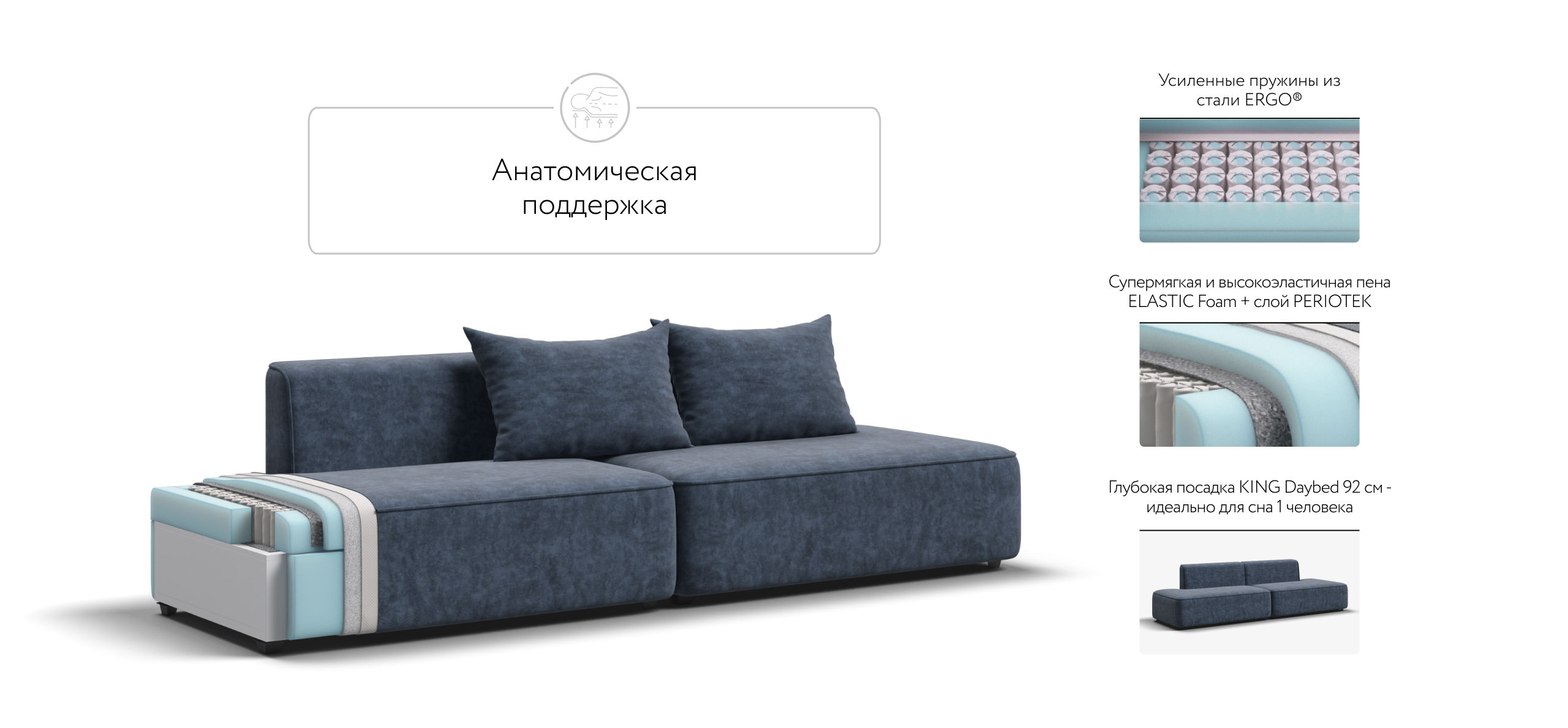 Глубокое сиденье и независимые пружины в основании словно созданы для полного расслабления, а мягкие спинки обеспечивают комфорт без лишних подушек.