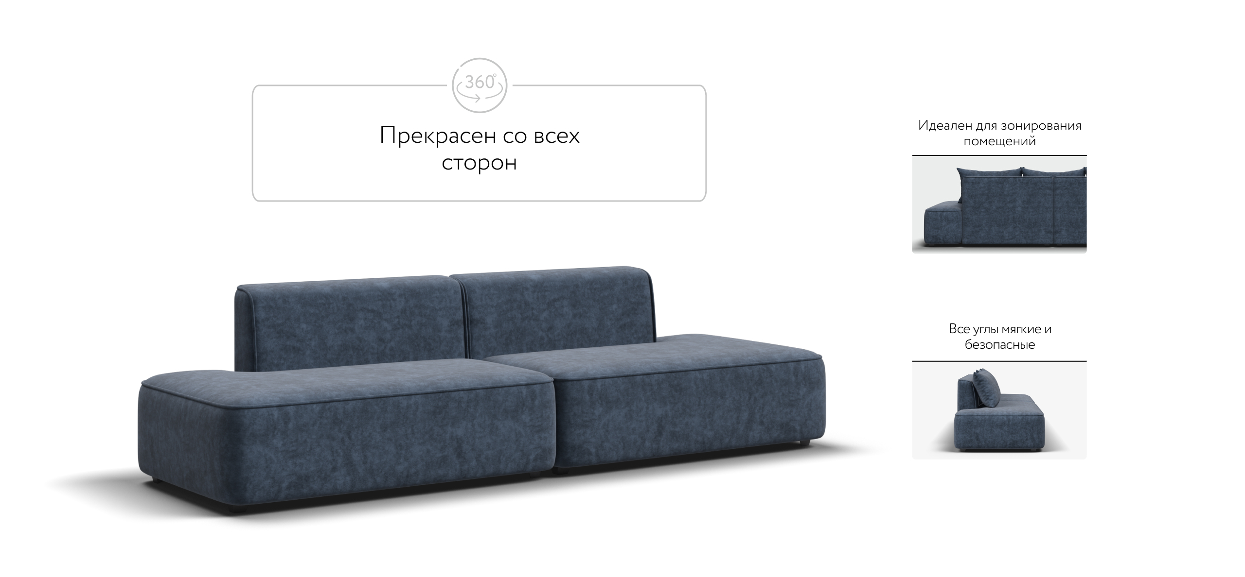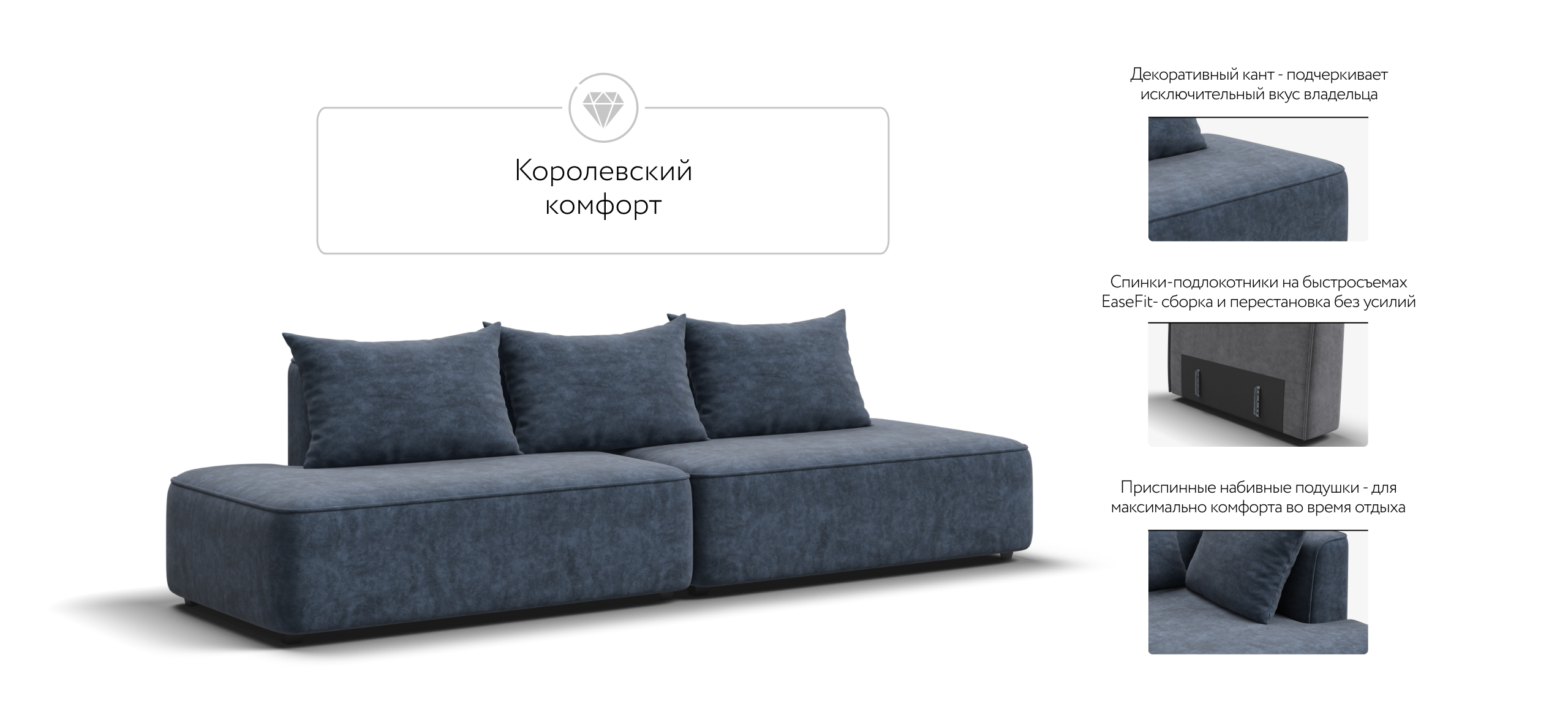 Благодаря инновационной системе креплений и быстросъёмным элементам Вы с лёгкостью можете поменять конфигурацию и адаптировать диван под новое пространство.