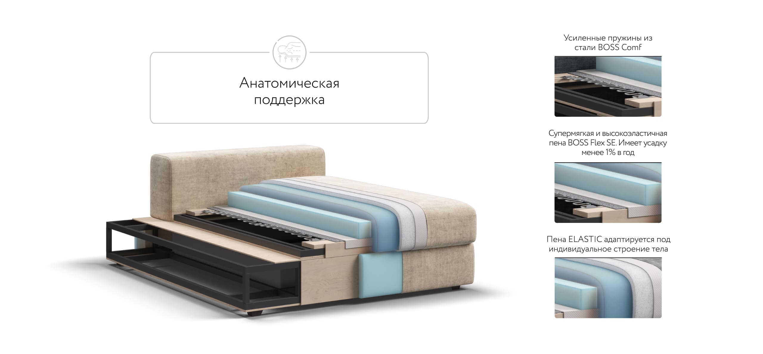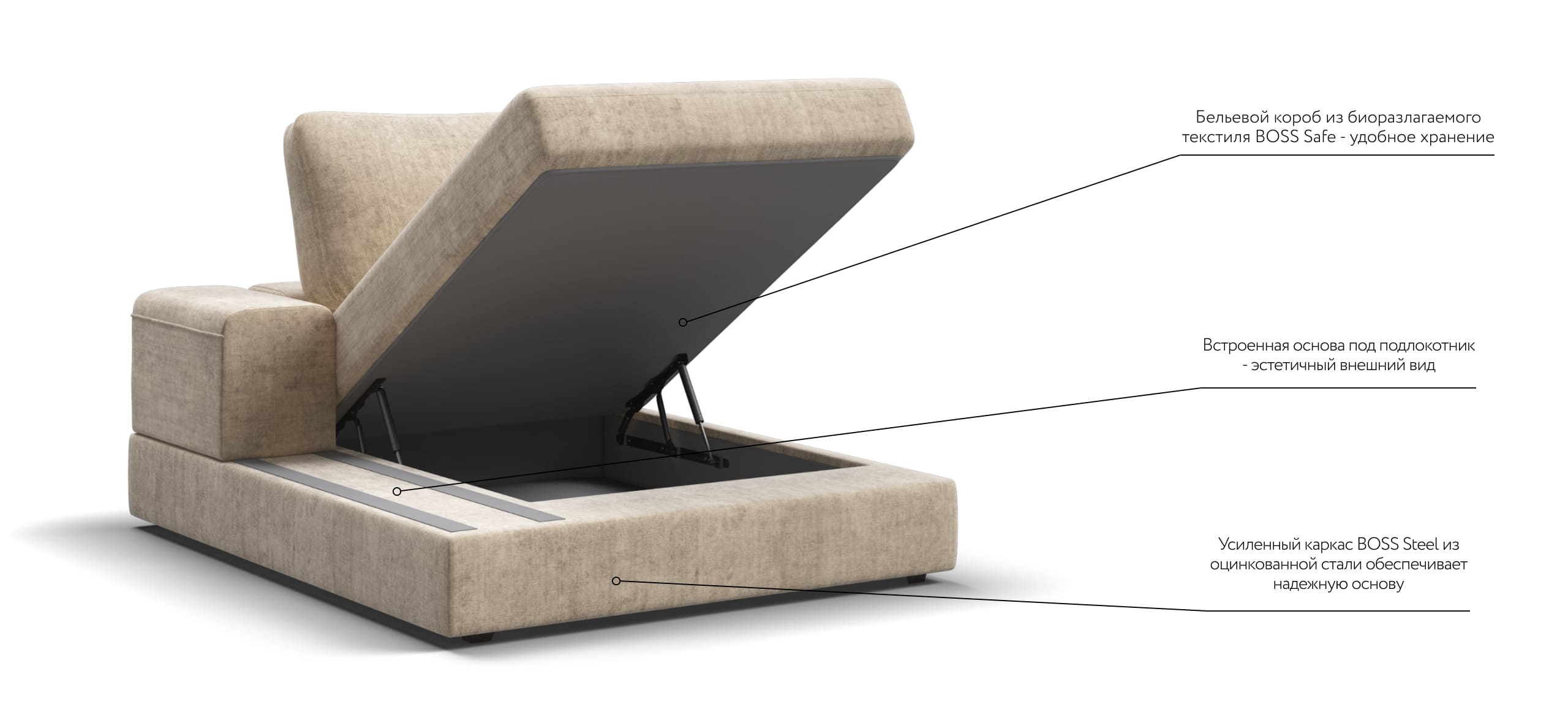 Металлический каркас обеспечивает долговечность и надежность. Диван выполнен с учетом последних требований в области экологии – не содержит ЛДСП, бельевые ящики из биоразлагаемого текстиля. Съёмные аксессуары помогут настроить необходимый вам функционал.