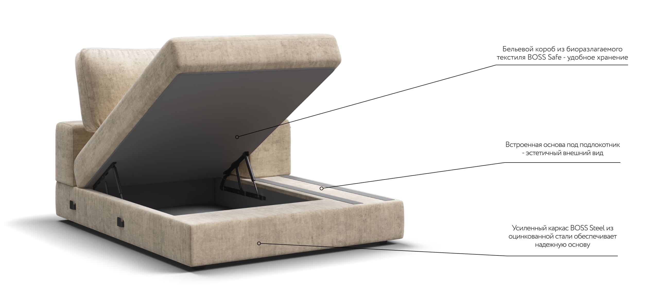 Металлический каркас обеспечивает долговечность и надежность. Диван выполнен с учетом последних требований в области экологии – не содержит ЛДСП, бельевые ящики из биоразлагаемого текстиля. Съёмные аксессуары помогут настроить необходимый вам функционал.