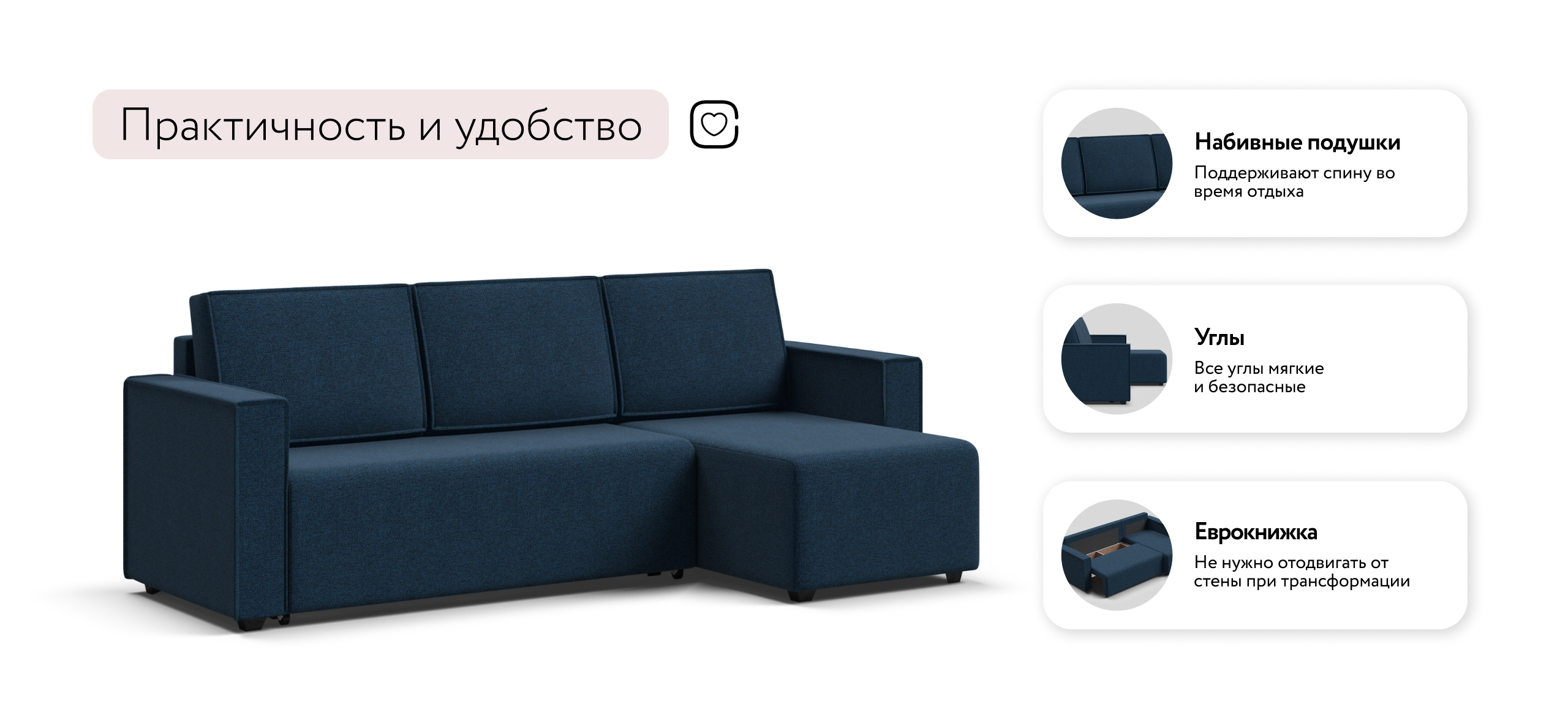 Надежный механизм еврокнижка идеален для повседневного использования, с легкостью превратит диван в полноценное комфортное спальное место, а универсальный угол - позволит создать нужный дизайн в помещении.