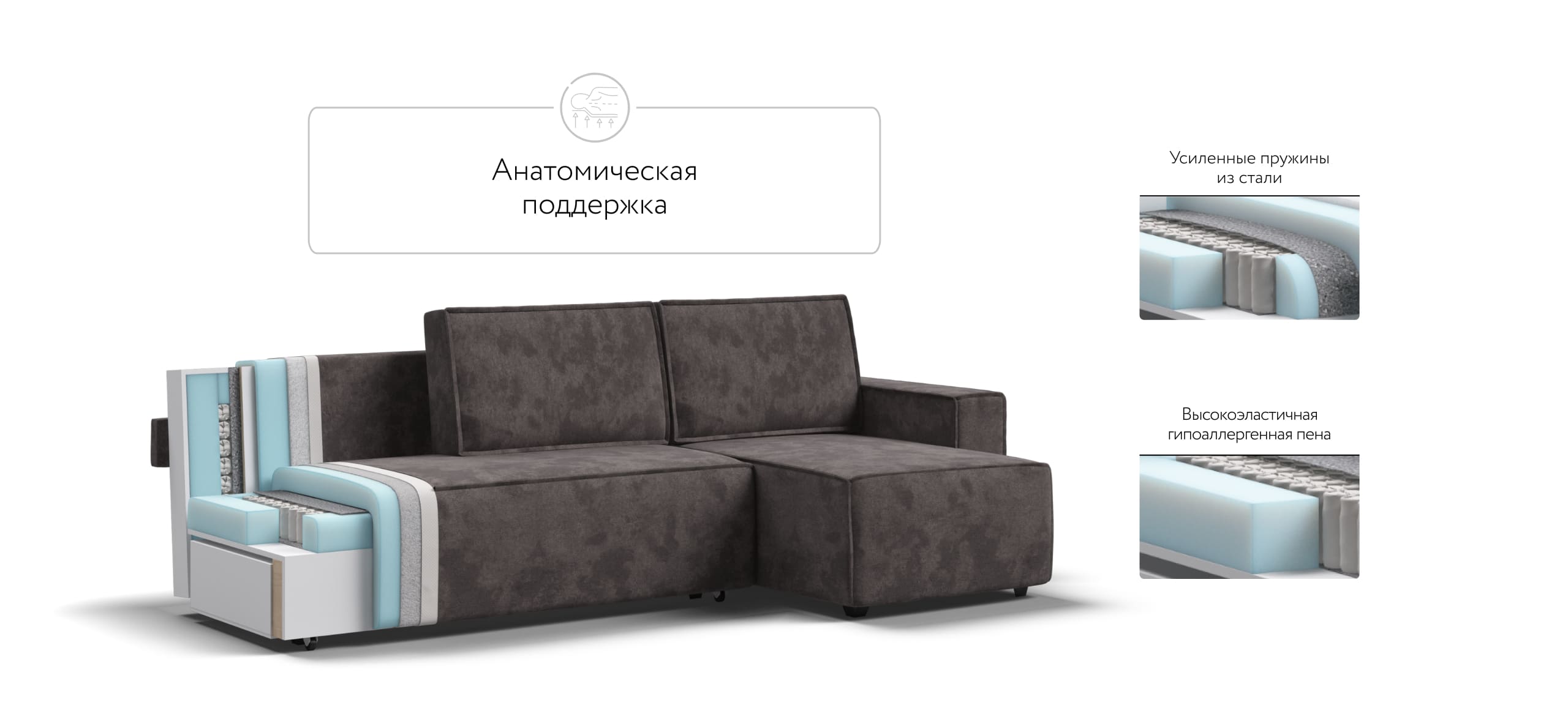 Мягкие набивные подушки, в сочетании холлофайбера и дробленой пены, поддерживают спину, приспосабливаясь под изгибы тела.
