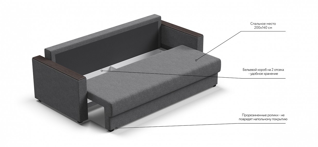 Диван имеет удобные подлокотники из МДФ, которые можно использовать в качестве столика. Элегантная прострочка на посадочной части украшает внешний вид дивана и дает возможность сохранить обивку от растяжения.