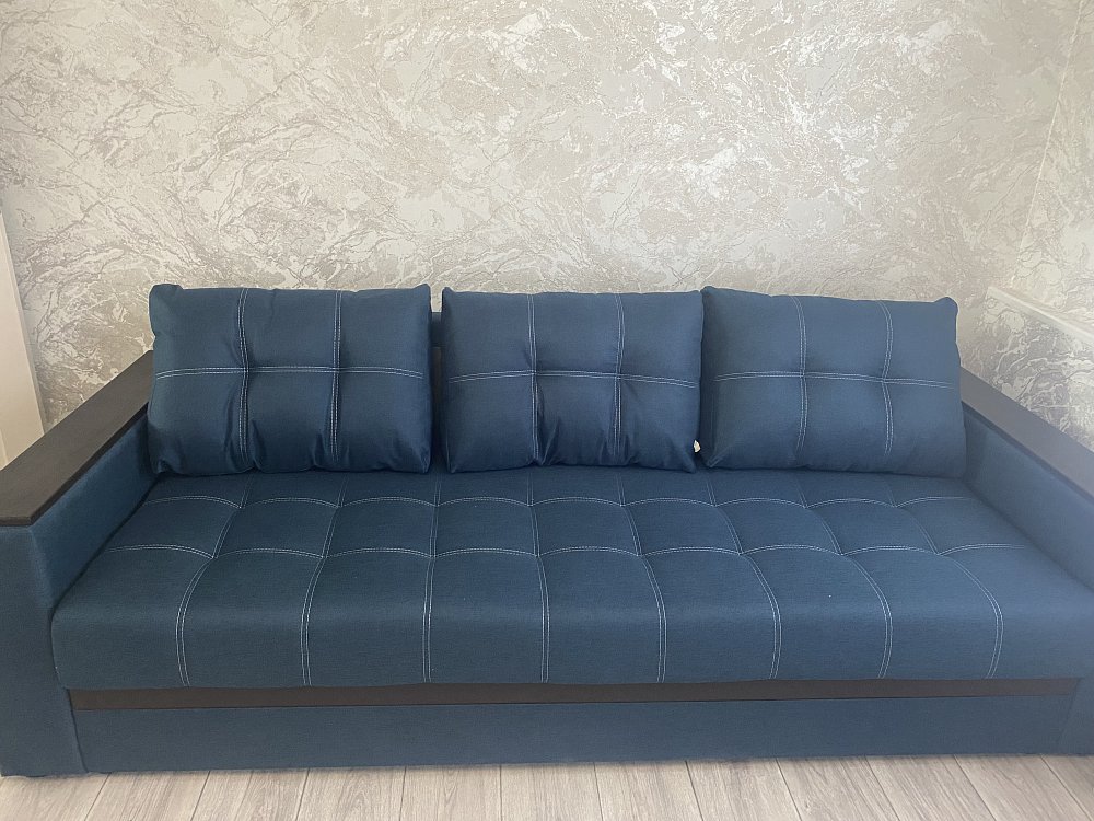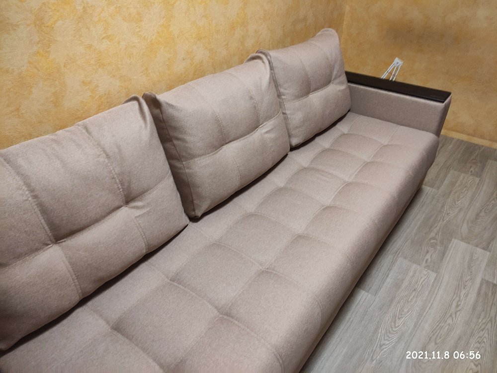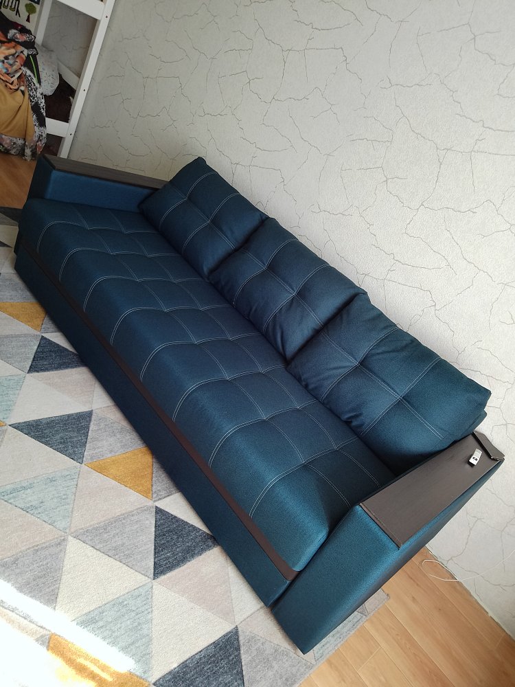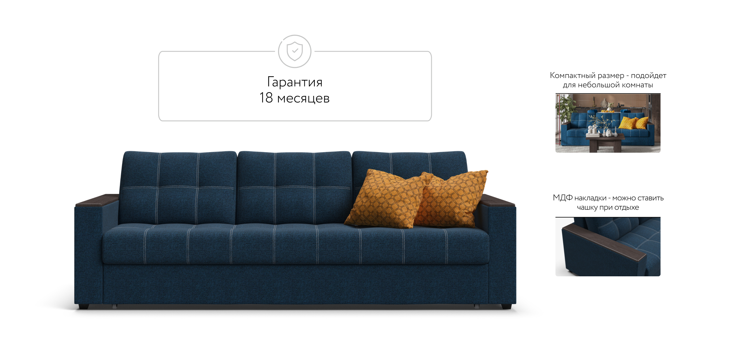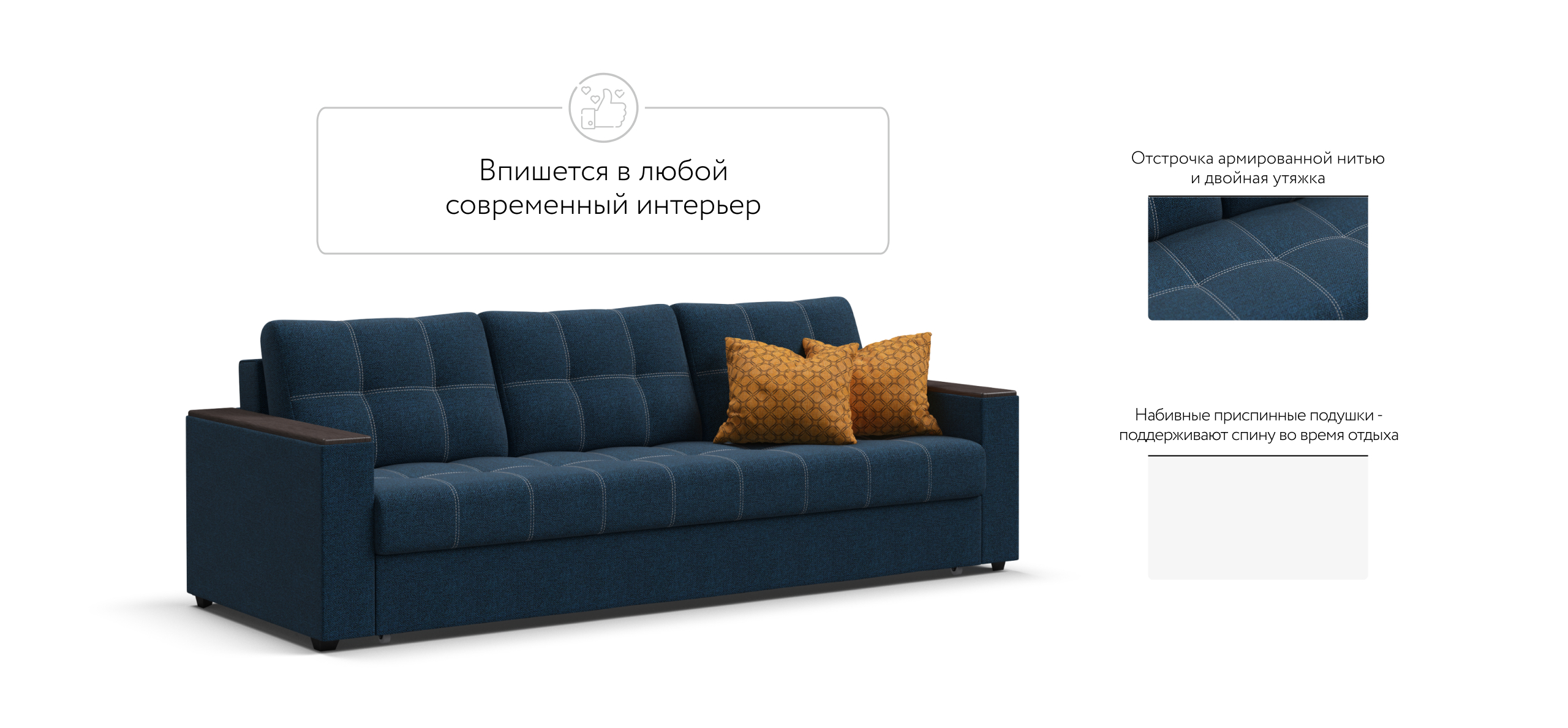 Диван имеет удобные подлокотники из МДФ, которые можно использовать в качестве столика. Элегантная прострочка на посадочной части украшает внешний вид дивана и дает возможность сохранить обивку от растяжения.