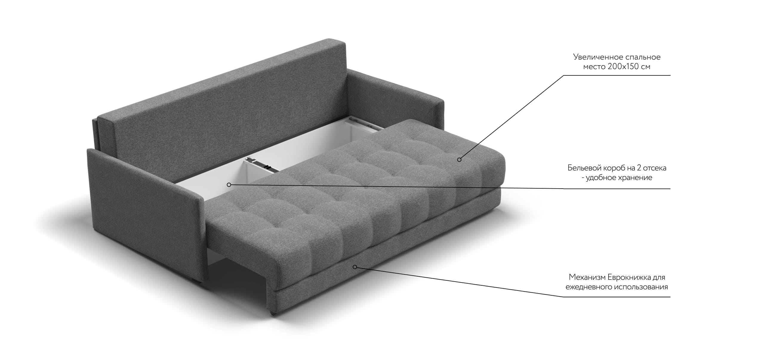 Легкая трансформация в три положения создаст для Вас максимально комфортный отдых, а улучшенное анатомическое основание в диване обеспечит Вам здоровый сон.
